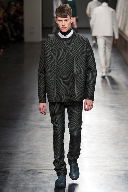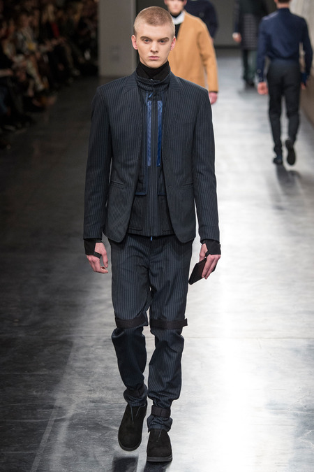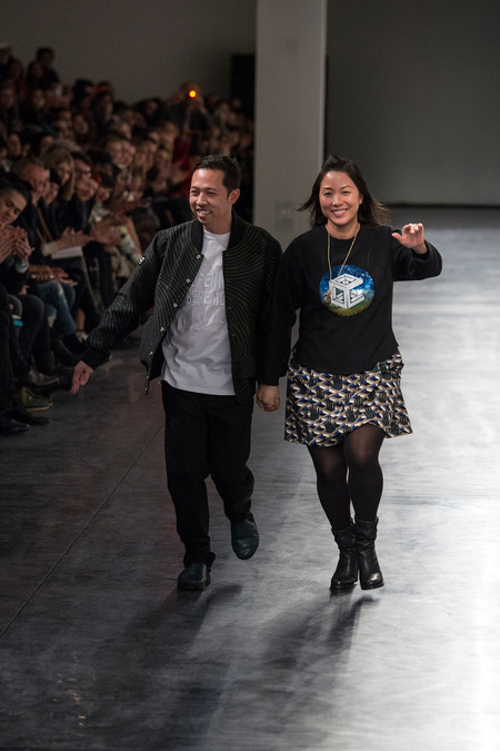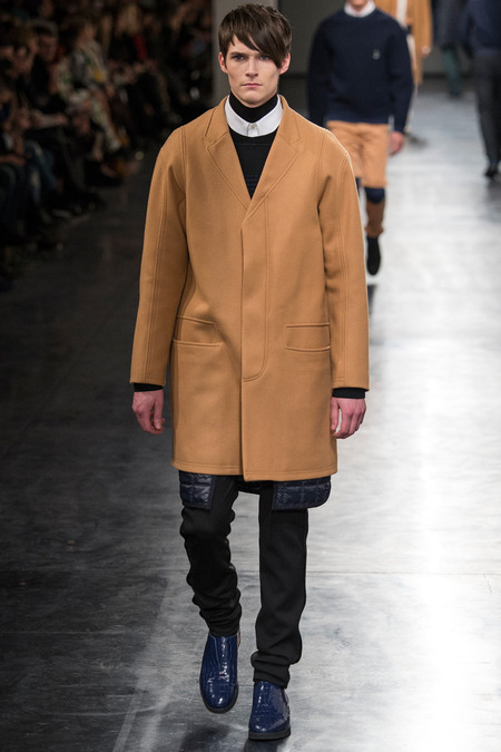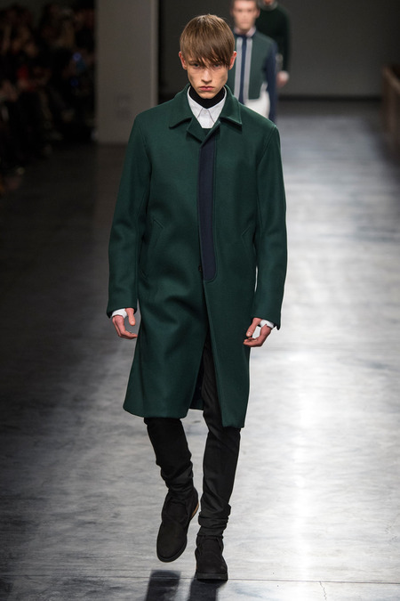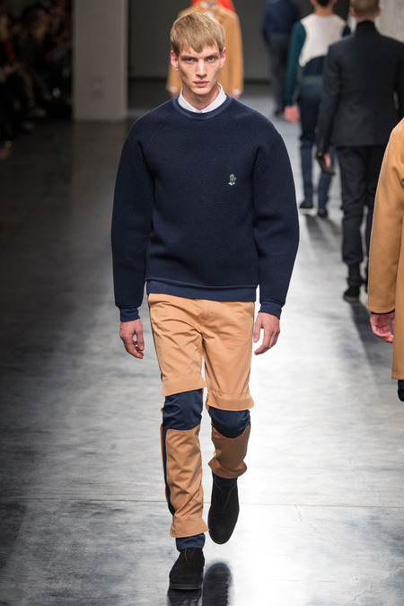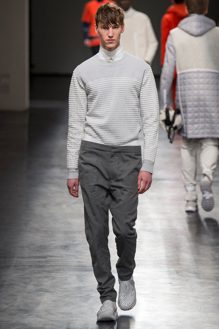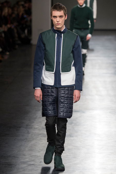 What really got your attention, though, was the graphic quality of the clothes. Obviously, Humberto Leon and Carol Lim couldn’t vibe on Antwerp without imbibing the city’s fashion history. Raf was a presence here, to be sure, but Lim and Leon mostly seemed interested in translating the linearity and sobriety of the Antwerp look into clothes with that jaunty Opening Ceremony mien. Essentially, they did this by making the clothes very, very graphic. That was elaborated in the women’s clothes by employing a lot of asymmetry; the men’s looks featured trompe l’oeil layering and zips that worked to adjust proportion and volume. Overall, this men’s collection articulated a stronger point of view than the womenswear—there was a clear silhouette proposition and a good number of very strong pieces, such as quilted anoraks. The women’s range didn’t cohere as well, not least because the emphasis on asymmetry produced too many looks that just came off looking messy. Taken together, though, these collections did affirm that Lim and Leon’s ambitions as designers continue to advance.