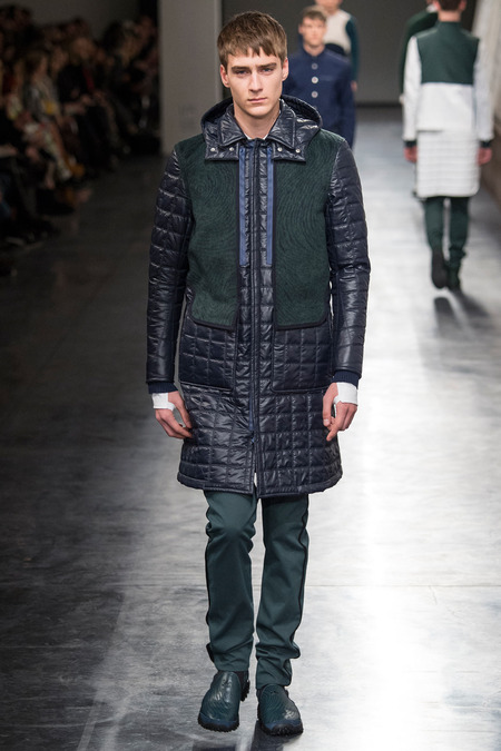 What really got your attention, though, was the graphic quality of the clothes. Obviously, Humberto Leon and Carol Lim couldn’t vibe on Antwerp without imbibing the city’s fashion history. Raf was a presence here, to be sure, but Lim and Leon mostly seemed interested in translating the linearity and sobriety of the Antwerp look into clothes with that jaunty Opening Ceremony mien. Essentially, they did this by making the clothes very, very graphic. That was elaborated in the women’s clothes by employing a lot of asymmetry; the men’s looks featured trompe l’oeil layering and zips that worked to adjust proportion and volume. Overall, this men’s collection articulated a stronger point of view than the womenswear—there was a clear silhouette proposition and a good number of very strong pieces, such as quilted anoraks. The women’s range didn’t cohere as well, not least because the emphasis on asymmetry produced too many looks that just came off looking messy. Taken together, though, these collections did affirm that Lim and Leon’s ambitions as designers continue to advance.