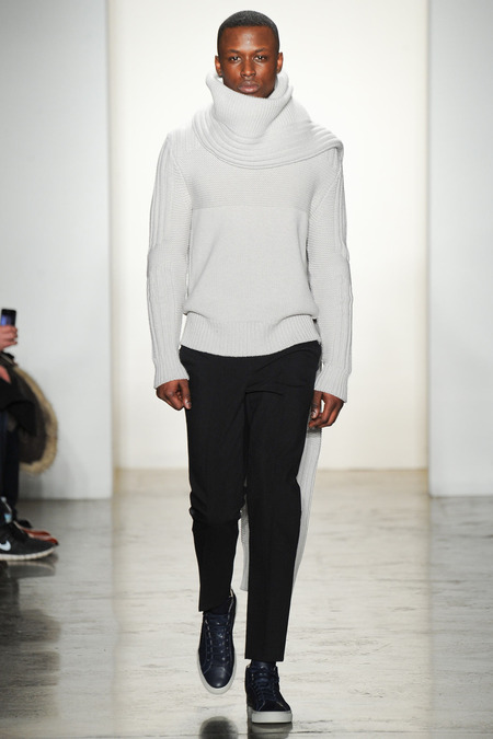 Fall’s base camp theme continued with slick jogging pants, lots of quilted nylon, and futuristic goggle glasses—a collaboration with Linda Farrow. There were also Japanese influences here, seen in samurai knit hats, kimono collars, and a playful black-and-white print that fused abstracted mountains, polka dots, and tiny hikers.