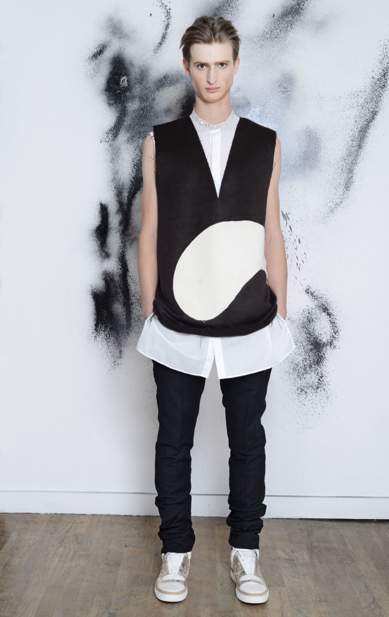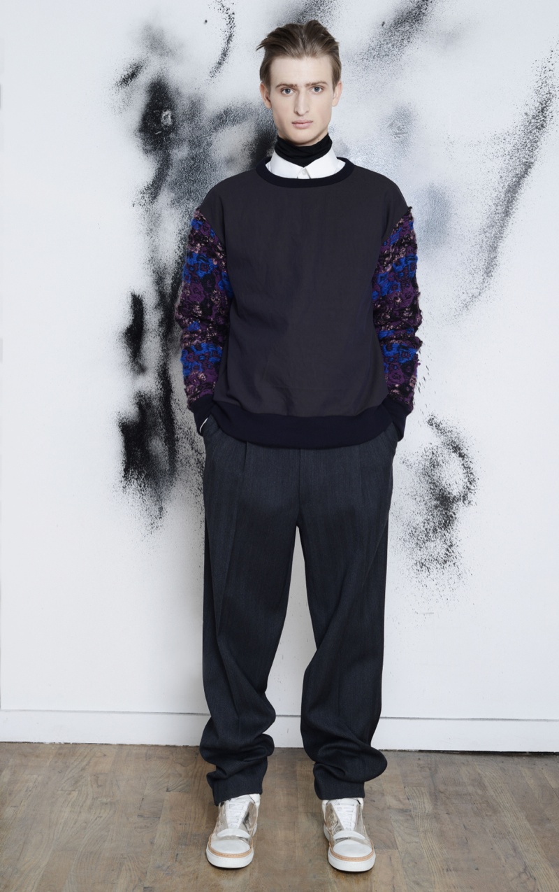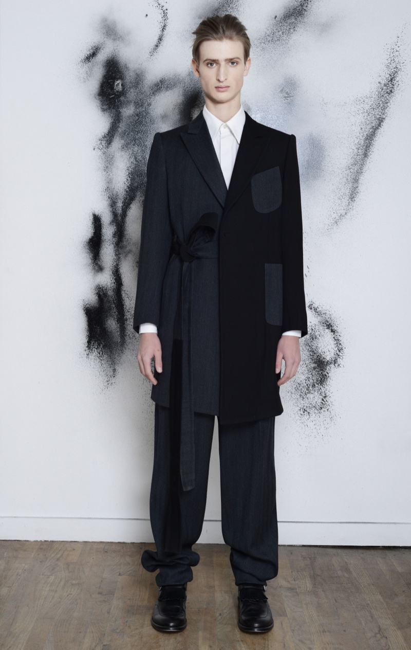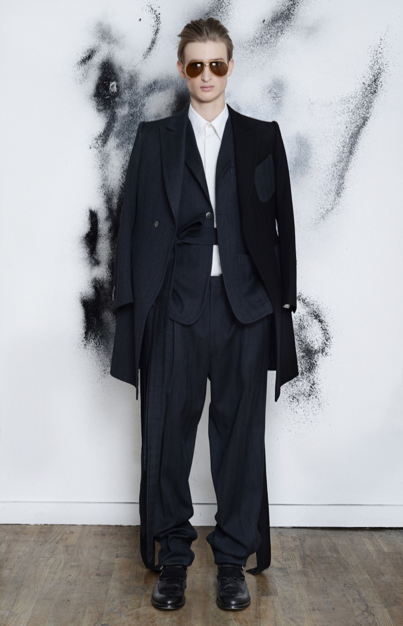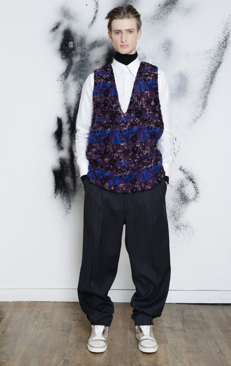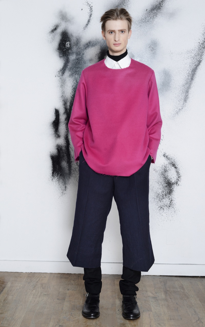 Making the return to New York Fashion Week, designer Antonio Azzuolo showed his fall/winter 2014 collection in a small presentation. Tapping model Dylan River for the accompanying look book, Azzuolo’s new collection represents a myriad of influences. Evoking a certain playfulness, diverse decades, cities and people interact for the range and its use of oversize tailoring. Here, baggy trousers intentionally cut too long are paired with jackets of varying cuts. Perhaps, the result of his work at Giuliano Fujiwara, eastern references come into play with slouchy shapes and the belting of draped jackets.