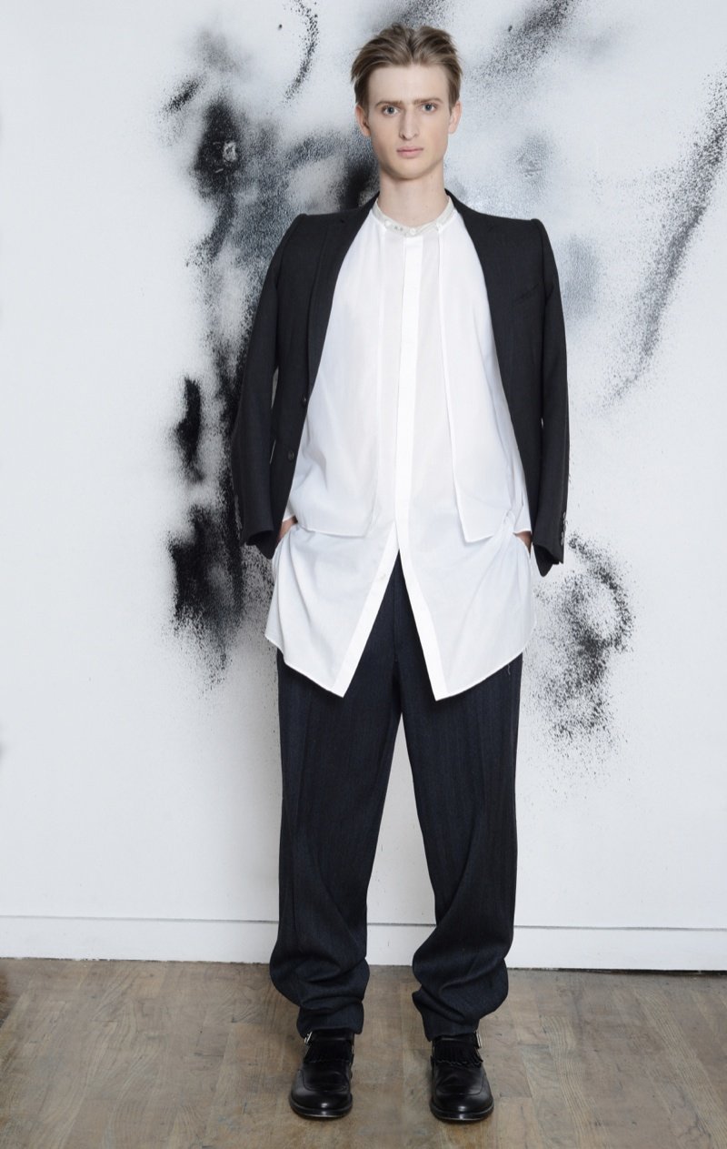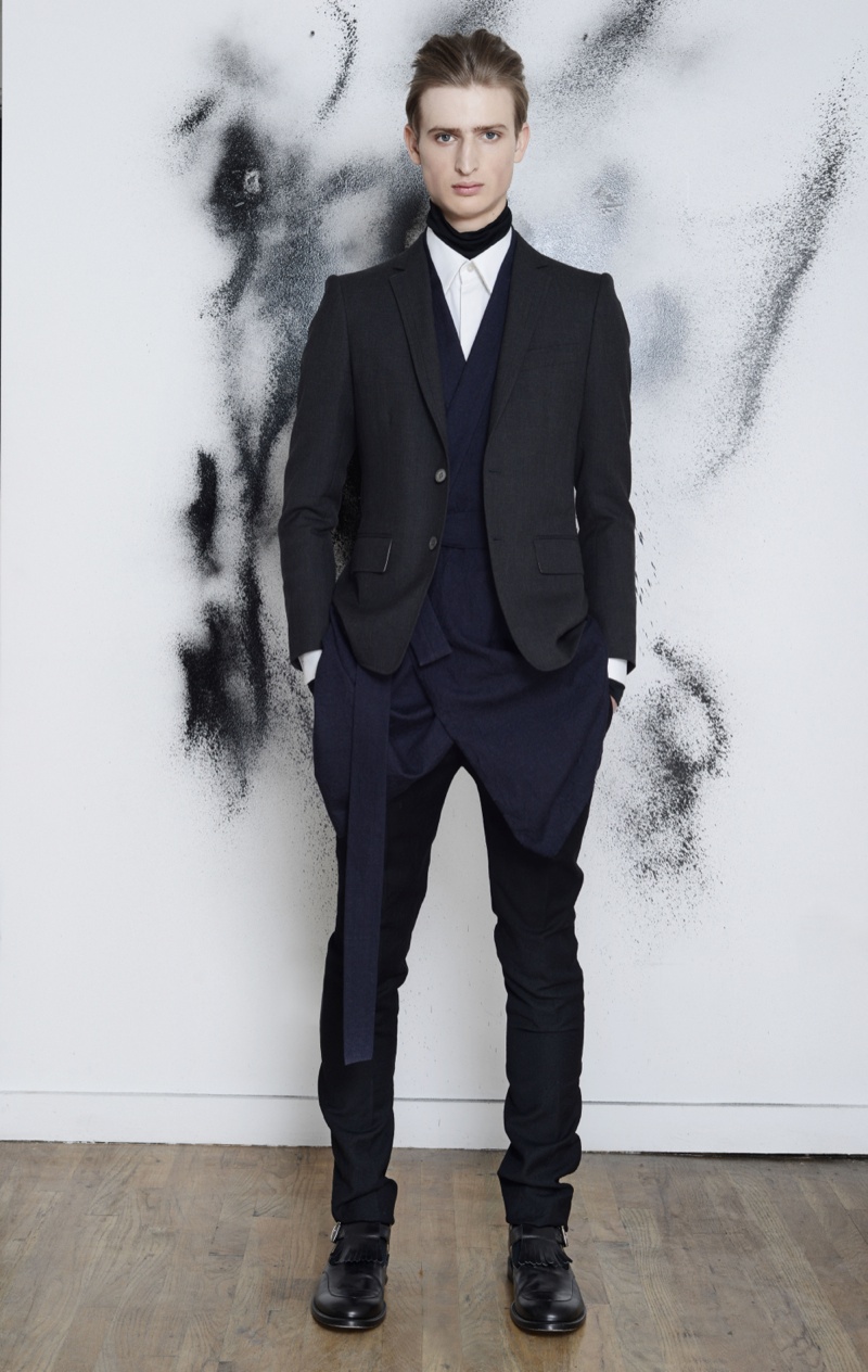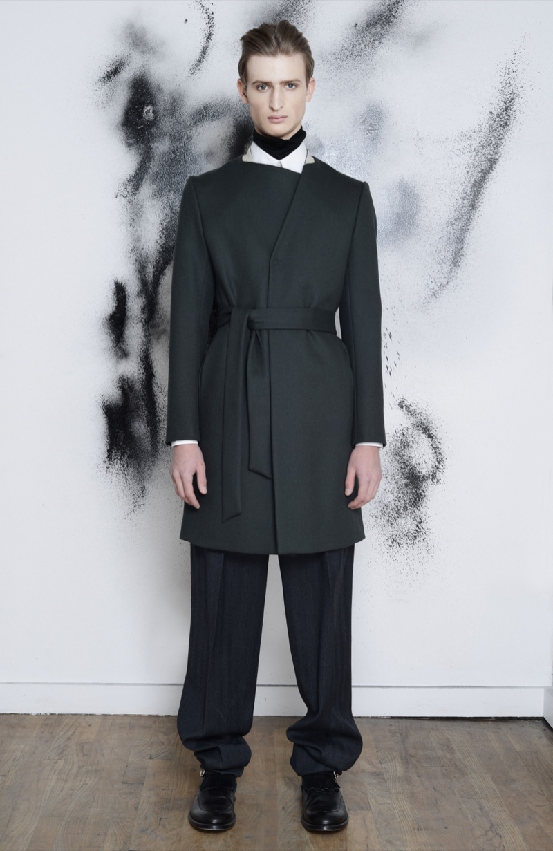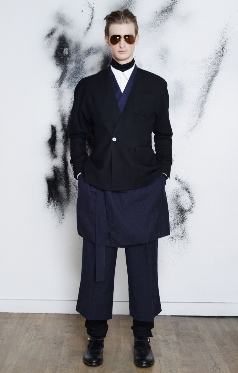 Making the return to New York Fashion Week, designer Antonio Azzuolo showed his fall/winter 2014 collection in a small presentation. Tapping model Dylan River for the accompanying look book, Azzuolo’s new collection represents a myriad of influences. Evoking a certain playfulness, diverse decades, cities and people interact for the range and its use of oversize tailoring. Here, baggy trousers intentionally cut too long are paired with jackets of varying cuts. Perhaps, the result of his work at Giuliano Fujiwara, eastern references come into play with slouchy shapes and the belting of draped jackets.