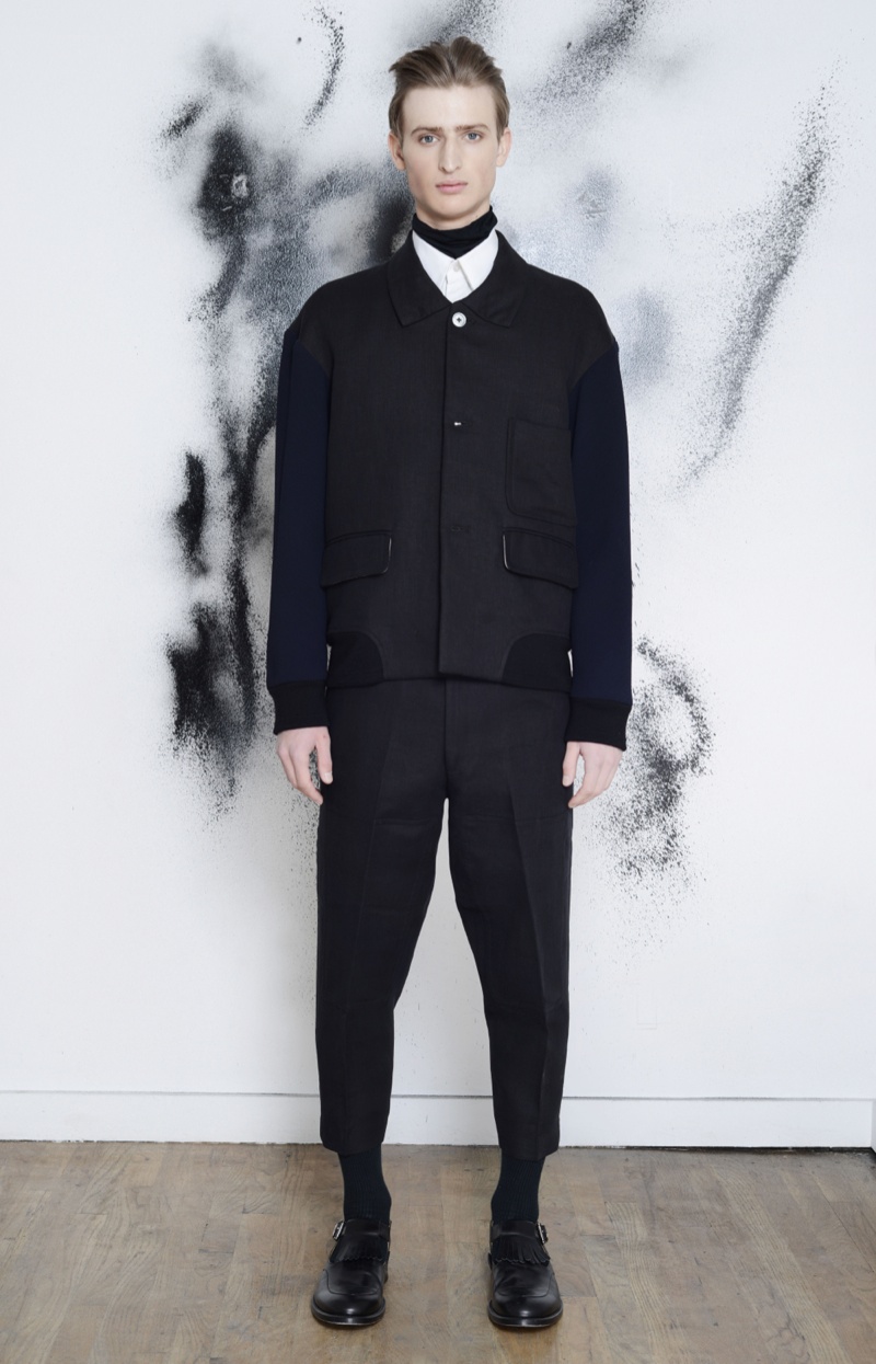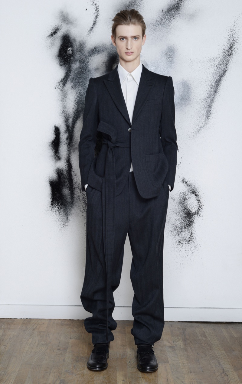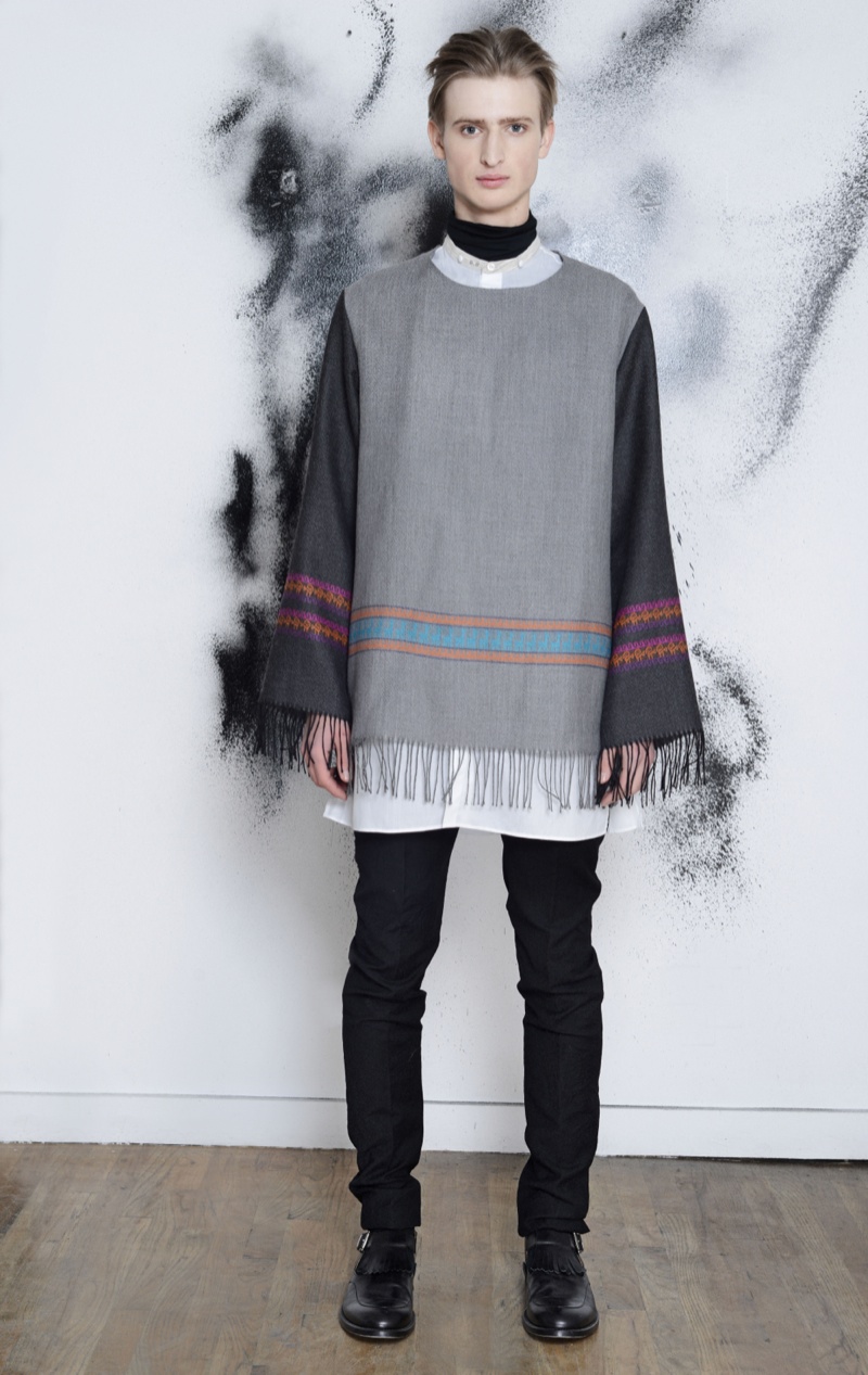 Making the return to New York Fashion Week, designer Antonio Azzuolo showed his fall/winter 2014 collection in a small presentation. Tapping model Dylan River for the accompanying look book, Azzuolo’s new collection represents a myriad of influences. Evoking a certain playfulness, diverse decades, cities and people interact for the range and its use of oversize tailoring. Here, baggy trousers intentionally cut too long are paired with jackets of varying cuts. Perhaps, the result of his work at Giuliano Fujiwara, eastern references come into play with slouchy shapes and the belting of draped jackets.