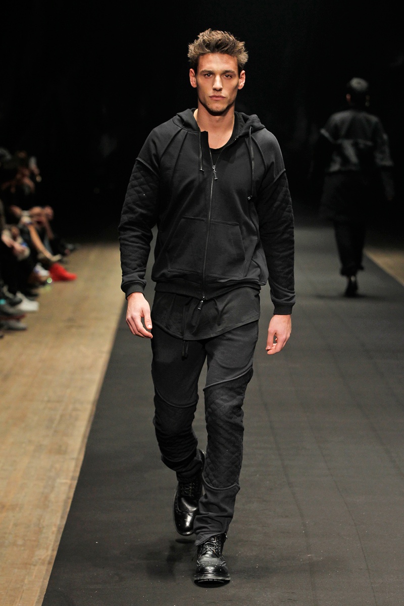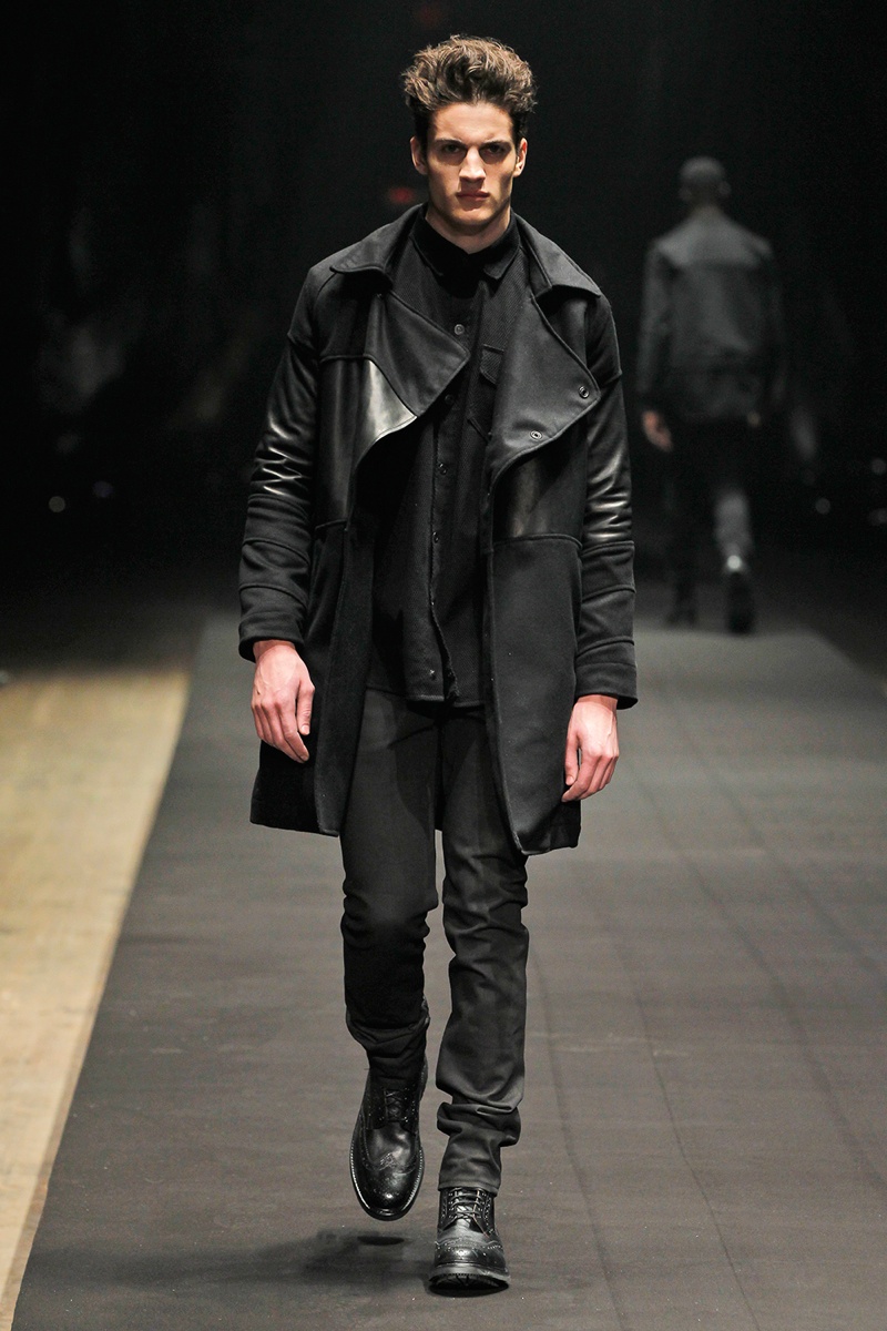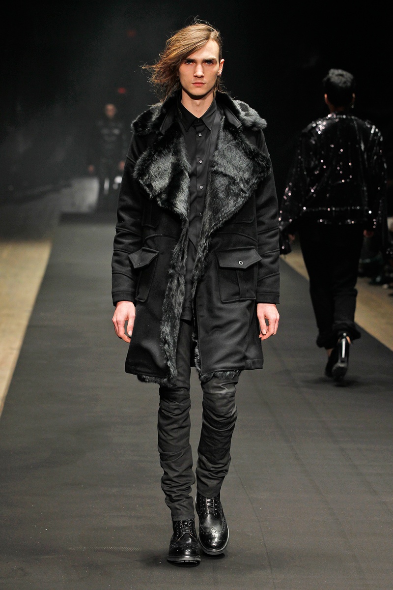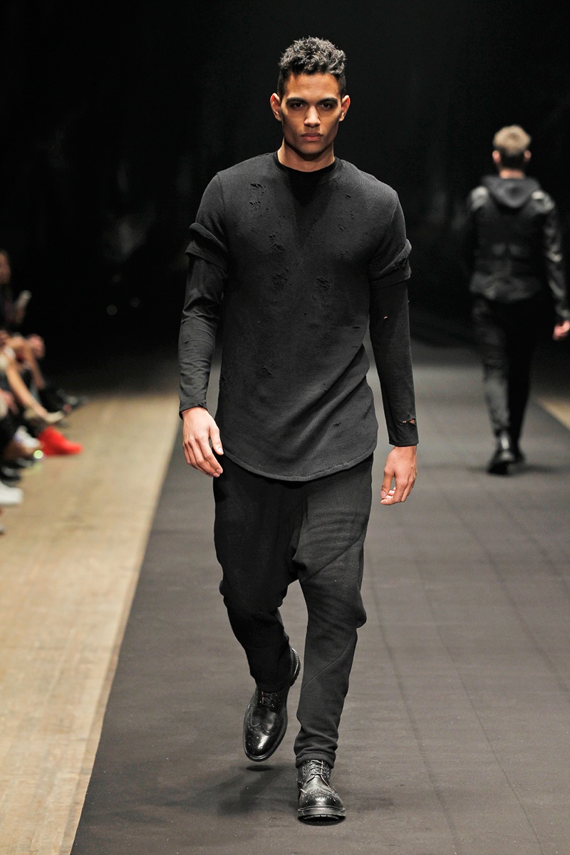 Evolving from a self-imposed monochrome minimalism togrand minimalism, young label En Noir took the New York stage to debut their fall/winter 2014 collection. En Noir designer Rob Garcia brought luxury to an on-trend urban-inspired collection with pony hair, hand-distressed leather and other luxurious materials. Clad in head to toe black, the rich fabrics came in handy, offering a mix of textures for interest in a lineup of contemporary essentials. Reinterpreted with modern silhouettes, essentials such as the hooded zipped jacket were refocused with halved sleeves or pullovers given a shrunken fit to layer nicely with the line’s elongated tops.