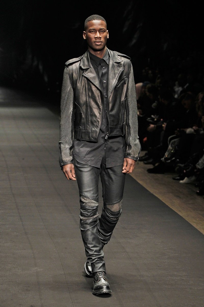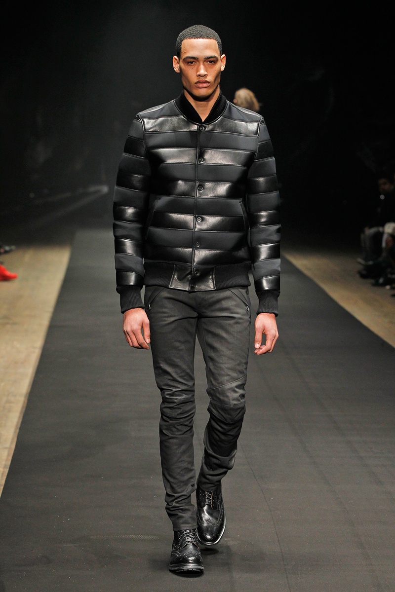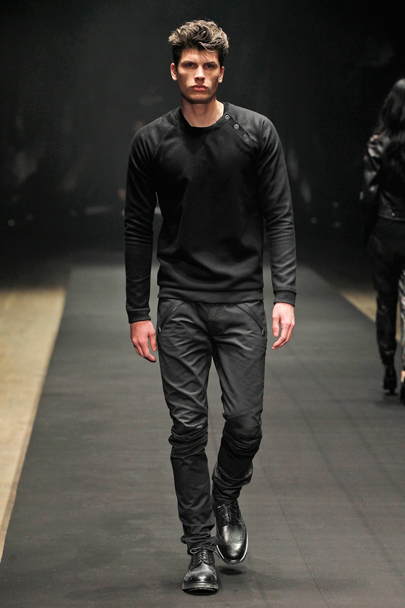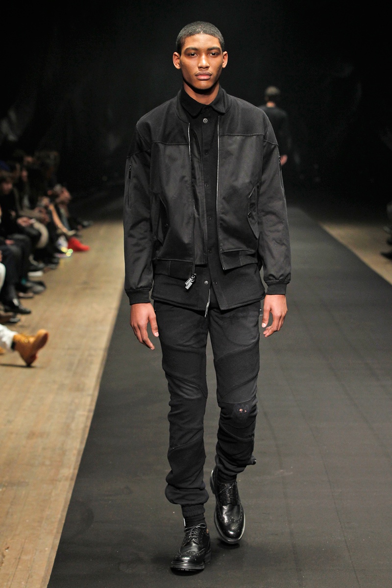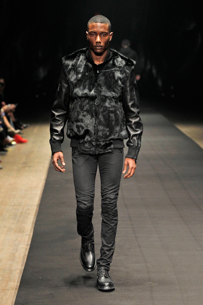 Evolving from a self-imposed monochrome minimalism togrand minimalism, young label En Noir took the New York stage to debut their fall/winter 2014 collection. En Noir designer Rob Garcia brought luxury to an on-trend urban-inspired collection with pony hair, hand-distressed leather and other luxurious materials. Clad in head to toe black, the rich fabrics came in handy, offering a mix of textures for interest in a lineup of contemporary essentials. Reinterpreted with modern silhouettes, essentials such as the hooded zipped jacket were refocused with halved sleeves or pullovers given a shrunken fit to layer nicely with the line’s elongated tops.
