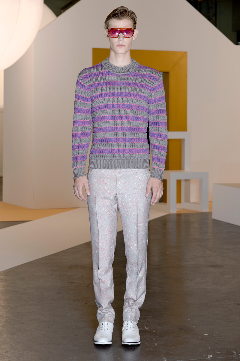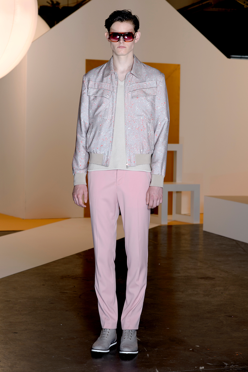 Designer Jonathan Saunders makes a graphic statement for spring/summer 2015. Unveiling his new collection via a presentation duringLondon Collections: Men, Saunders played bright colors against muted alternatives, crafting a wardrobe of long boxy silhouettes for the contemporary perspective. Large horizontal bars of complementary colors dressed coats while a smaller version added trim to lightweight knitwear. Meanwhile flared shorts were decorated in metallic prints and coordinated with shirts of the same standard for a splashy outing.