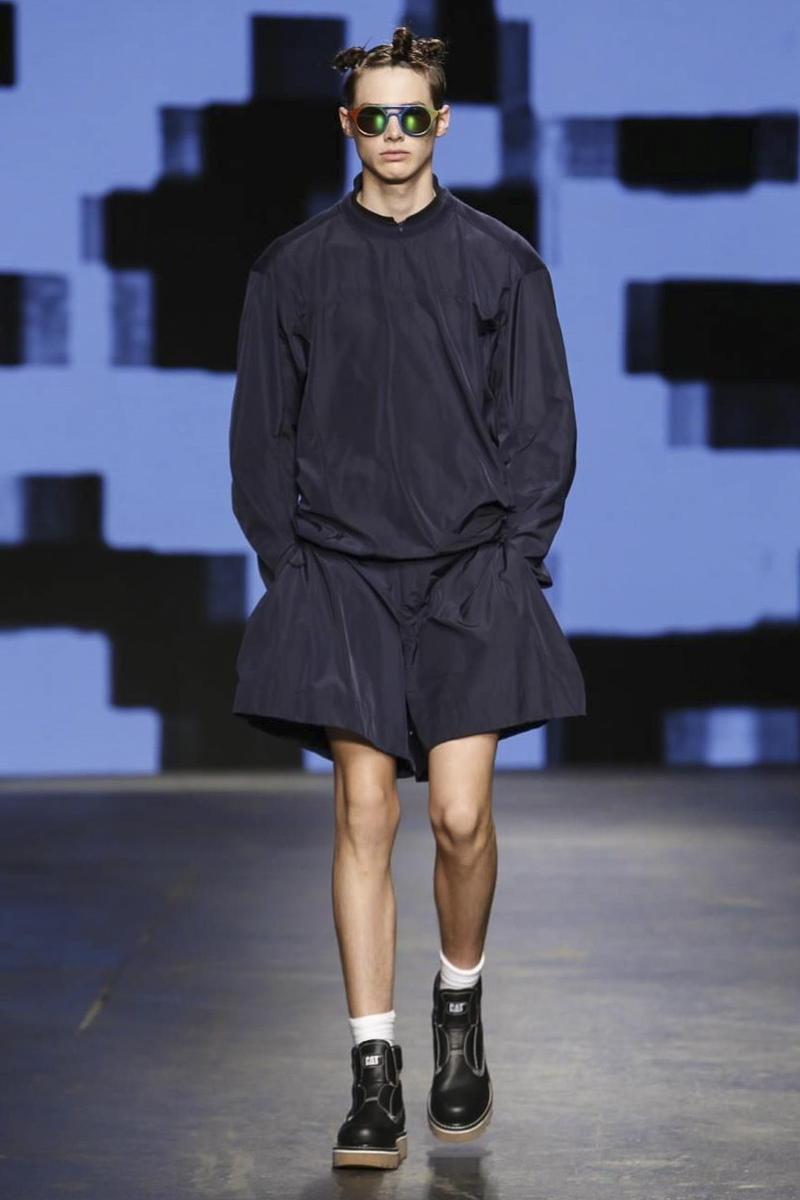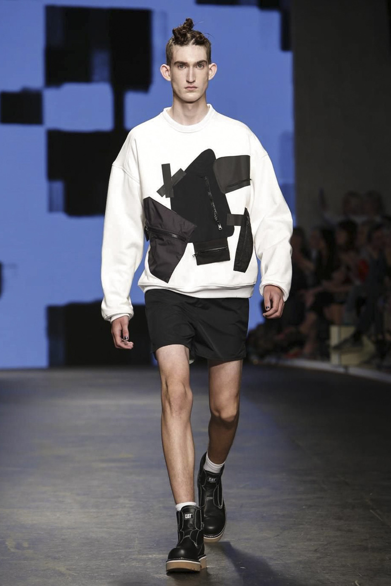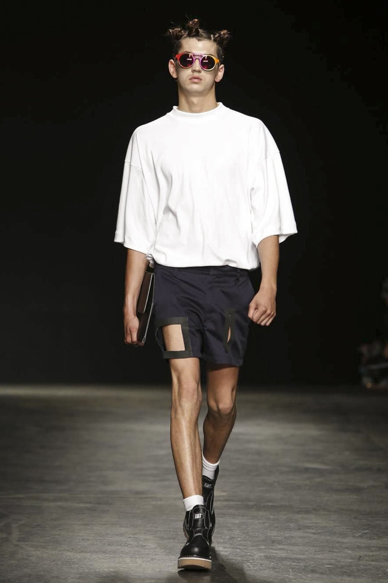 Christopher Shannon Spring/Summer 2015 London. Designer Christopher Shannon took another page from adolescence when approaching his latest collection. Boyish models hit the catwalk for Shannon, brooding with chipped painted nails and braided knots. Mirroring the wall of a teenage boy, oversize sweatshirts, t-shirts and more were dressed in collages created by hand. Making the dress shirt playful, cut-outs were added in addition to volume. Married to boxy shorts and loose elongated polo shirts, Shannon created a fantasy world where streetwear collides with the notion of endless youth.