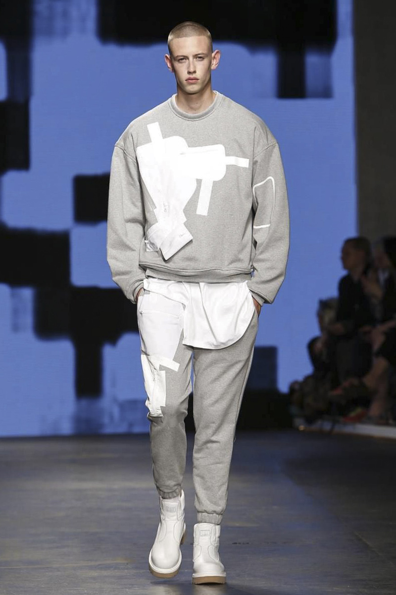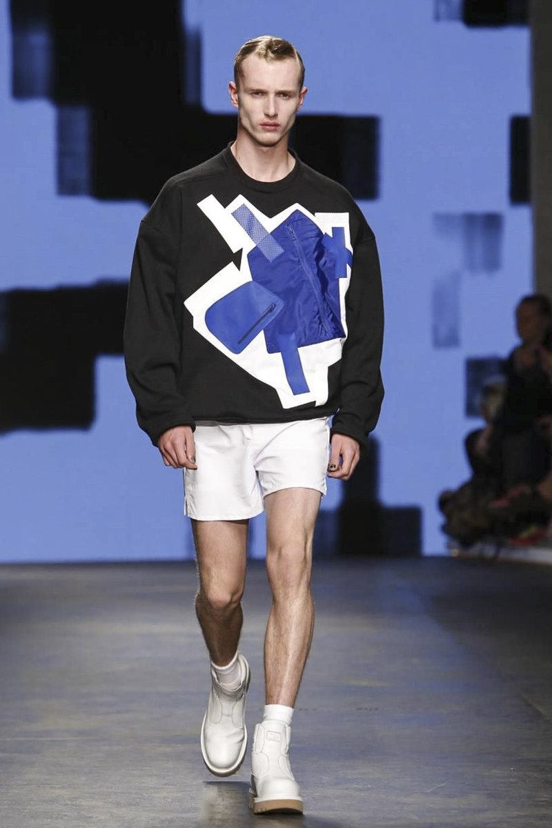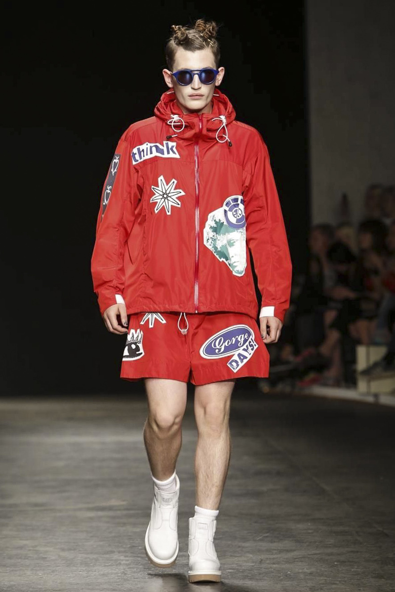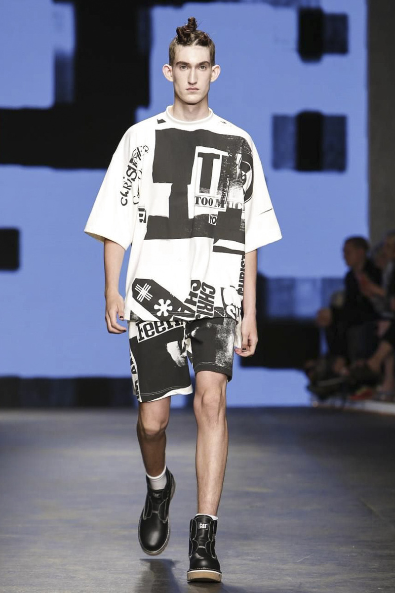 Christopher Shannon Spring/Summer 2015 London. Designer Christopher Shannon took another page from adolescence when approaching his latest collection. Boyish models hit the catwalk for Shannon, brooding with chipped painted nails and braided knots. Mirroring the wall of a teenage boy, oversize sweatshirts, t-shirts and more were dressed in collages created by hand. Making the dress shirt playful, cut-outs were added in addition to volume. Married to boxy shorts and loose elongated polo shirts, Shannon created a fantasy world where streetwear collides with the notion of endless youth.