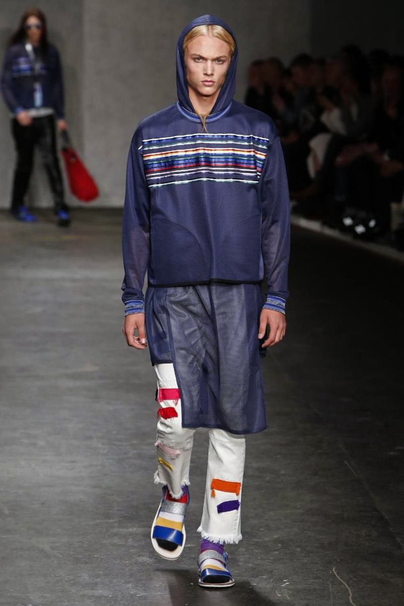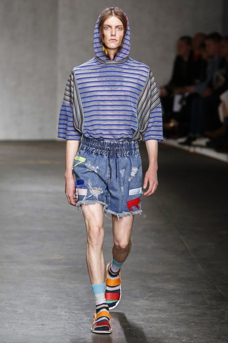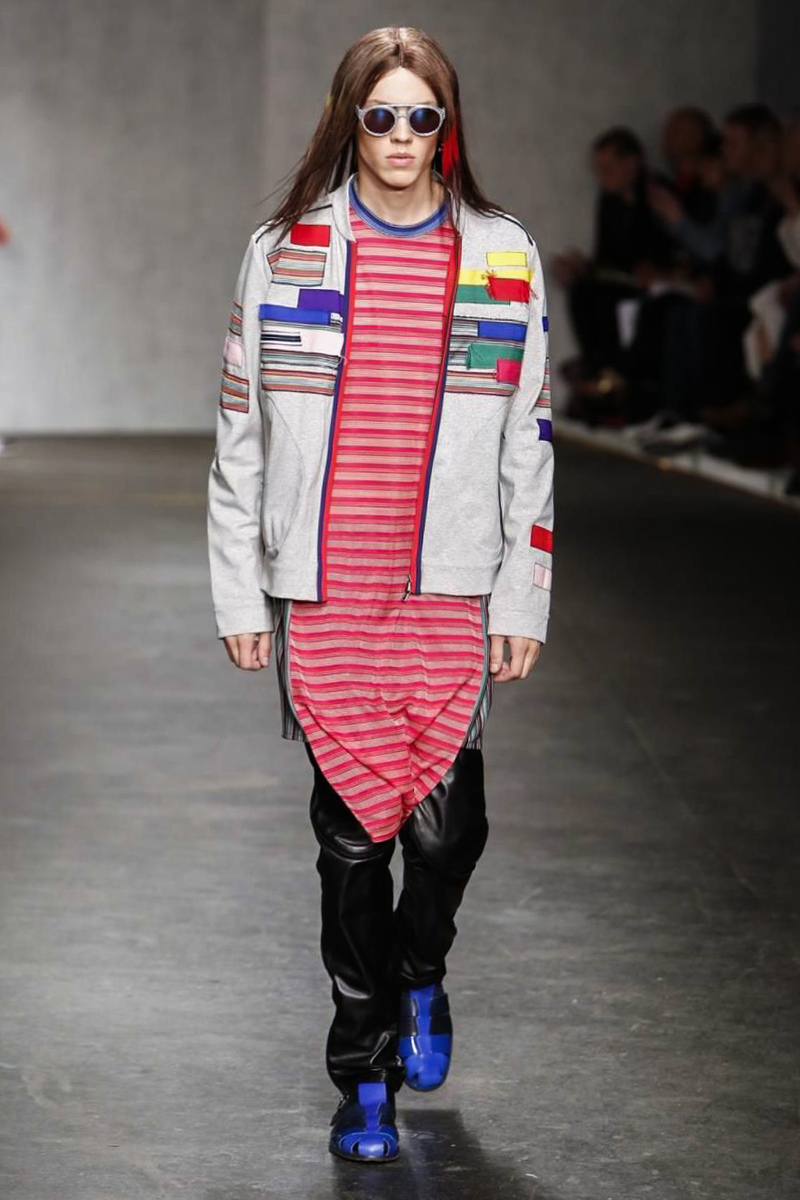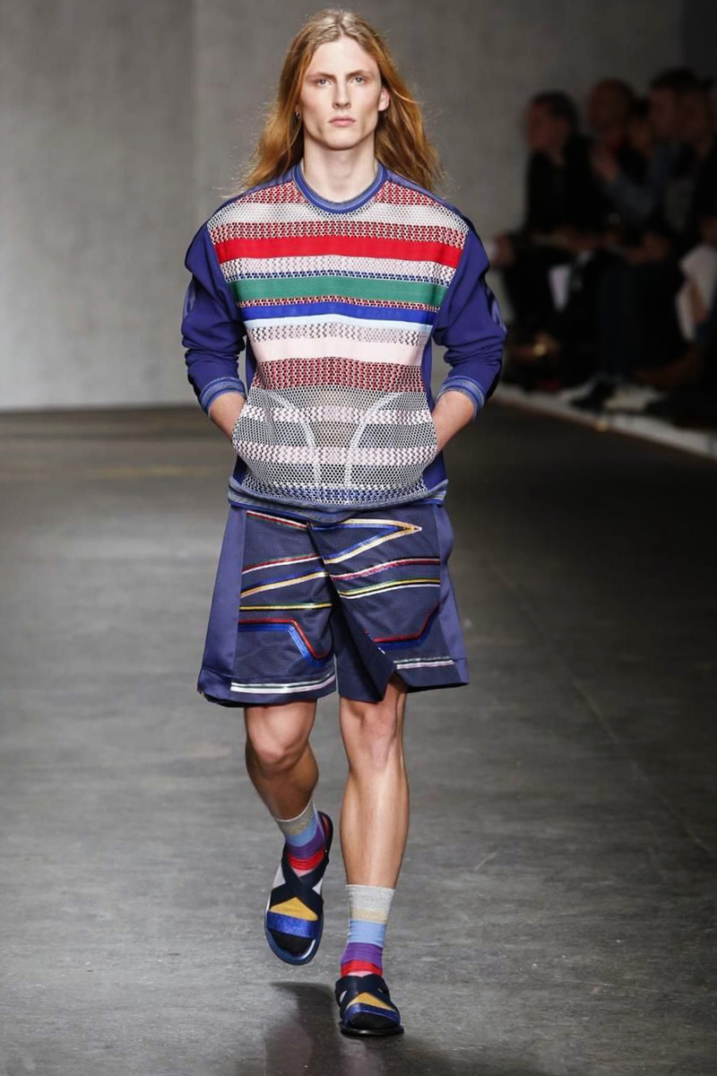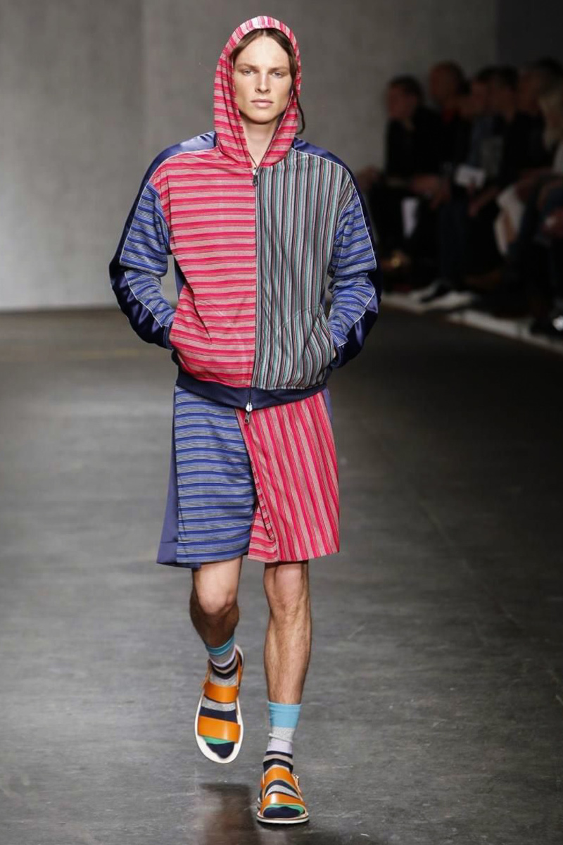 James Long Spring/Summer 2015 at London Collection Men, long haired men, strips all over, singlets, denim, long-t-shirts and sports colorful pants included all in his Menswear.