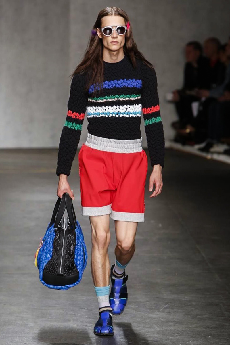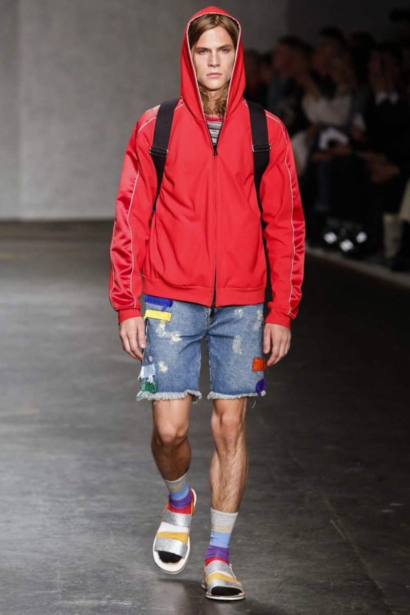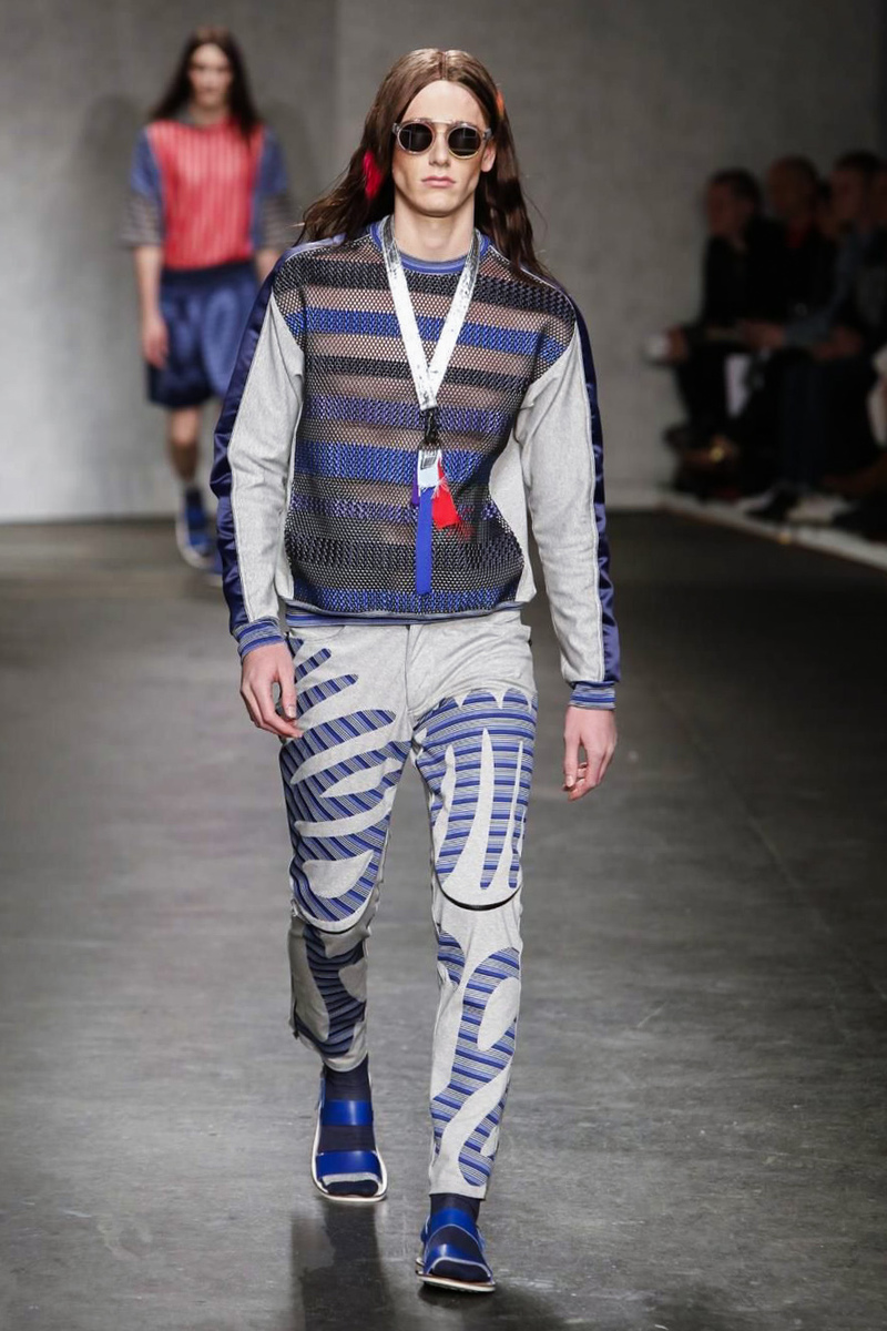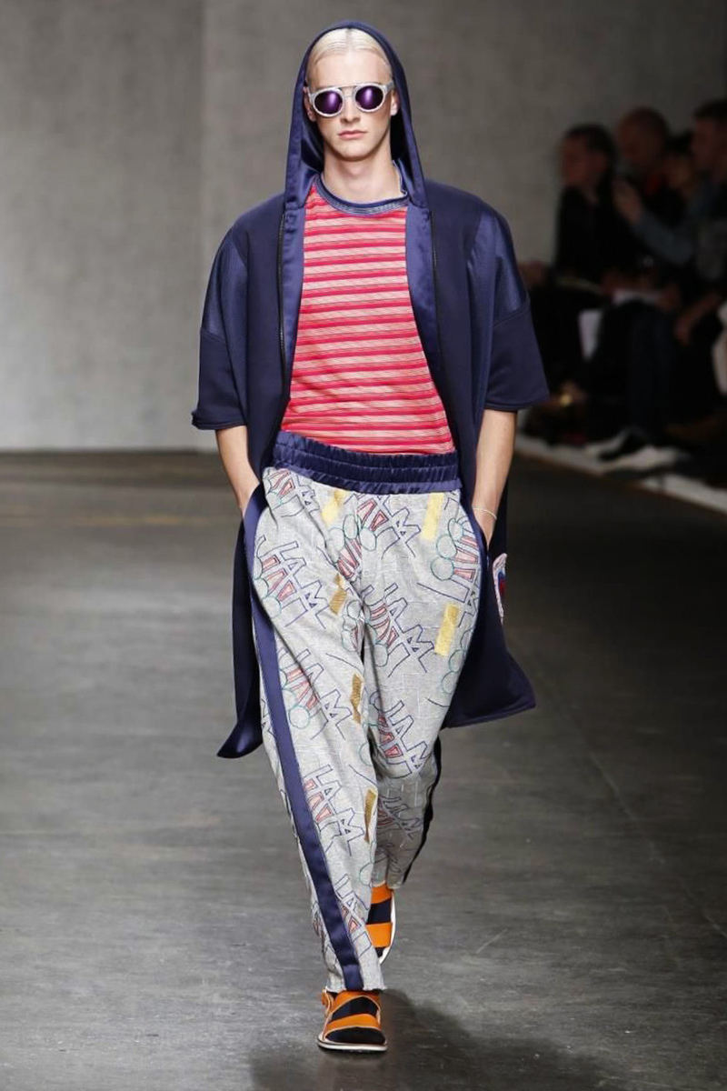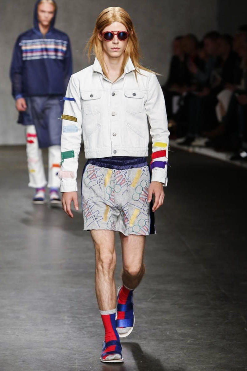James Long Spring/Summer 2015 at London Collection Men, long haired men, strips all over, singlets, denim, long-t-shirts and sports colorful pants included all in his Menswear.