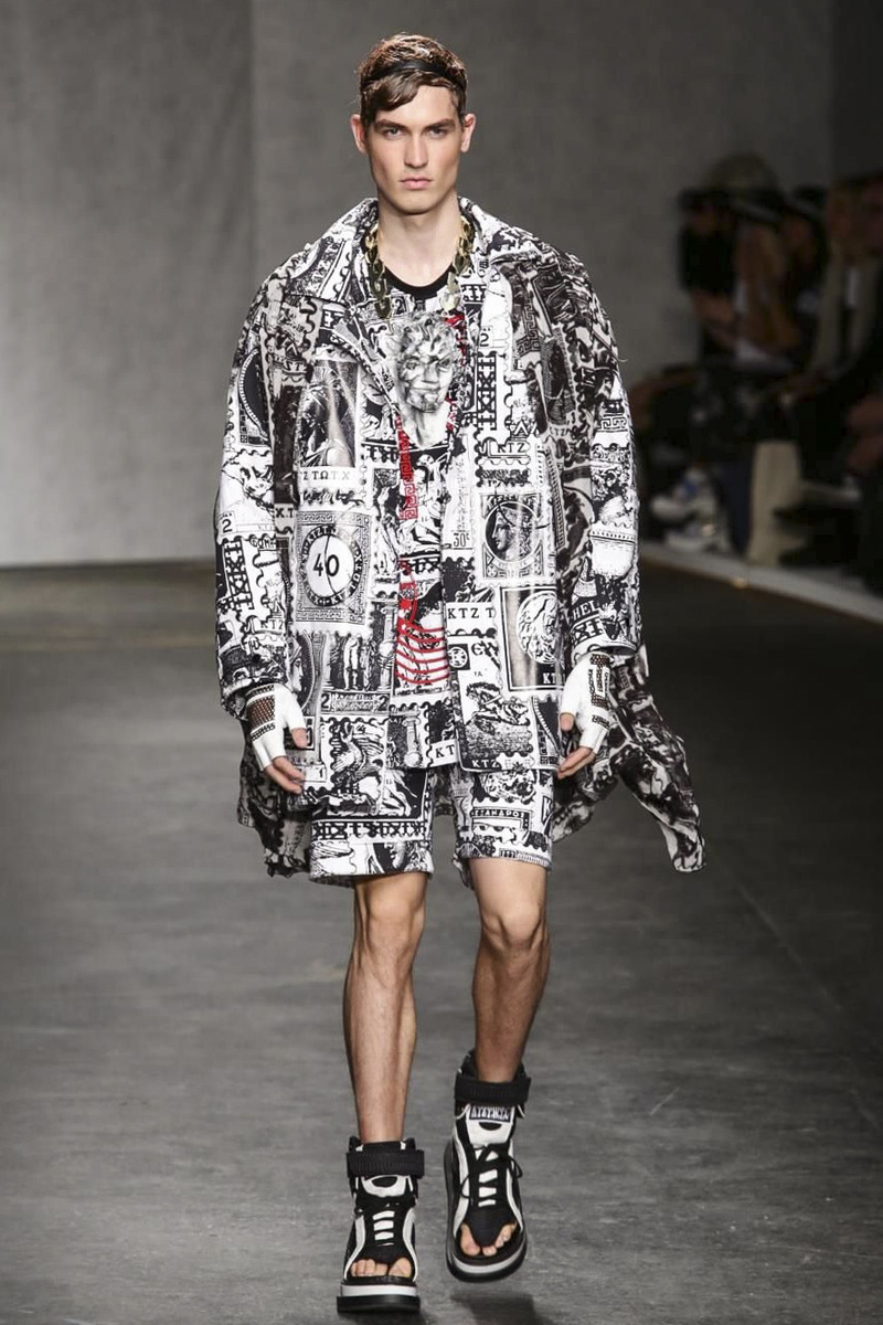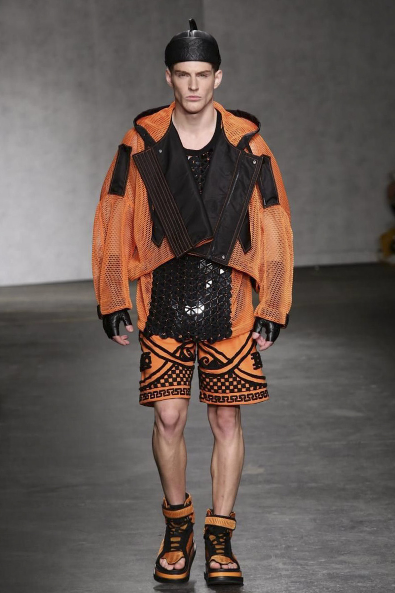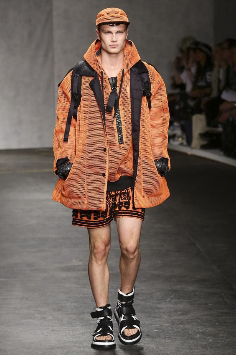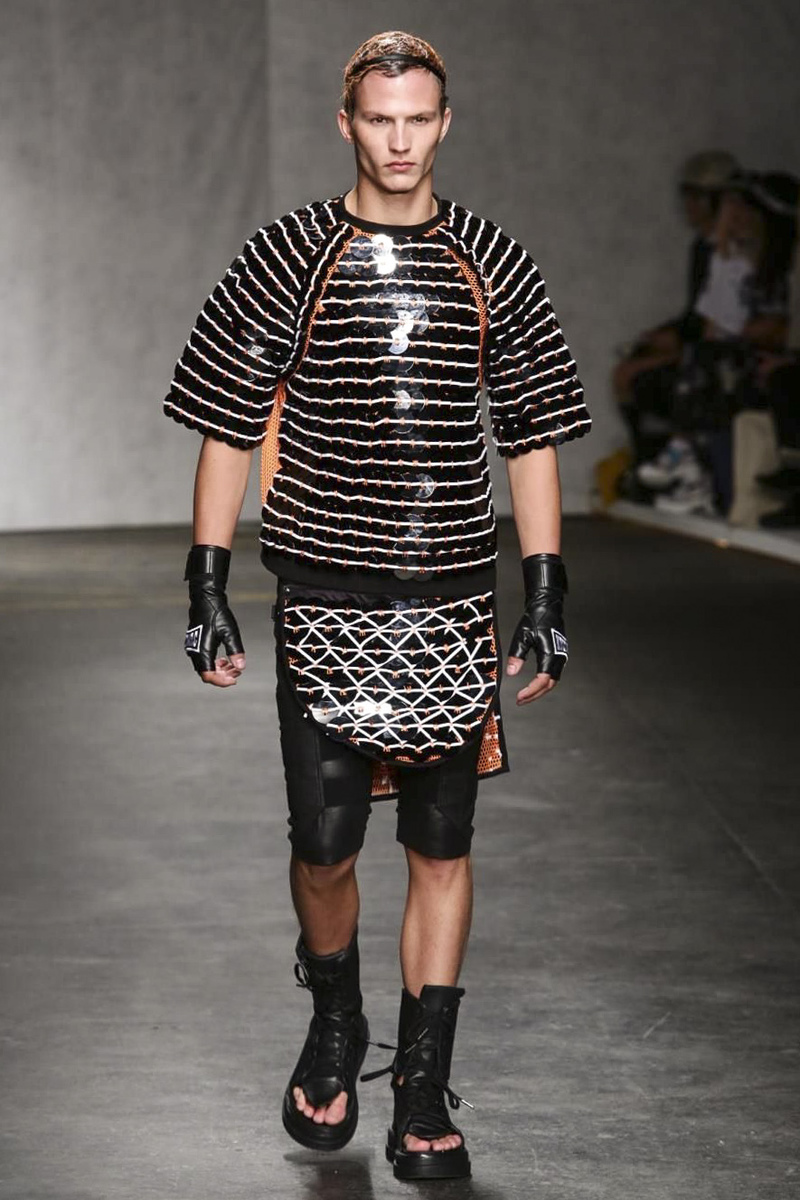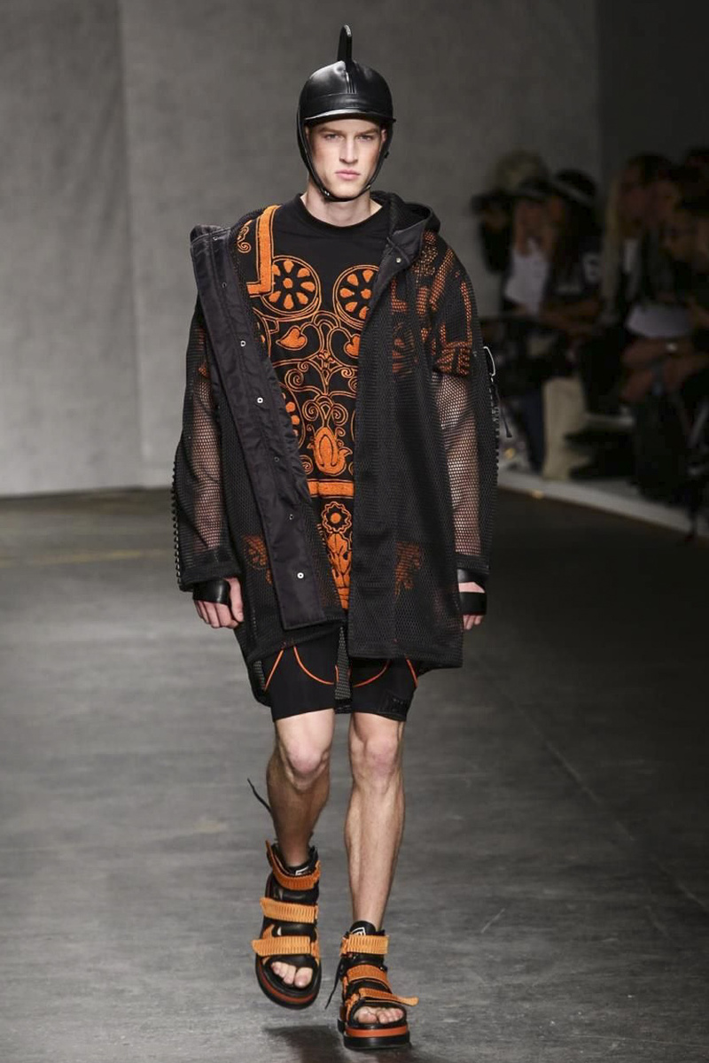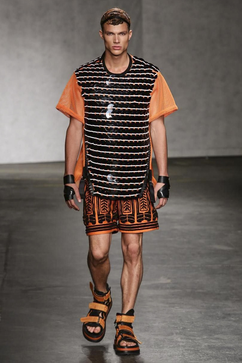 Mixing tribal prints and fearless cuts, KTZ created its own take on gladiators for spring/summer 2015. Not surprising when taking into account the label’s history, black and white were the colors of choice for sporty ensembles. Paired with gladiator sandals, graphic oversize tops created an armor while the use of mesh offered a certain vulnerability. Baggy shorts and voluminous outerwear offered a tough exterior as the show progressed. Creating a light and accessible chain-mail, an intricate print and the use of orange brought the collection full circle, offering varying degrees of fashionable edge.