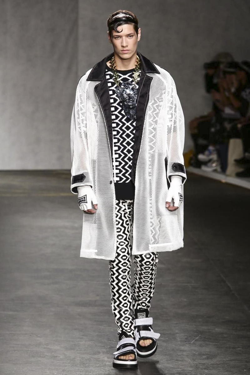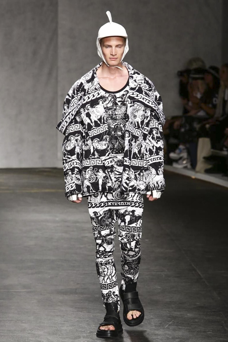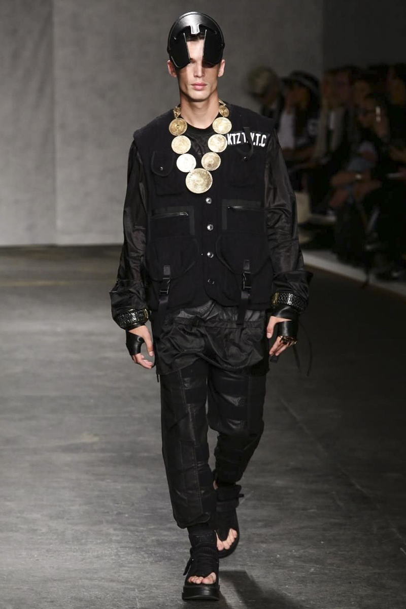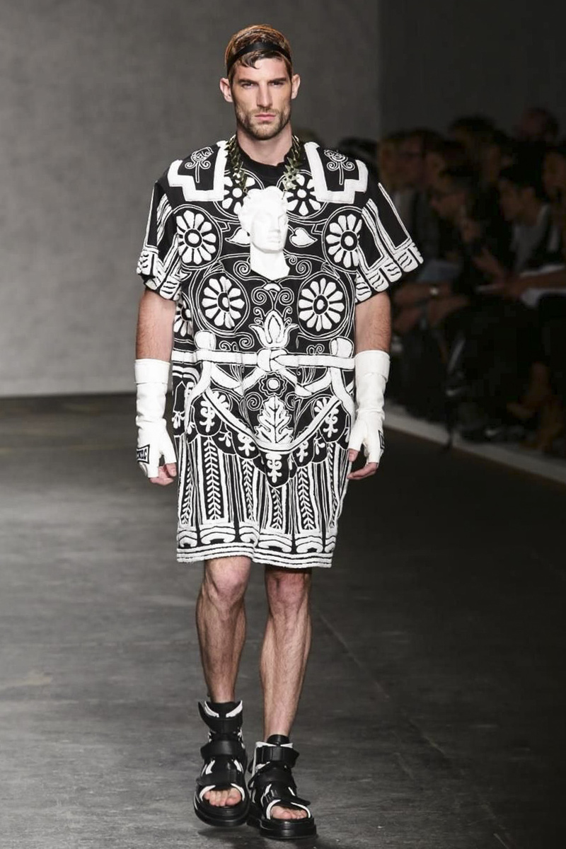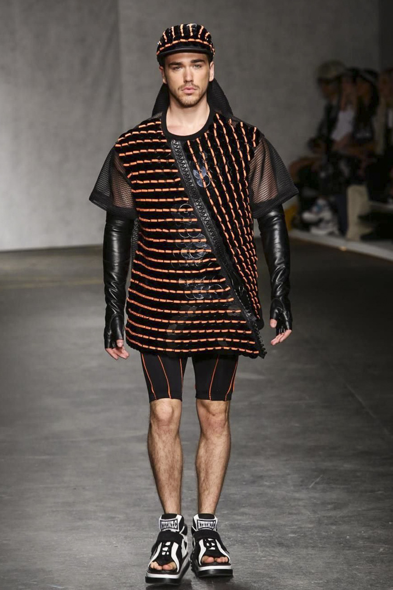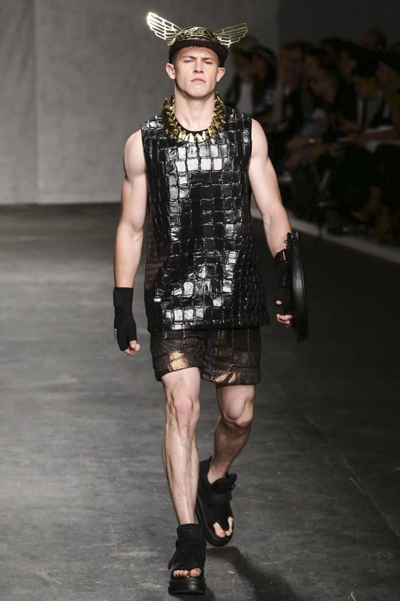 Mixing tribal prints and fearless cuts, KTZ created its own take on gladiators for spring/summer 2015. Not surprising when taking into account the label’s history, black and white were the colors of choice for sporty ensembles. Paired with gladiator sandals, graphic oversize tops created an armor while the use of mesh offered a certain vulnerability. Baggy shorts and voluminous outerwear offered a tough exterior as the show progressed. Creating a light and accessible chain-mail, an intricate print and the use of orange brought the collection full circle, offering varying degrees of fashionable edge.