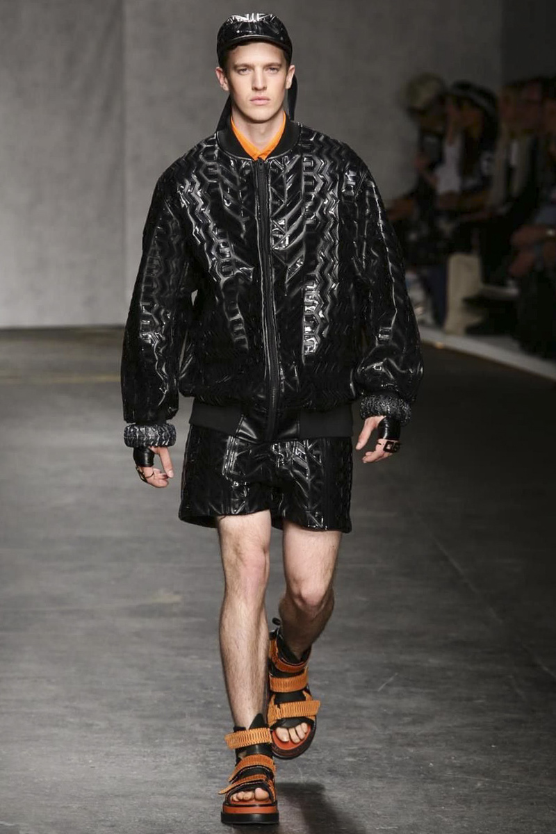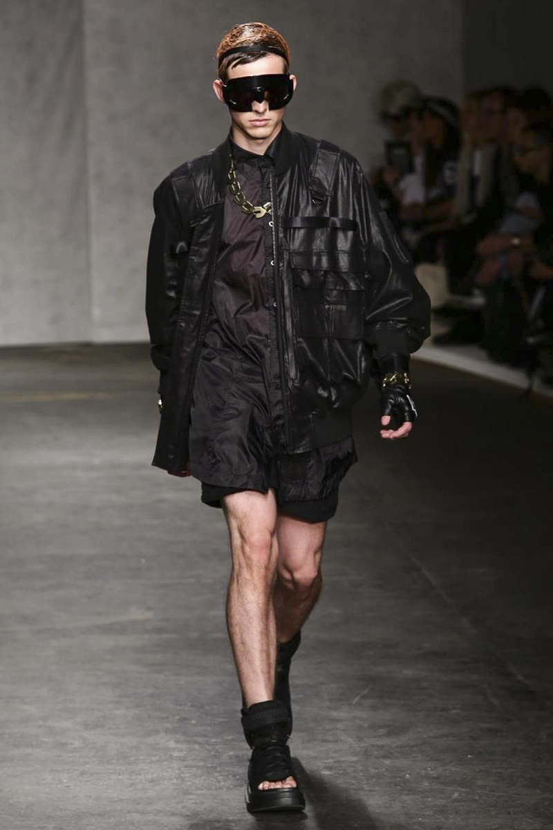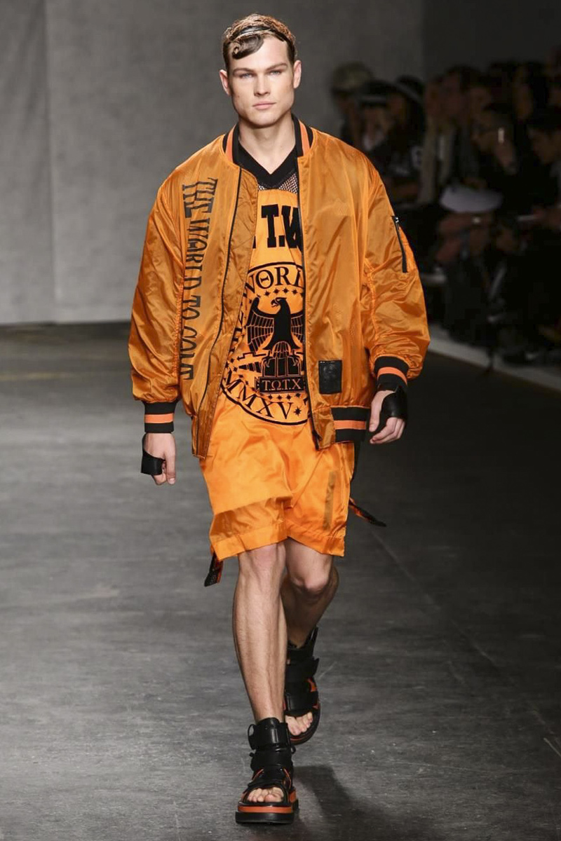 Mixing tribal prints and fearless cuts, KTZ created its own take on gladiators for spring/summer 2015. Not surprising when taking into account the label’s history, black and white were the colors of choice for sporty ensembles. Paired with gladiator sandals, graphic oversize tops created an armor while the use of mesh offered a certain vulnerability. Baggy shorts and voluminous outerwear offered a tough exterior as the show progressed. Creating a light and accessible chain-mail, an intricate print and the use of orange brought the collection full circle, offering varying degrees of fashionable edge.