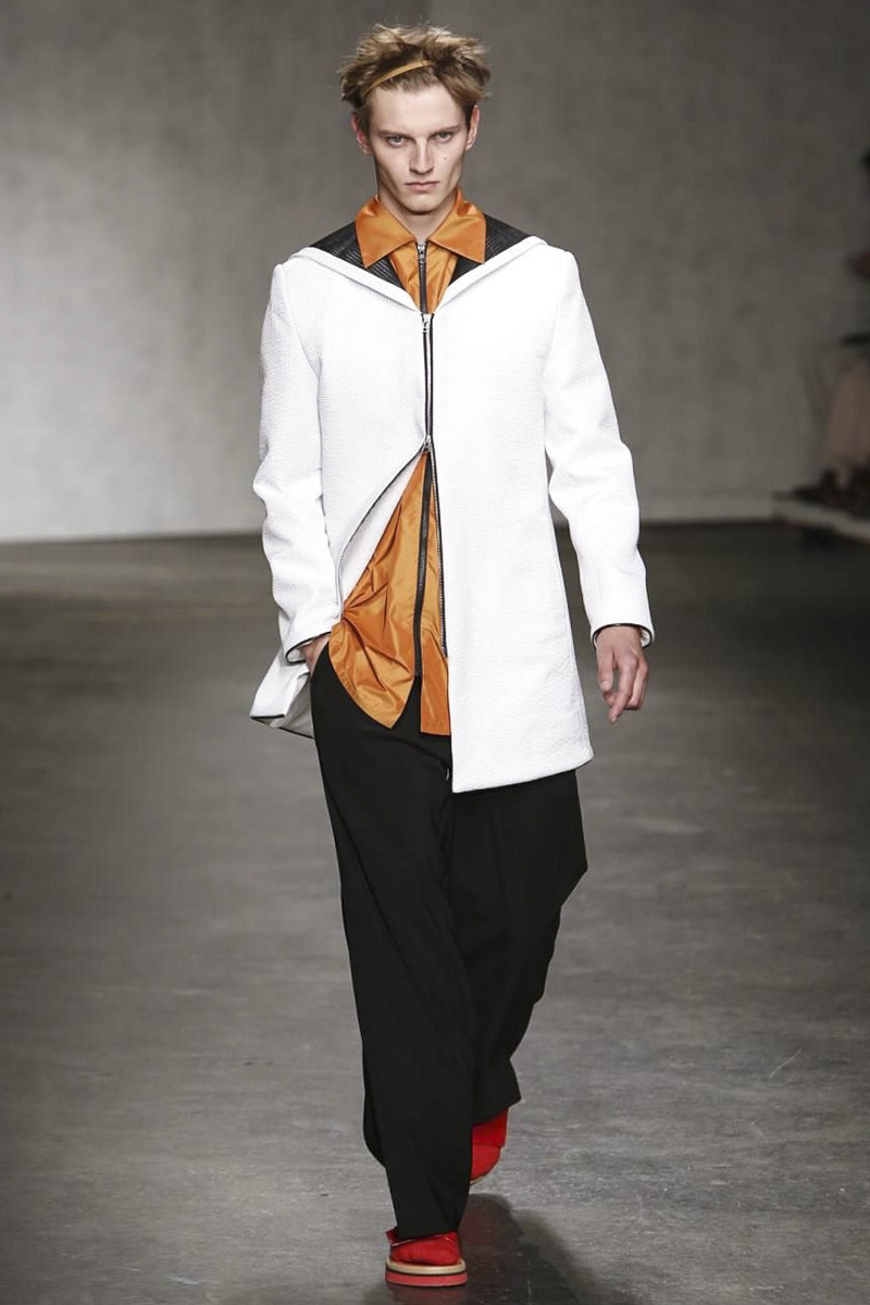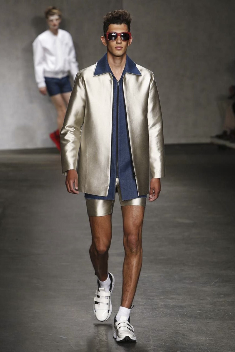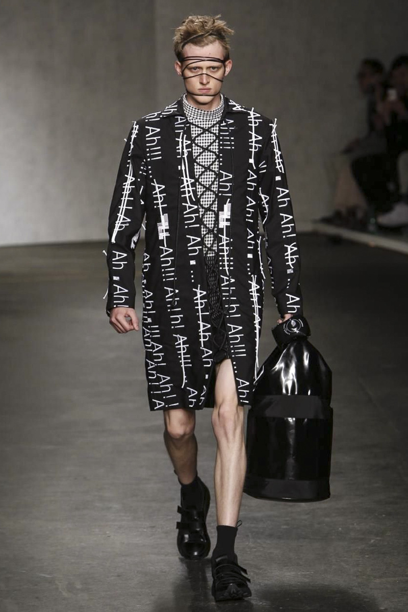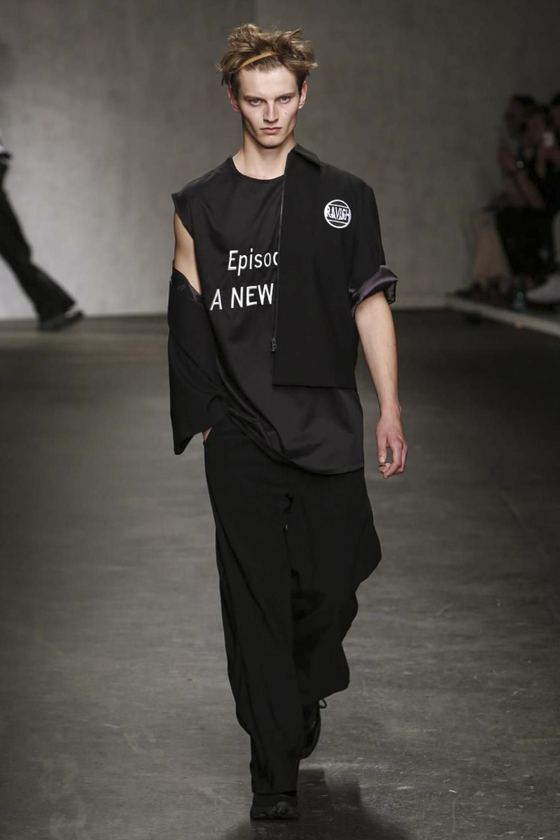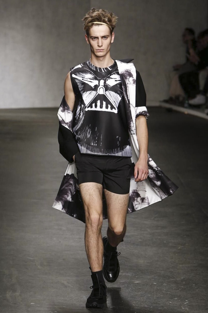 The force was with Xander Zhou as the Chinese label presented its spring/summer 2015 range during London Collections: Men. Creating offbeat fashions for the style aficionado from a galaxy faraway, Xander Zhou referenced Star Wars, even creating a fantastic sleeveless shirt with Darth Vader’s image. Meanwhile, texture added quite the dimension to the collection as looks offered transformative qualities with mesh and other materials. Iridescent coats in a boxy silhouette offered standout outerwear, contrasting against billowing trousers and oversize tops. Altogether, the collection brought two worlds together, presenting the wearable with the aspirational.