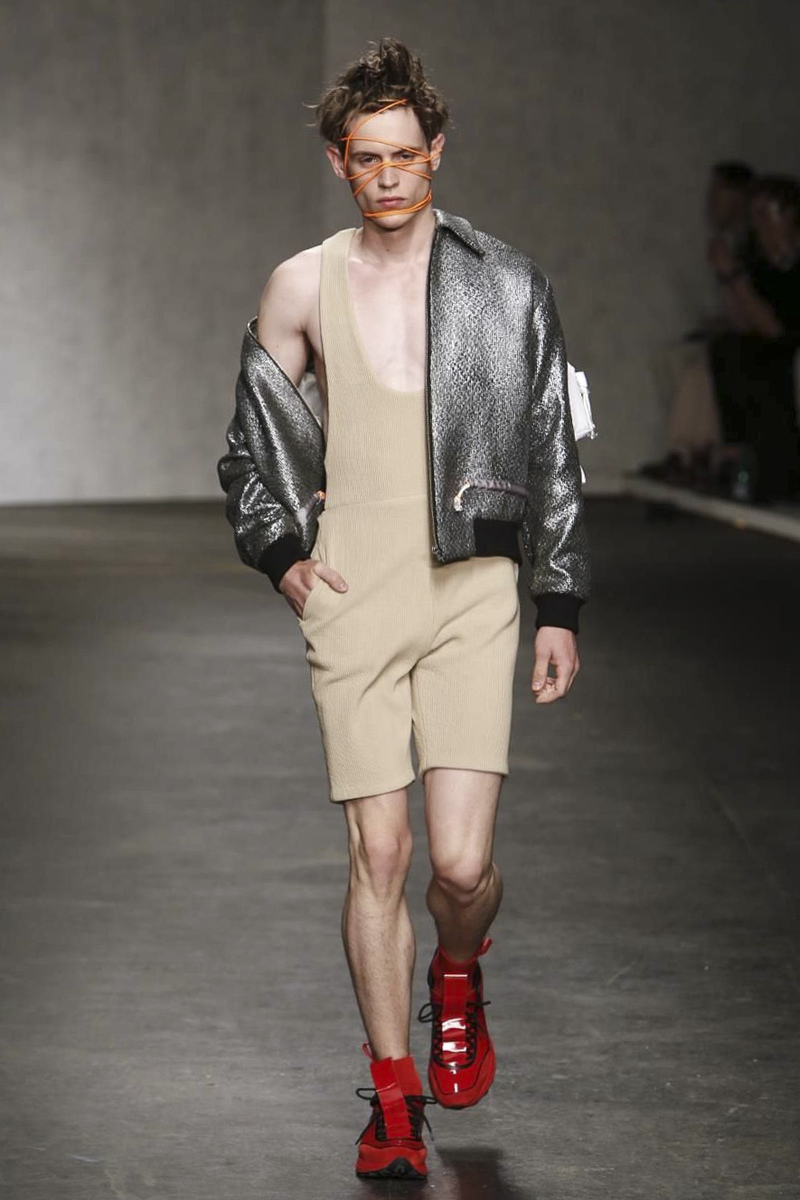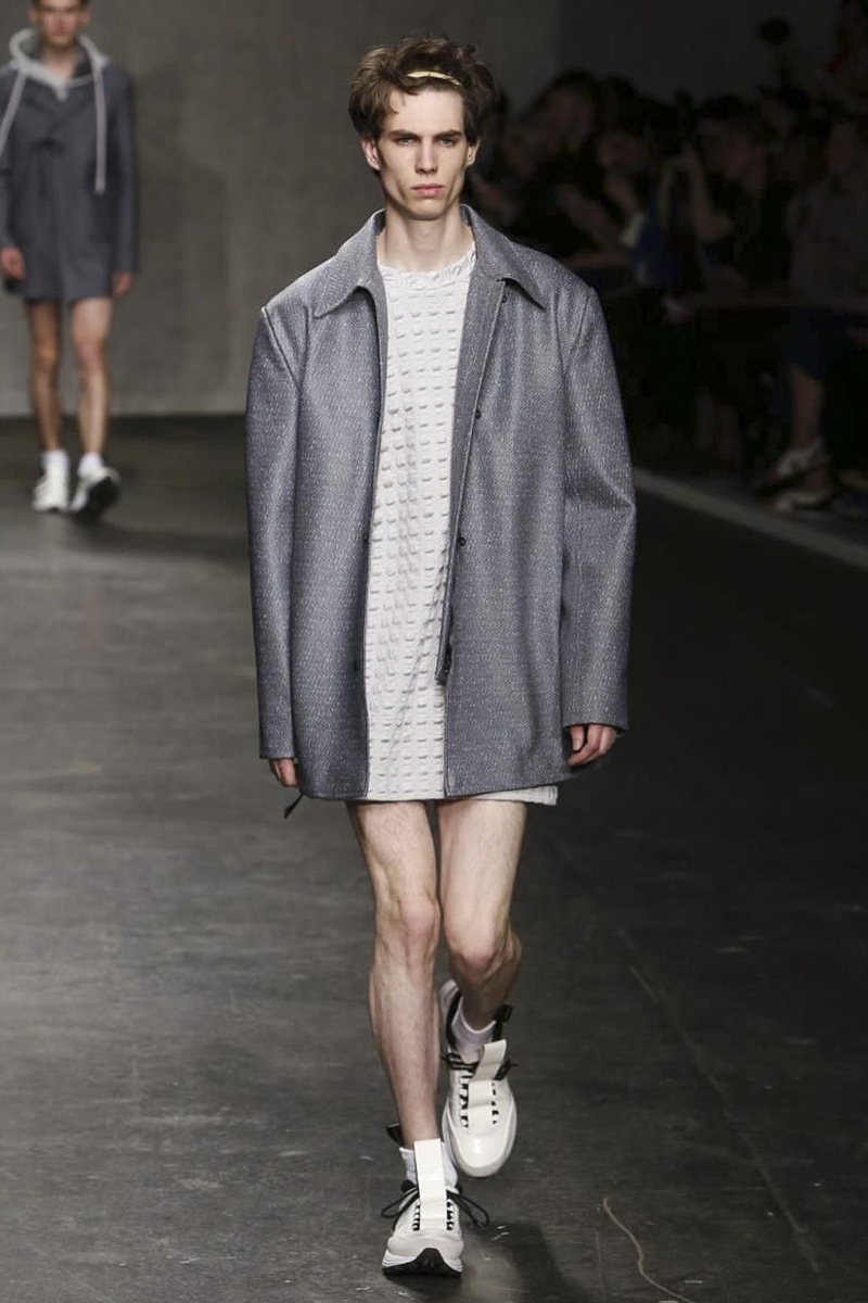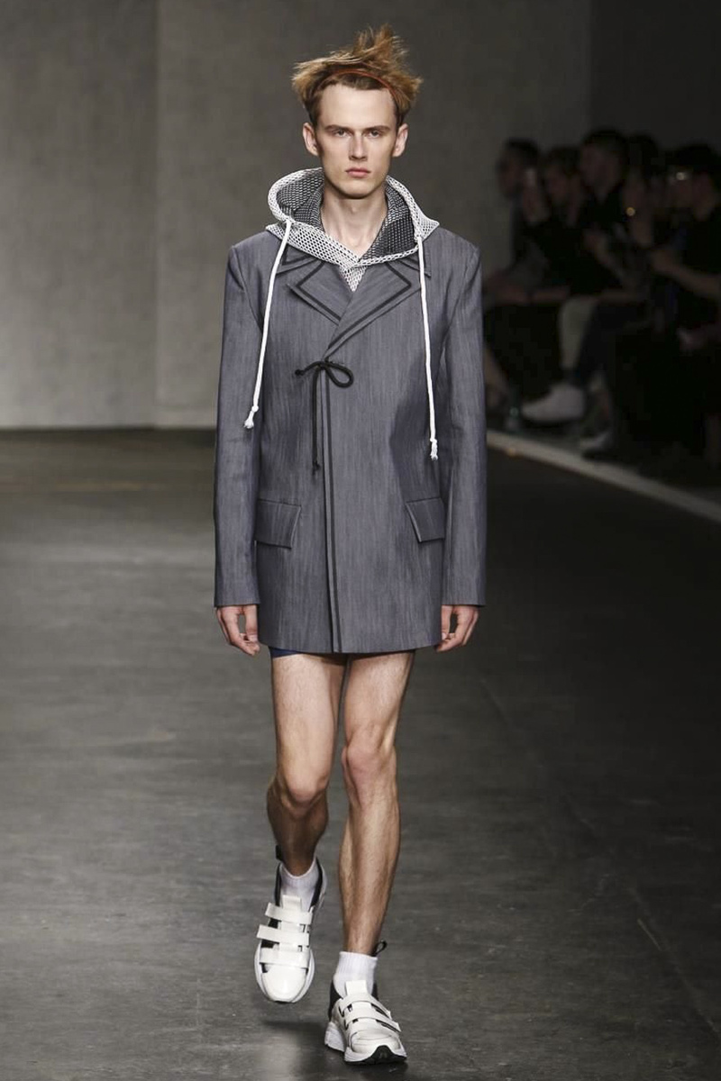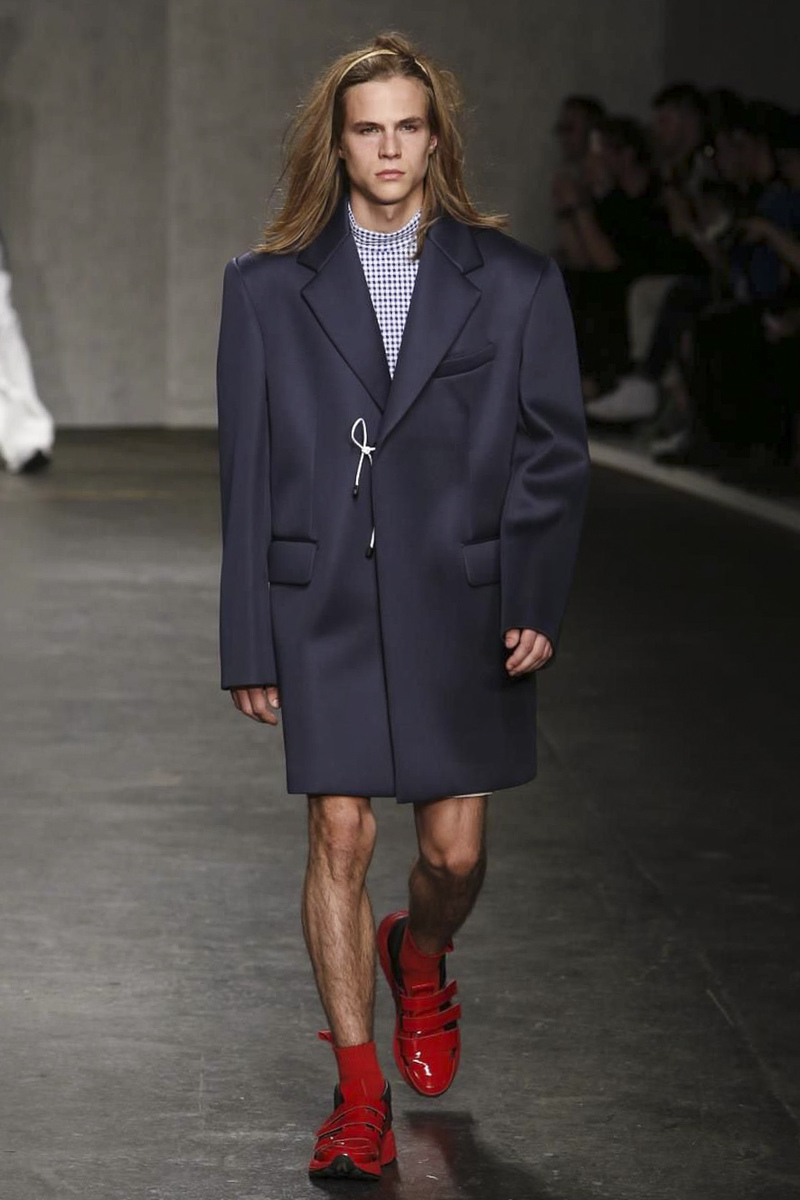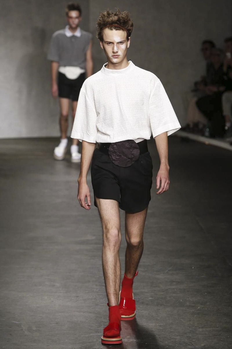 The force was with Xander Zhou as the Chinese label presented its spring/summer 2015 range during London Collections: Men. Creating offbeat fashions for the style aficionado from a galaxy faraway, Xander Zhou referenced Star Wars, even creating a fantastic sleeveless shirt with Darth Vader’s image. Meanwhile, texture added quite the dimension to the collection as looks offered transformative qualities with mesh and other materials. Iridescent coats in a boxy silhouette offered standout outerwear, contrasting against billowing trousers and oversize tops. Altogether, the collection brought two worlds together, presenting the wearable with the aspirational.