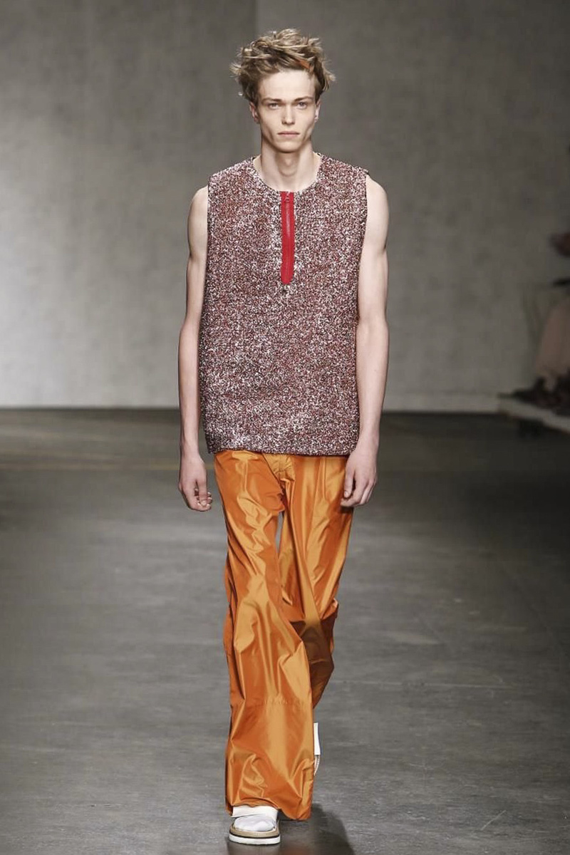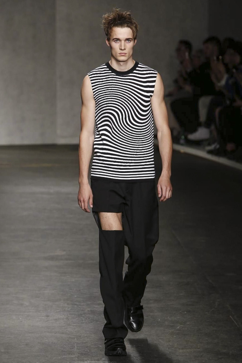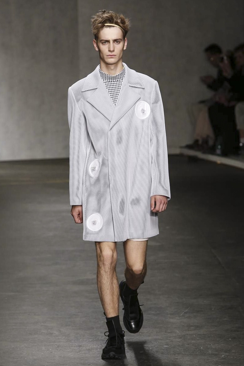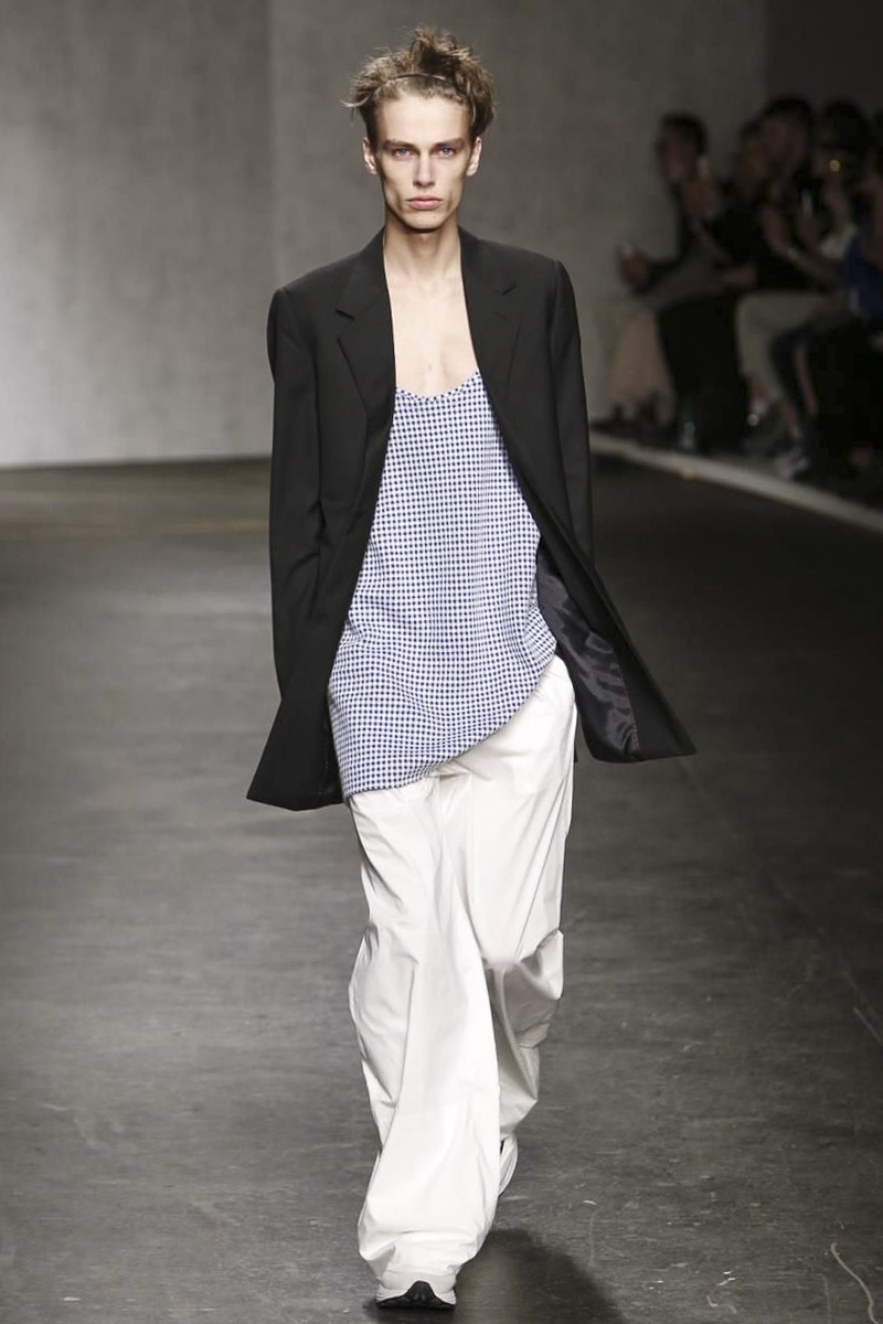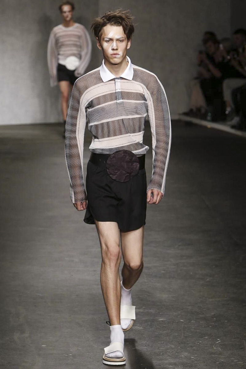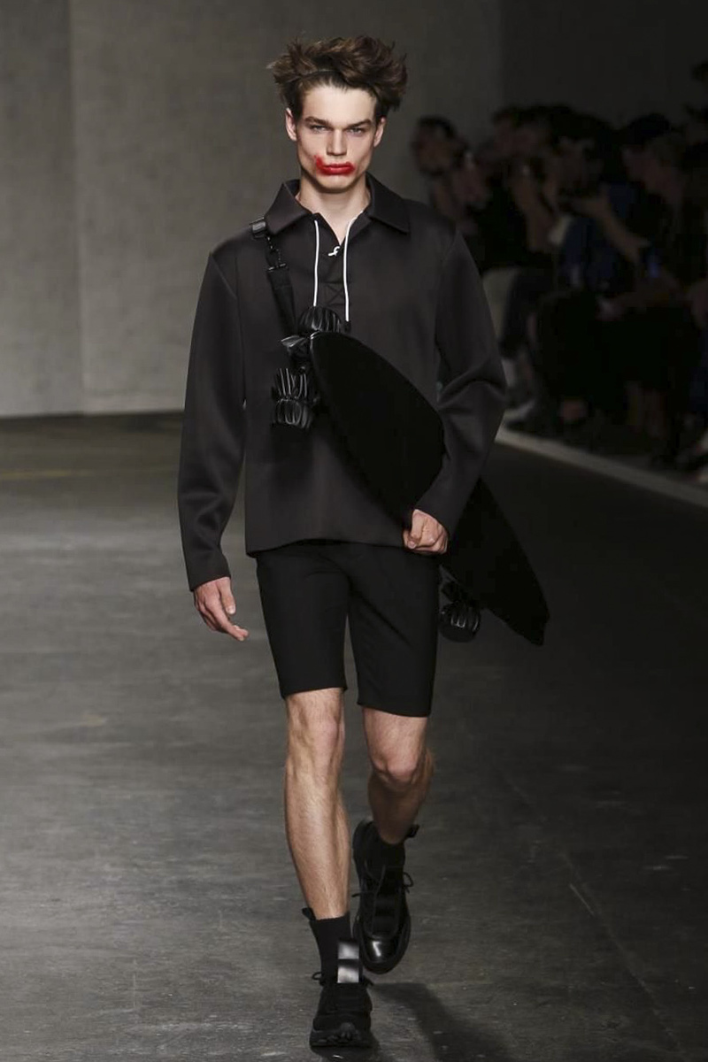 The force was with Xander Zhou as the Chinese label presented its spring/summer 2015 range during London Collections: Men. Creating offbeat fashions for the style aficionado from a galaxy faraway, Xander Zhou referenced Star Wars, even creating a fantastic sleeveless shirt with Darth Vader’s image. Meanwhile, texture added quite the dimension to the collection as looks offered transformative qualities with mesh and other materials. Iridescent coats in a boxy silhouette offered standout outerwear, contrasting against billowing trousers and oversize tops. Altogether, the collection brought two worlds together, presenting the wearable with the aspirational.