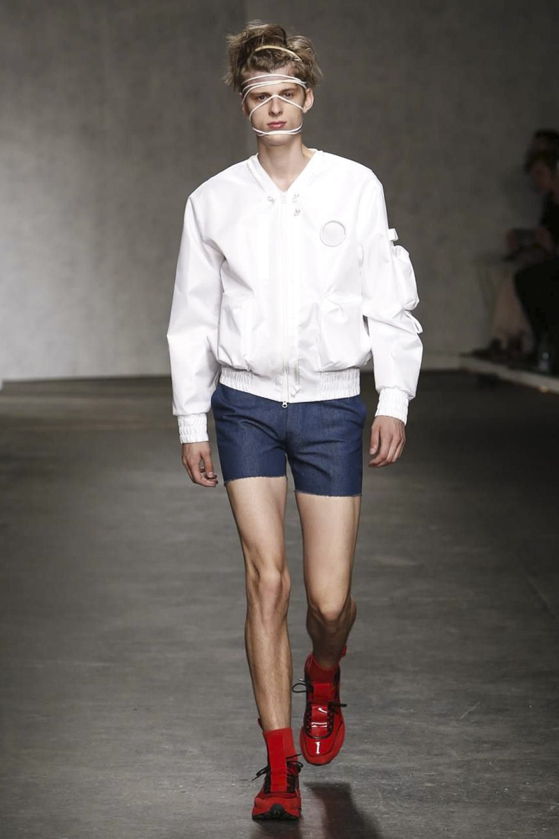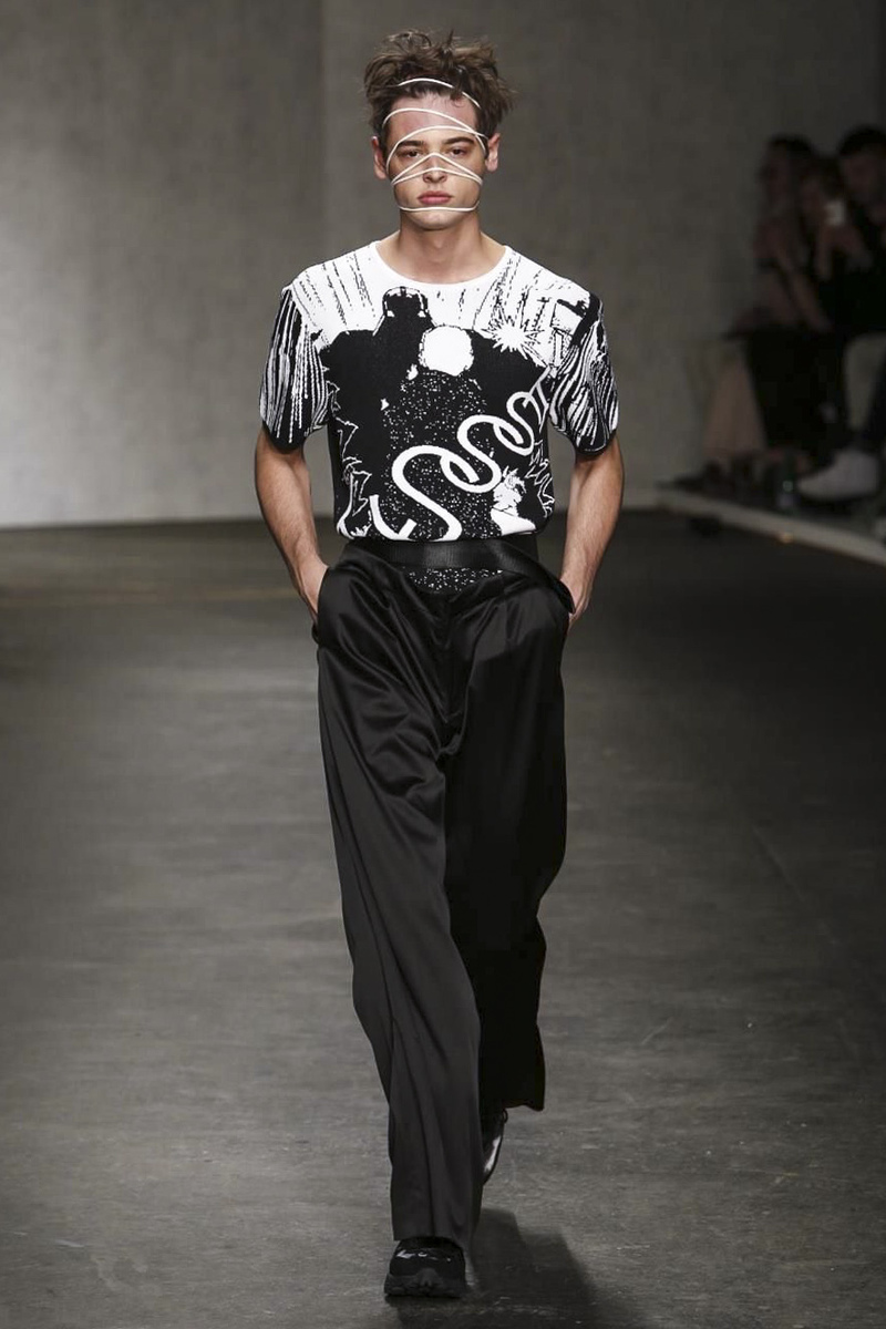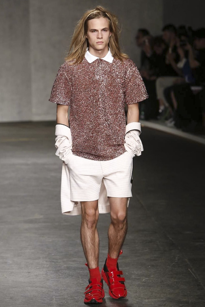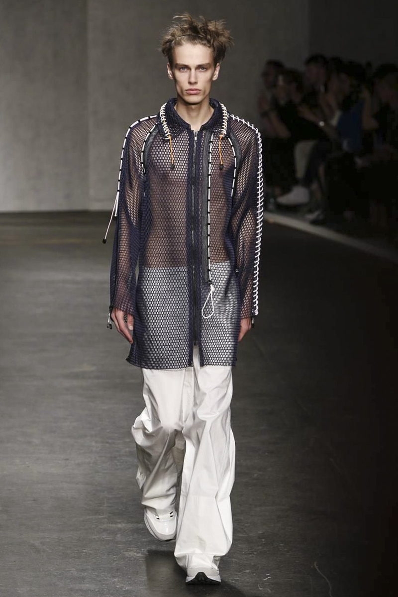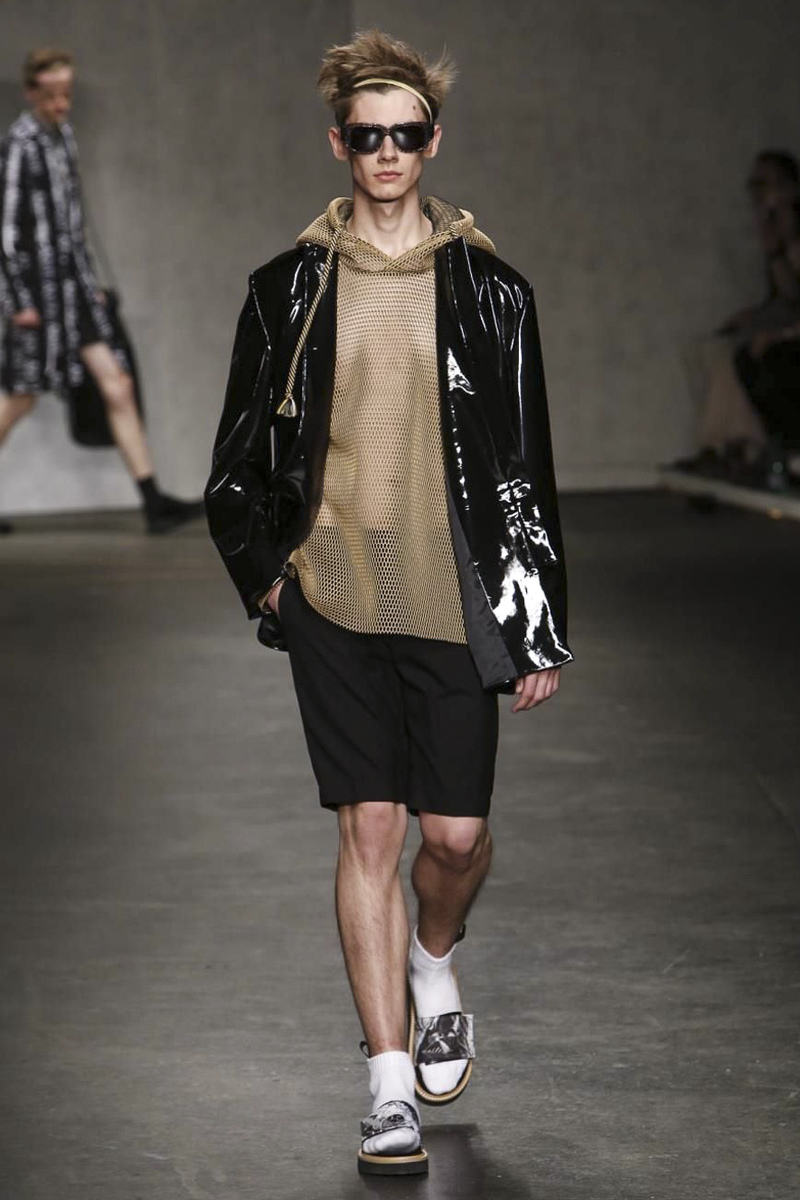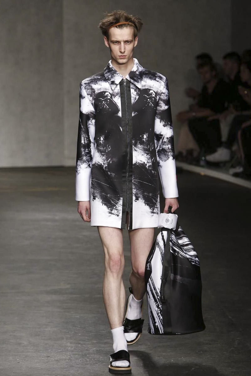 The force was with Xander Zhou as the Chinese label presented its spring/summer 2015 range during London Collections: Men. Creating offbeat fashions for the style aficionado from a galaxy faraway, Xander Zhou referenced Star Wars, even creating a fantastic sleeveless shirt with Darth Vader’s image. Meanwhile, texture added quite the dimension to the collection as looks offered transformative qualities with mesh and other materials. Iridescent coats in a boxy silhouette offered standout outerwear, contrasting against billowing trousers and oversize tops. Altogether, the collection brought two worlds together, presenting the wearable with the aspirational.