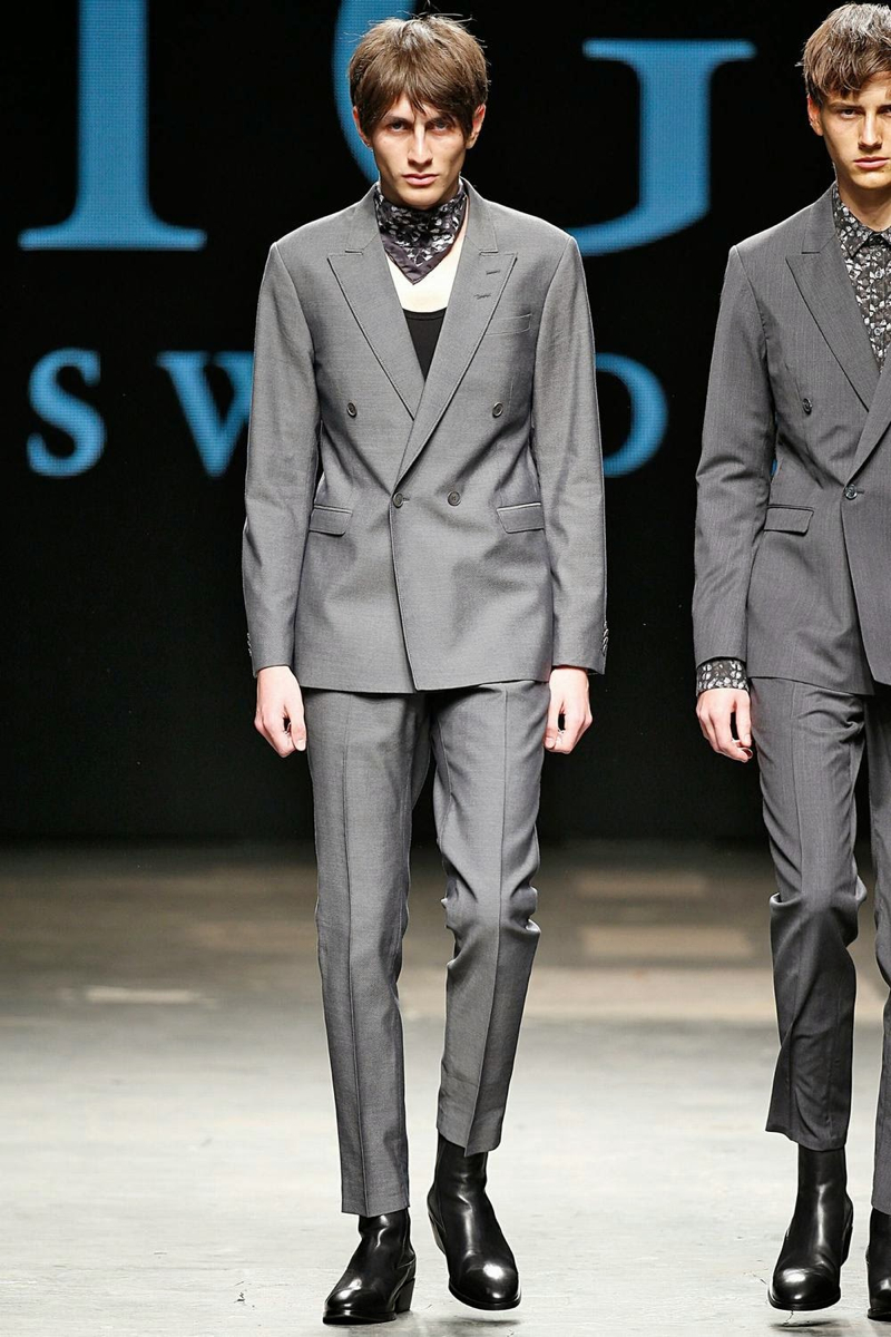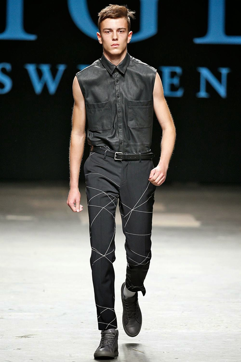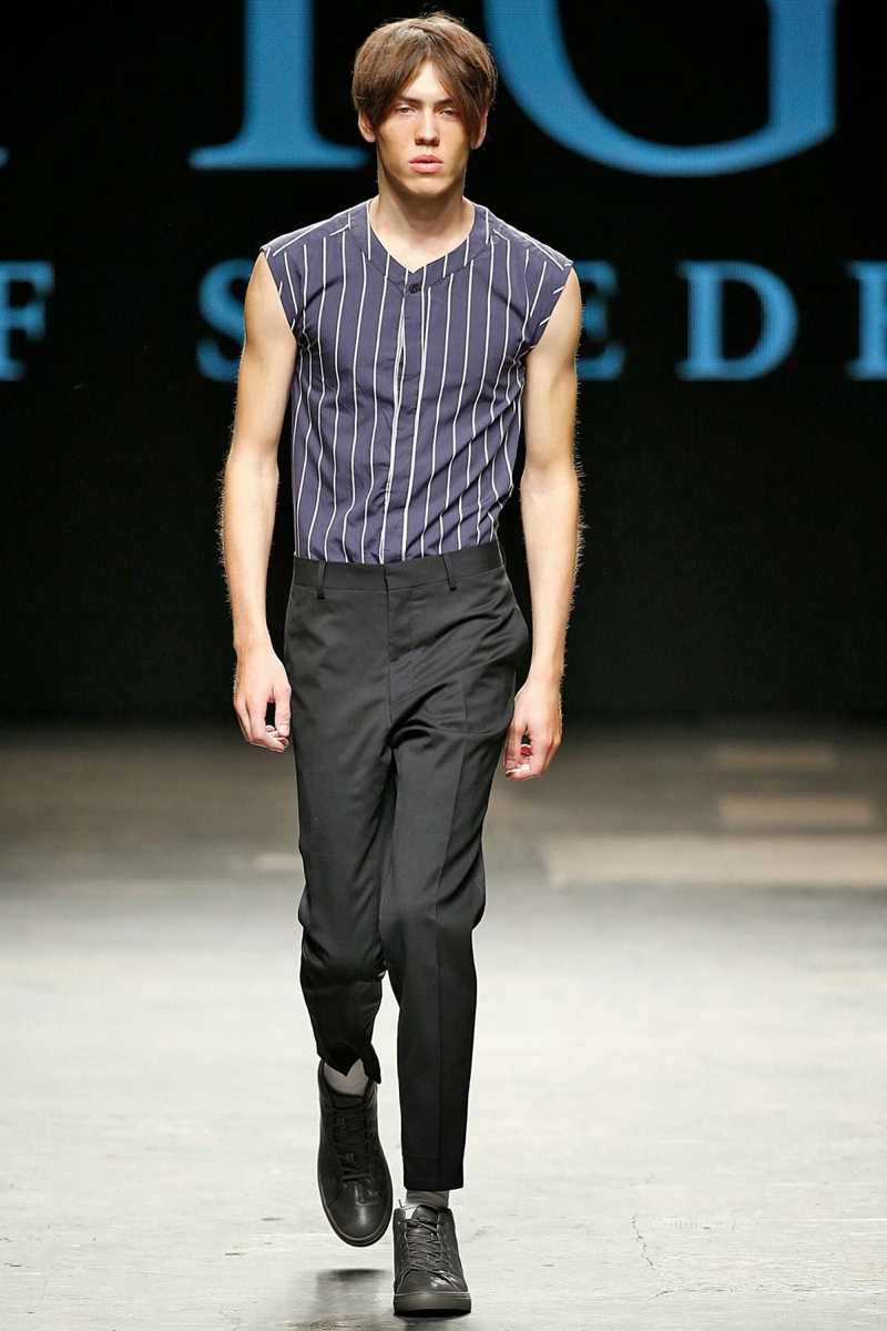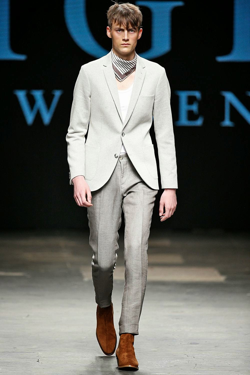 Joining the London Collections: Men lineup, Tiger of London debuted its spring/summer 2015 collection, circling around the modern suit. Embracing shades of gray with pops of red and blue, the Scandinavian label showcased the suit with a youthful attitude. From trim waistcoats and pinstripe finishes to double-breasted blazers paired with shorts, the fashion brand made a strong impact showcasing the versatility of the suit, mixing it up with the interjection of bomber jackets, leather shirts, sleeveless numbers and more.