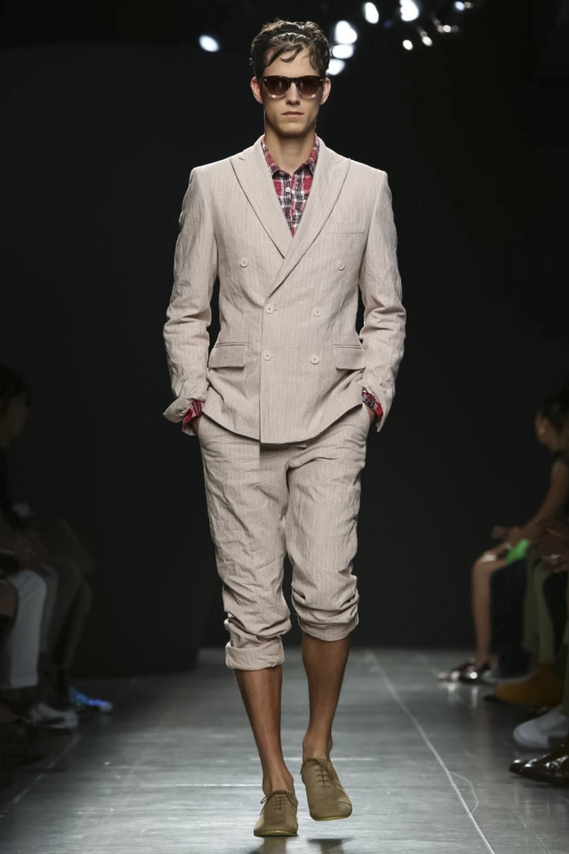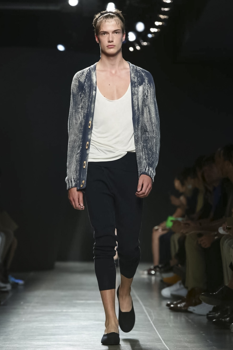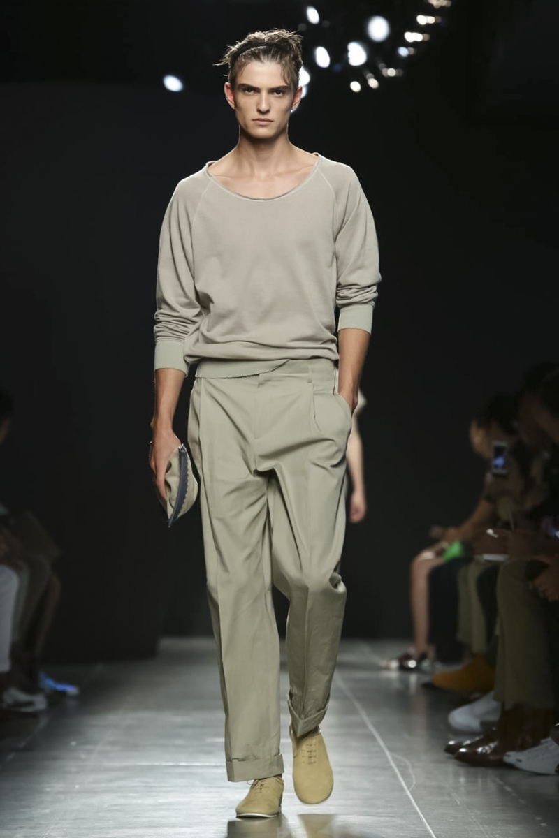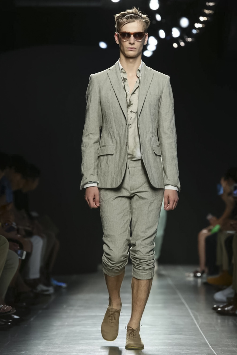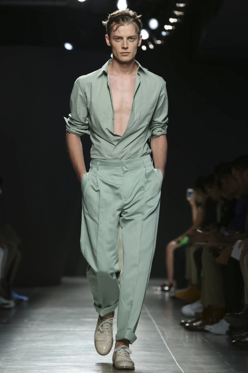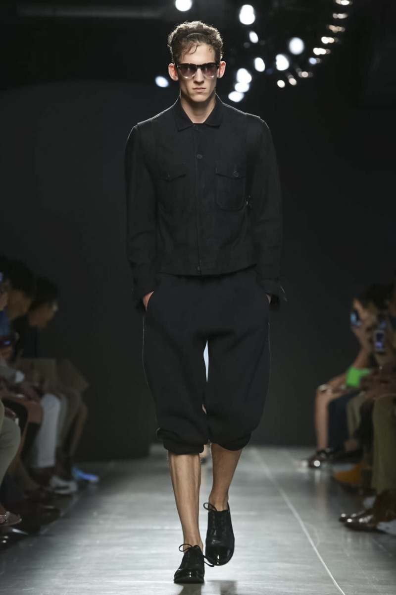 Bottega Veneta creative director Tomas Maier went after the athletic man for spring/summer 2015. Treating fabrics with innovative smocking, washing, stitching and fading techniques, Maier gave his latest collection the familiarity of worn-in favorites. Exuding an ease and grace, relaxed silhouettes were paired with luxe materials, showcasing unlined separates. One of the more casual Bottega Veneta outings to date, the lineup included cropped trousers, baggy shorts, draped dress shirts as well as a high-end take on joggers.
