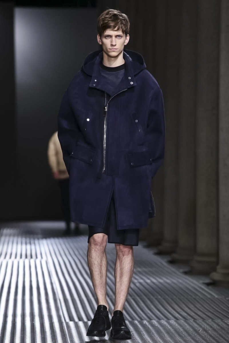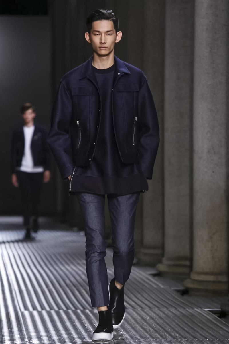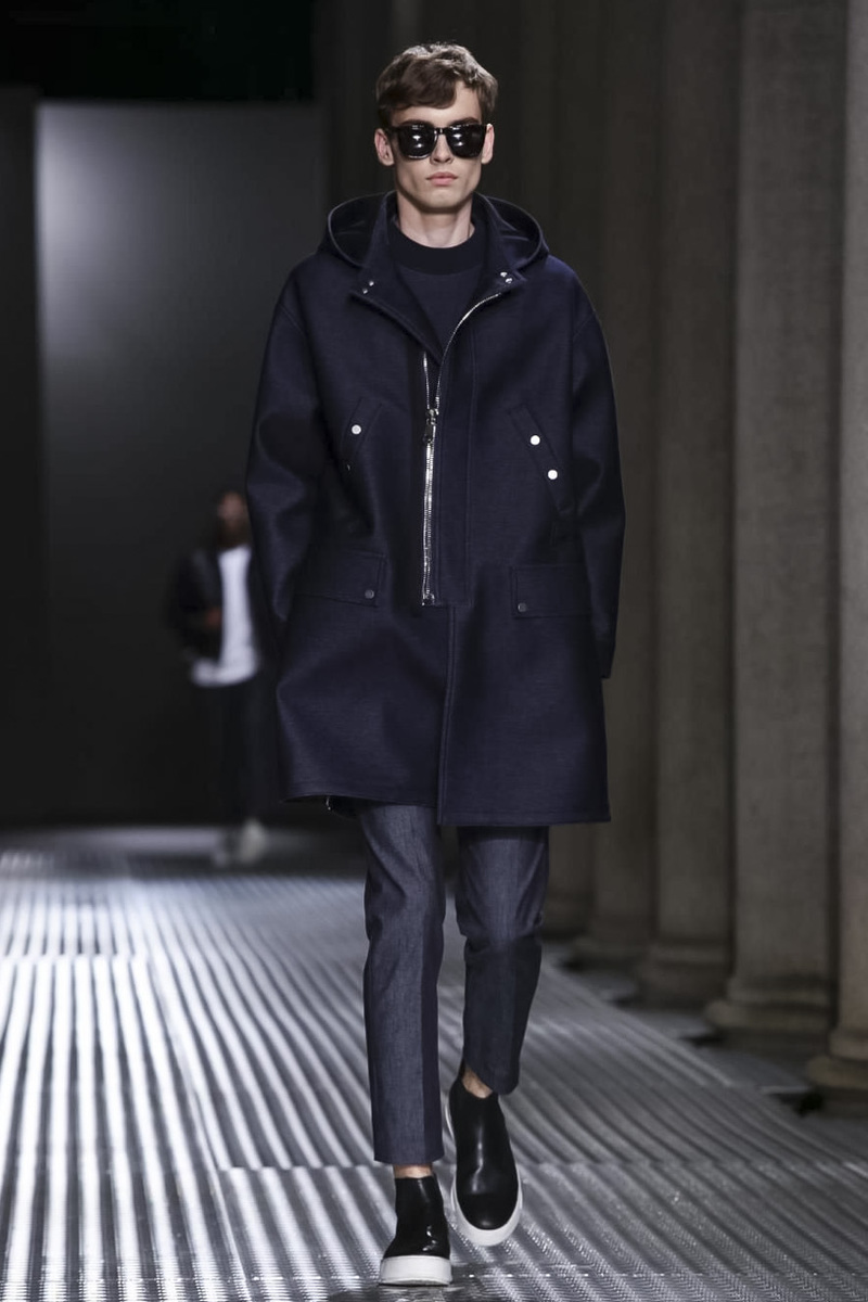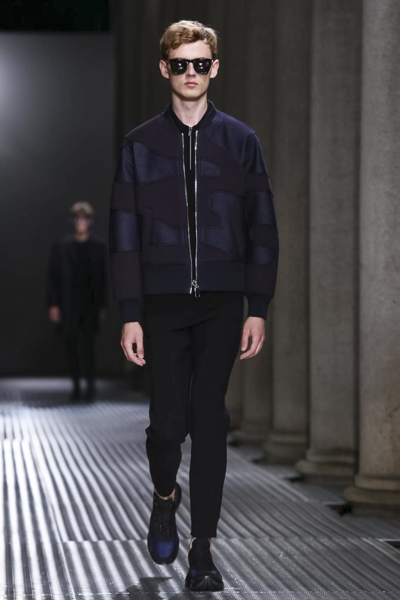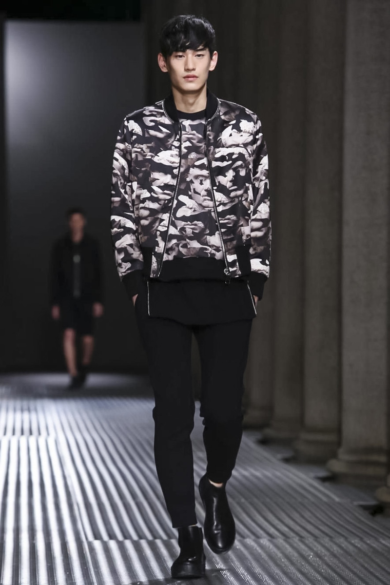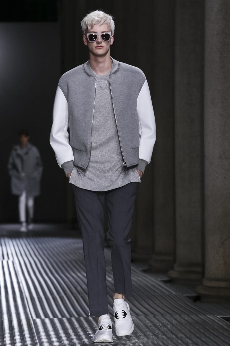 English designer Neil Barrett kicked off his spring/summer 2015 show with a clean pure white canvas, applying prints and graphics as his colors. Continuing an effortless cool and smart style that has become the brand’s synergy, Barrett delivered short jackets, sweatshirts, bomber jackets and more. Worn with slim-cut pants and confined to a few select neutrals, the range, which was paired with trainers and ankle boots provided for the man of style, who is on vogue whether wearing a classic camel colored coat or dressing down in designer sweatshirt.