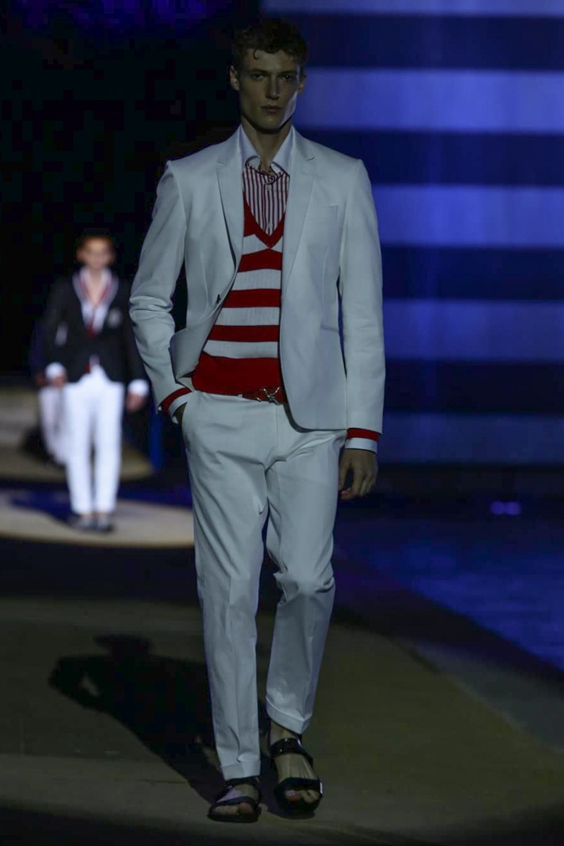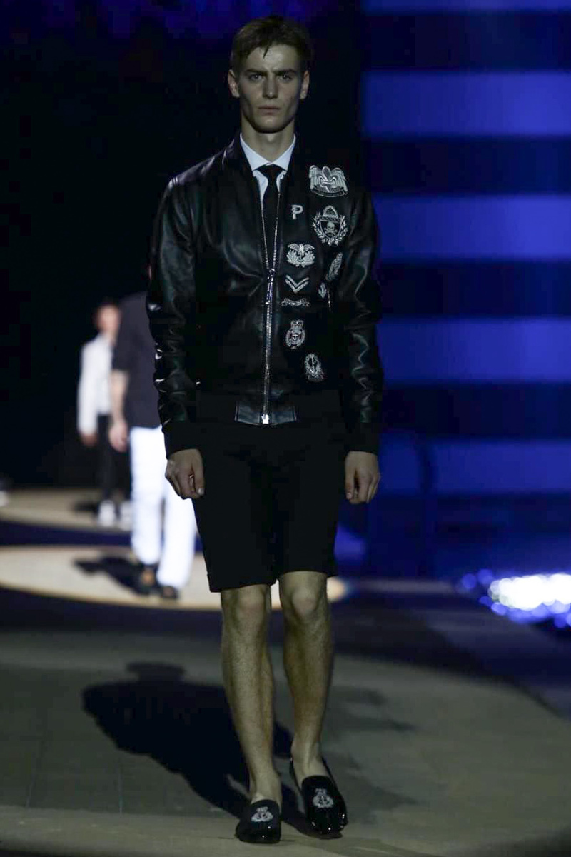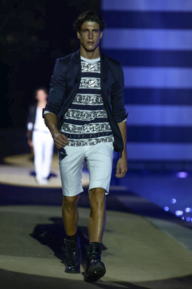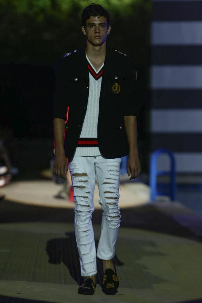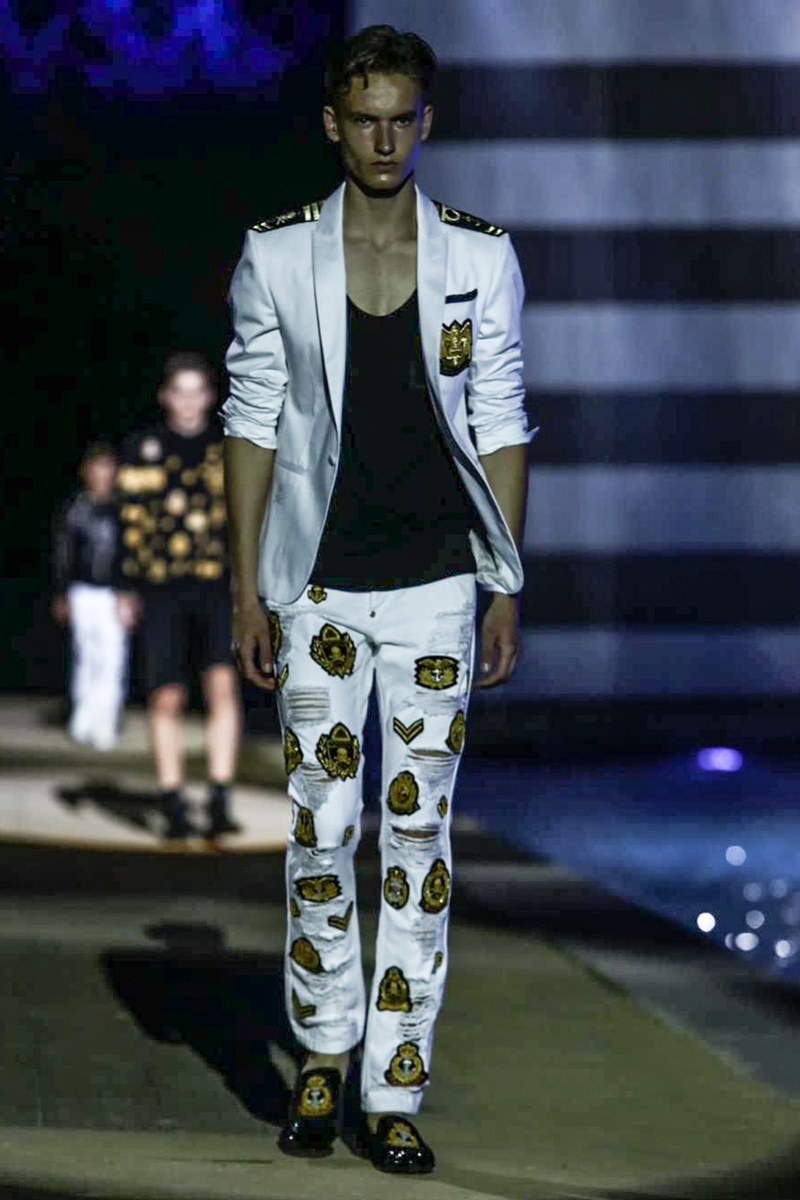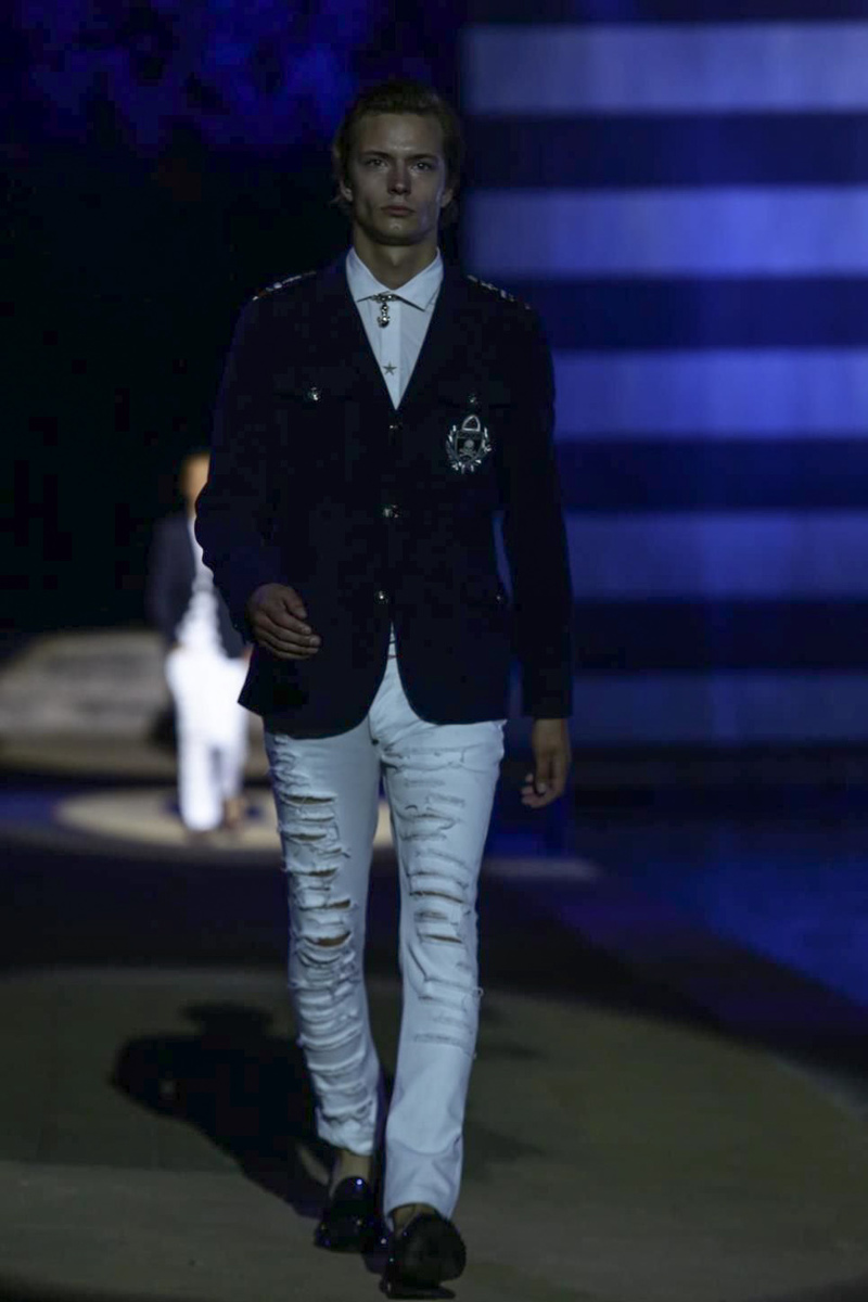 Designer Philipp Plein staged a flashy show for his spring/summer 2015 collection. Bringing back to life a public swimming pool long forgotten, Plein delivered his latest range poolside. Hitting the catwalk to the sounds of Theophilus London, nautical looks were delivered with the addition of the designer’s signature flamboyance. Here, ripped denim coexisted with emblem covered robes and piped tailored jackets. Striped v-necks and denim jackets also made the collection, contributing to a casual season with a bold voice.