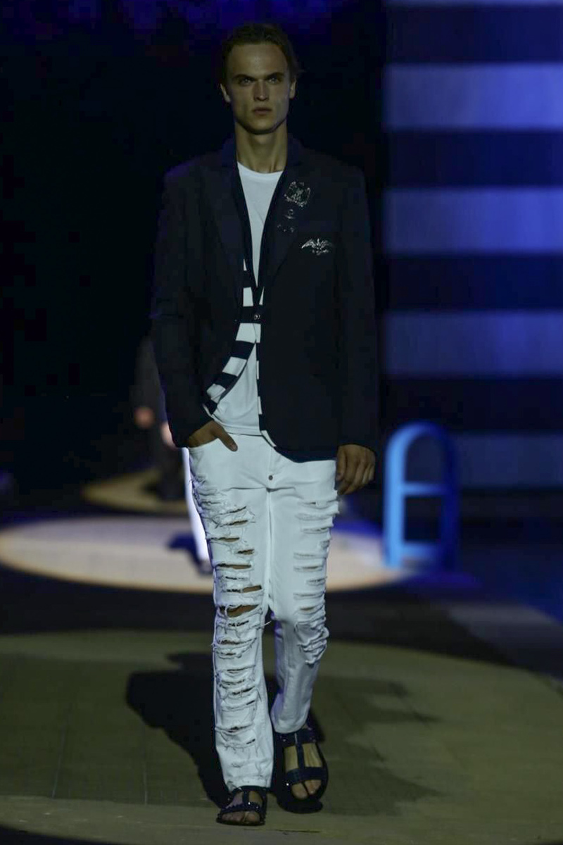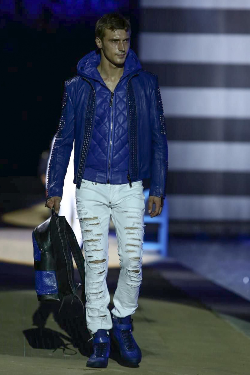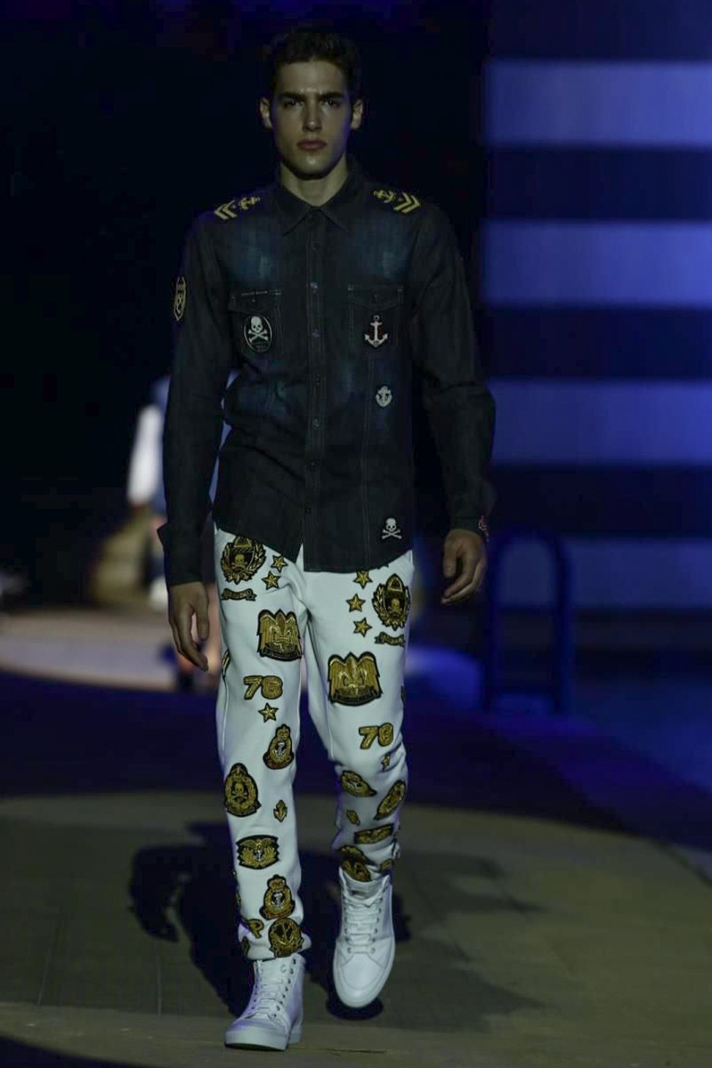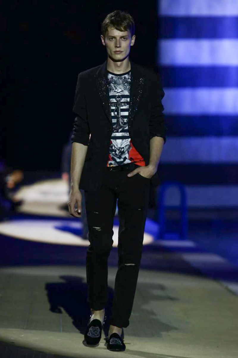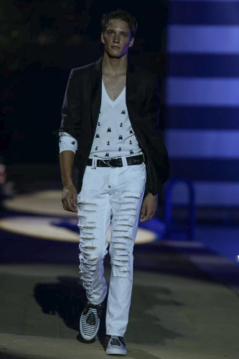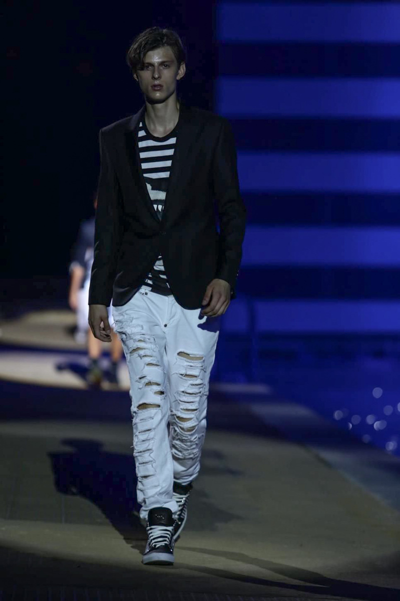 Designer Philipp Plein staged a flashy show for his spring/summer 2015 collection. Bringing back to life a public swimming pool long forgotten, Plein delivered his latest range poolside. Hitting the catwalk to the sounds of Theophilus London, nautical looks were delivered with the addition of the designer’s signature flamboyance. Here, ripped denim coexisted with emblem covered robes and piped tailored jackets. Striped v-necks and denim jackets also made the collection, contributing to a casual season with a bold voice.