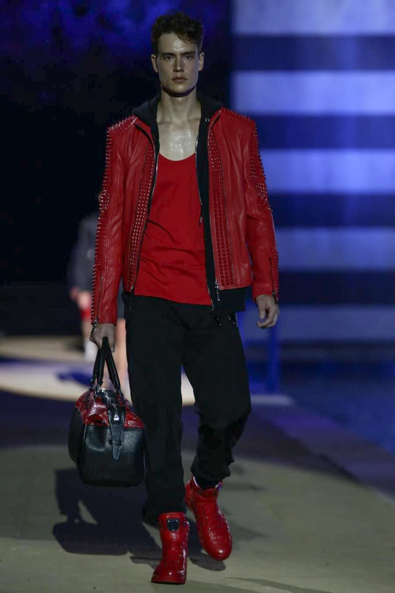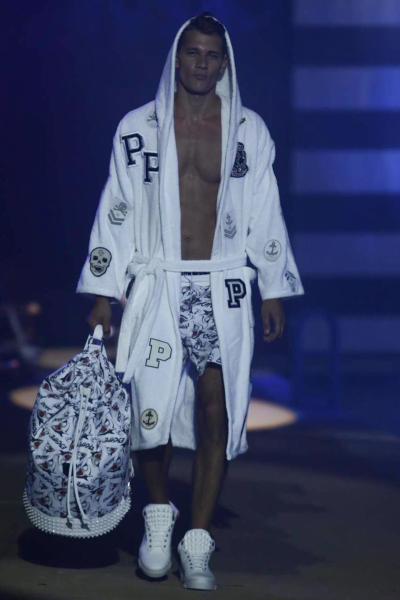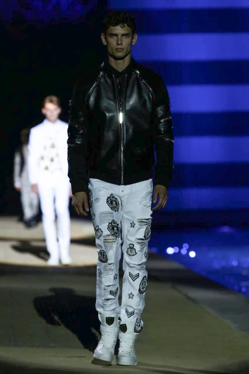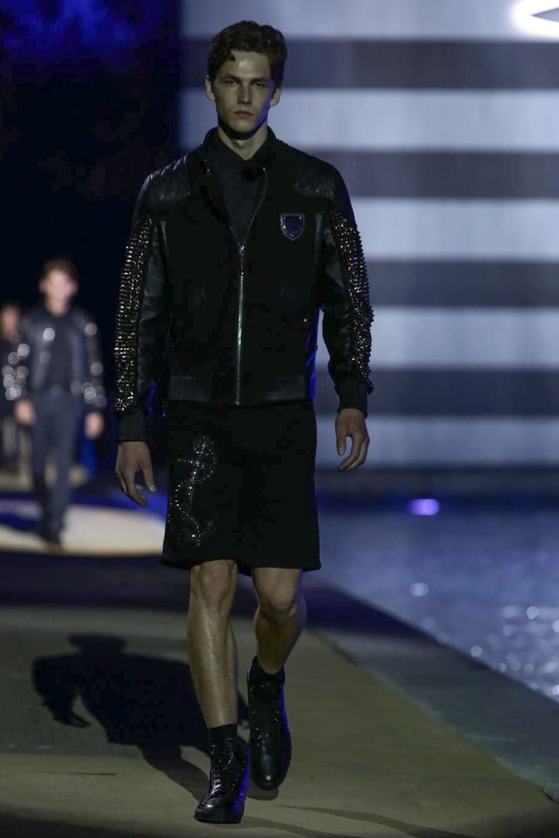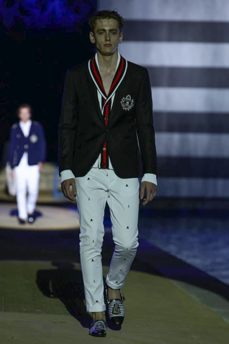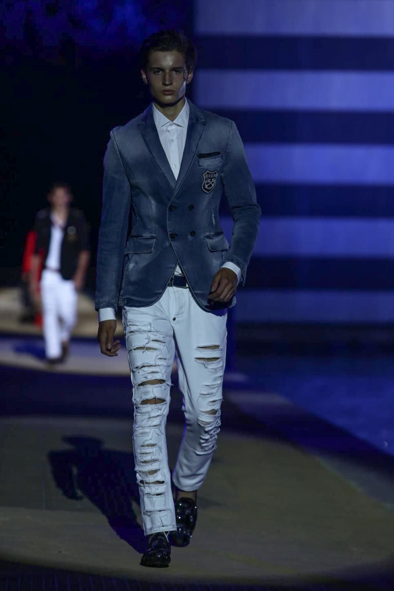 Designer Philipp Plein staged a flashy show for his spring/summer 2015 collection. Bringing back to life a public swimming pool long forgotten, Plein delivered his latest range poolside. Hitting the catwalk to the sounds of Theophilus London, nautical looks were delivered with the addition of the designer’s signature flamboyance. Here, ripped denim coexisted with emblem covered robes and piped tailored jackets. Striped v-necks and denim jackets also made the collection, contributing to a casual season with a bold voice.