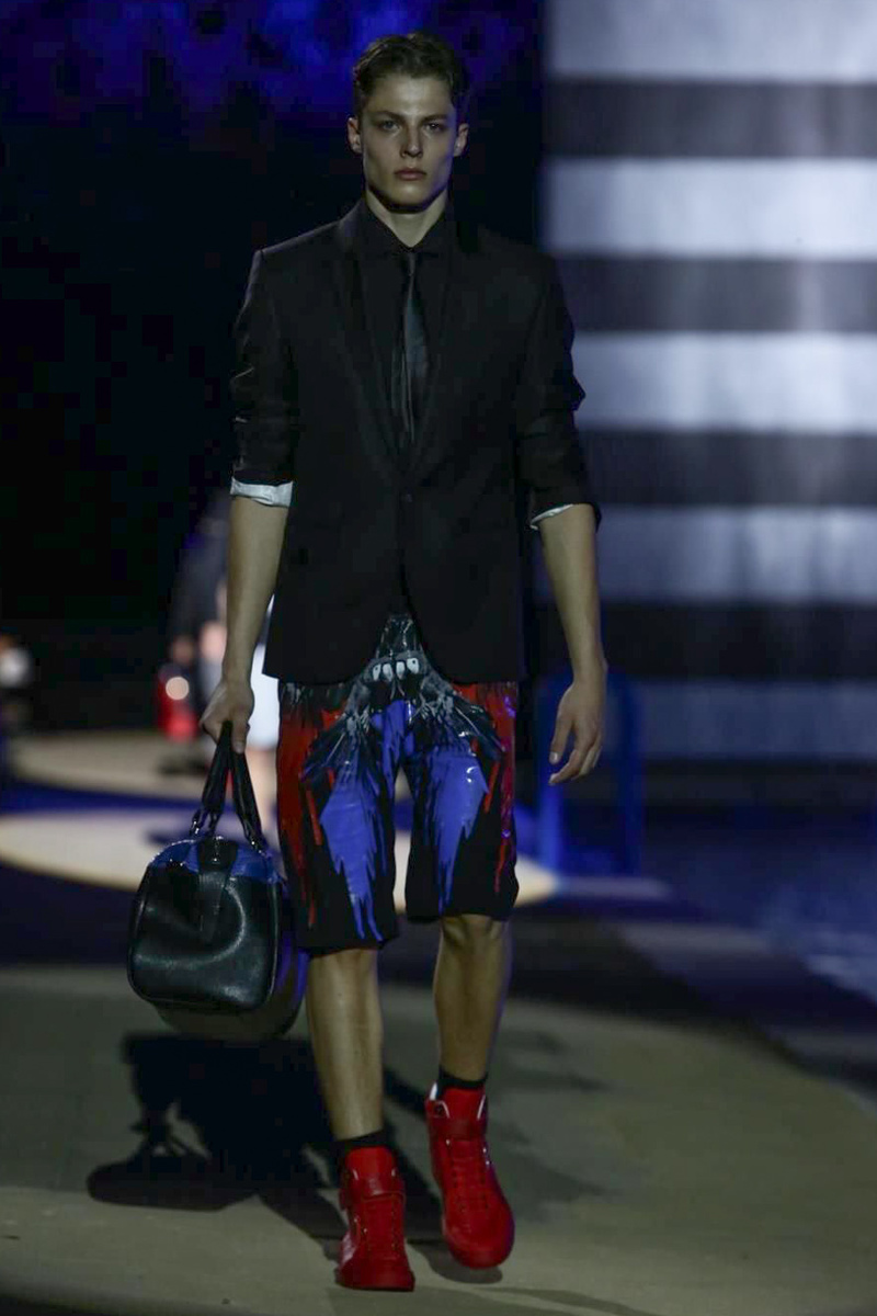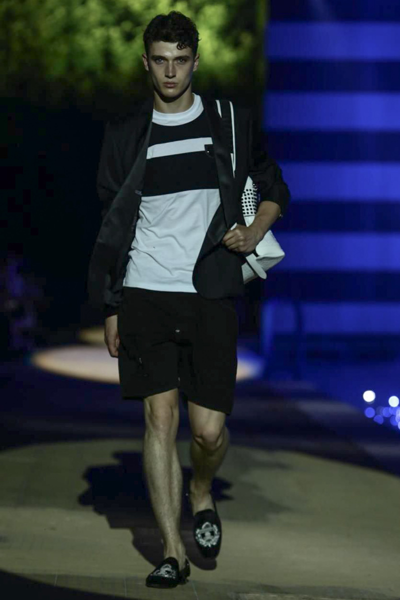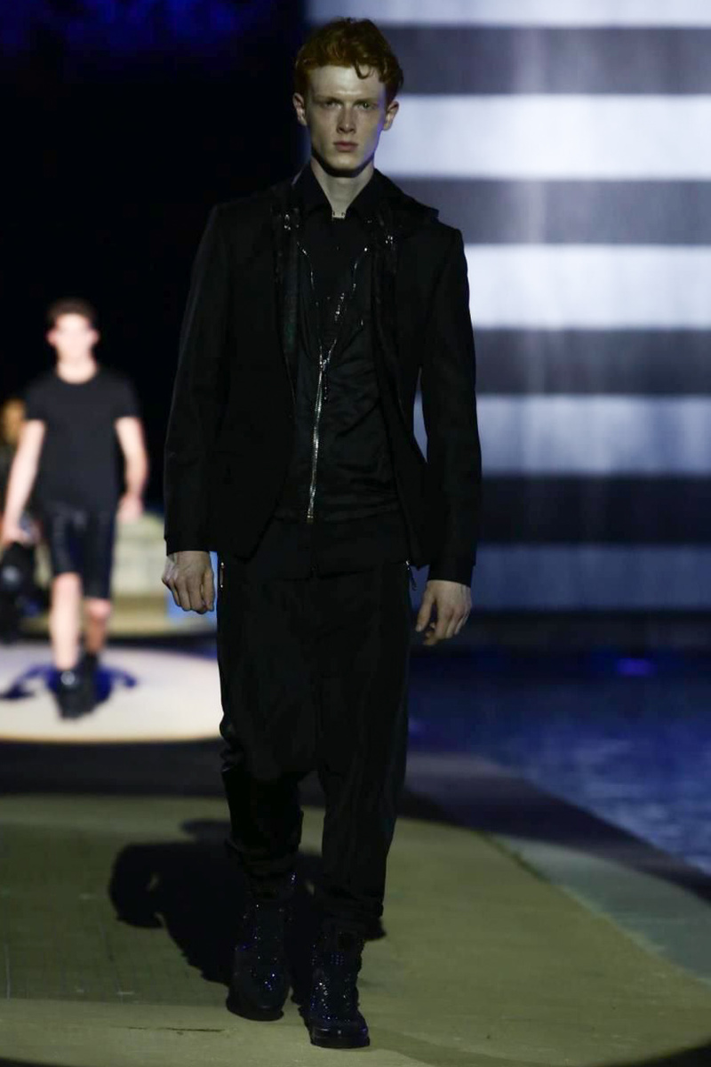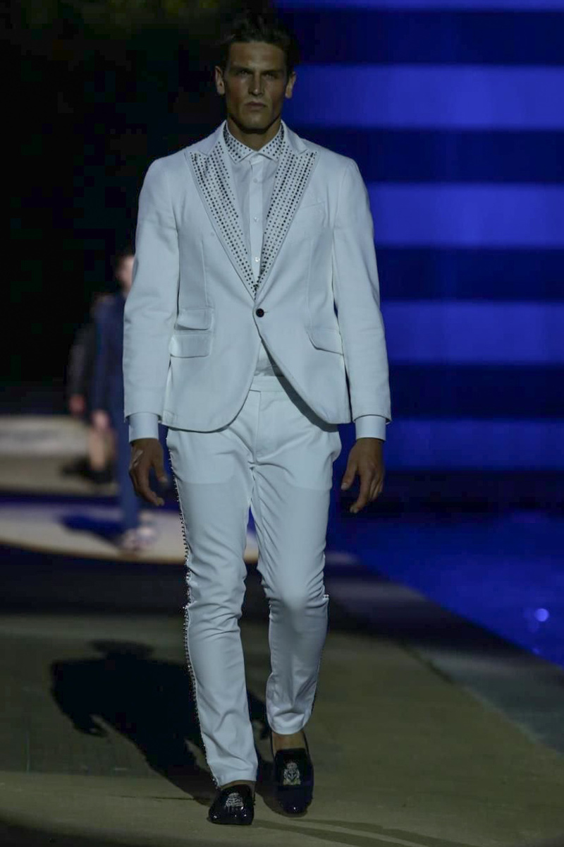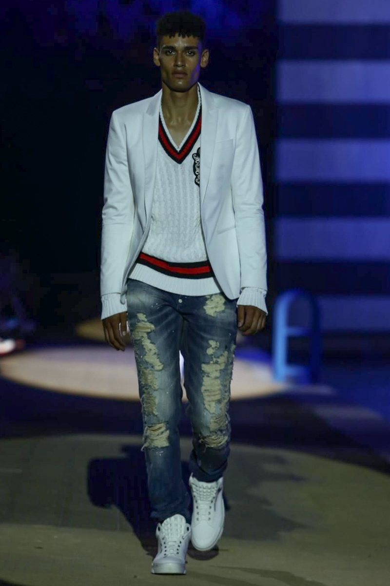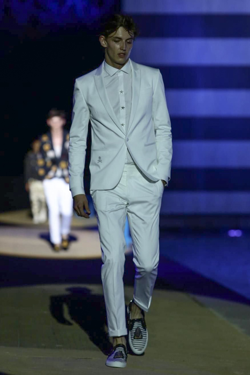 Designer Philipp Plein staged a flashy show for his spring/summer 2015 collection. Bringing back to life a public swimming pool long forgotten, Plein delivered his latest range poolside. Hitting the catwalk to the sounds of Theophilus London, nautical looks were delivered with the addition of the designer’s signature flamboyance. Here, ripped denim coexisted with emblem covered robes and piped tailored jackets. Striped v-necks and denim jackets also made the collection, contributing to a casual season with a bold voice.