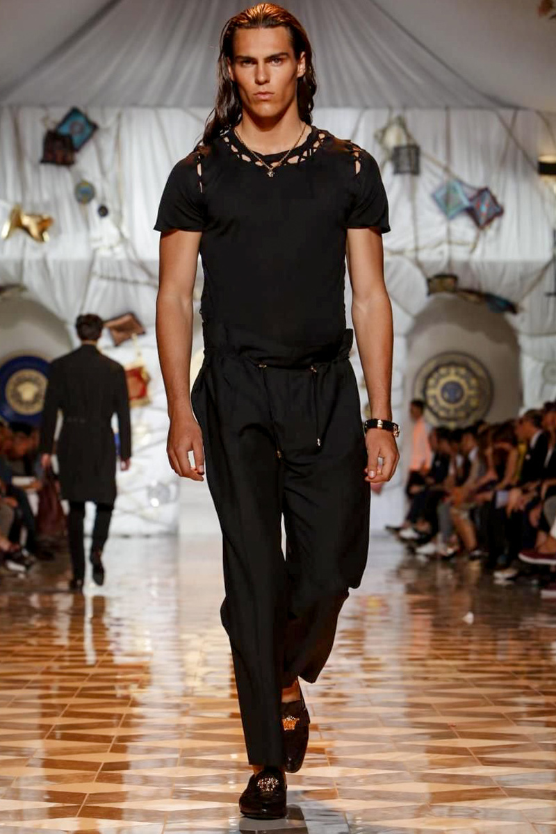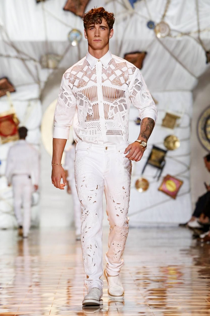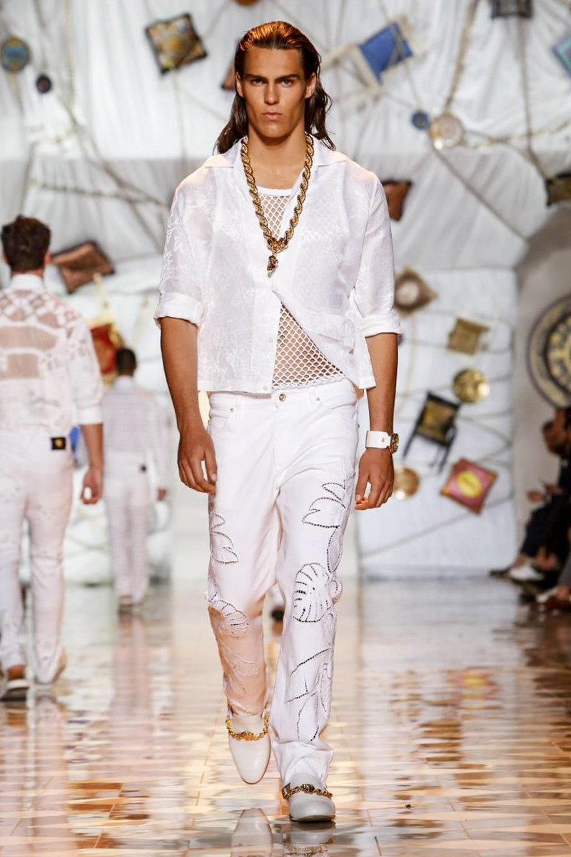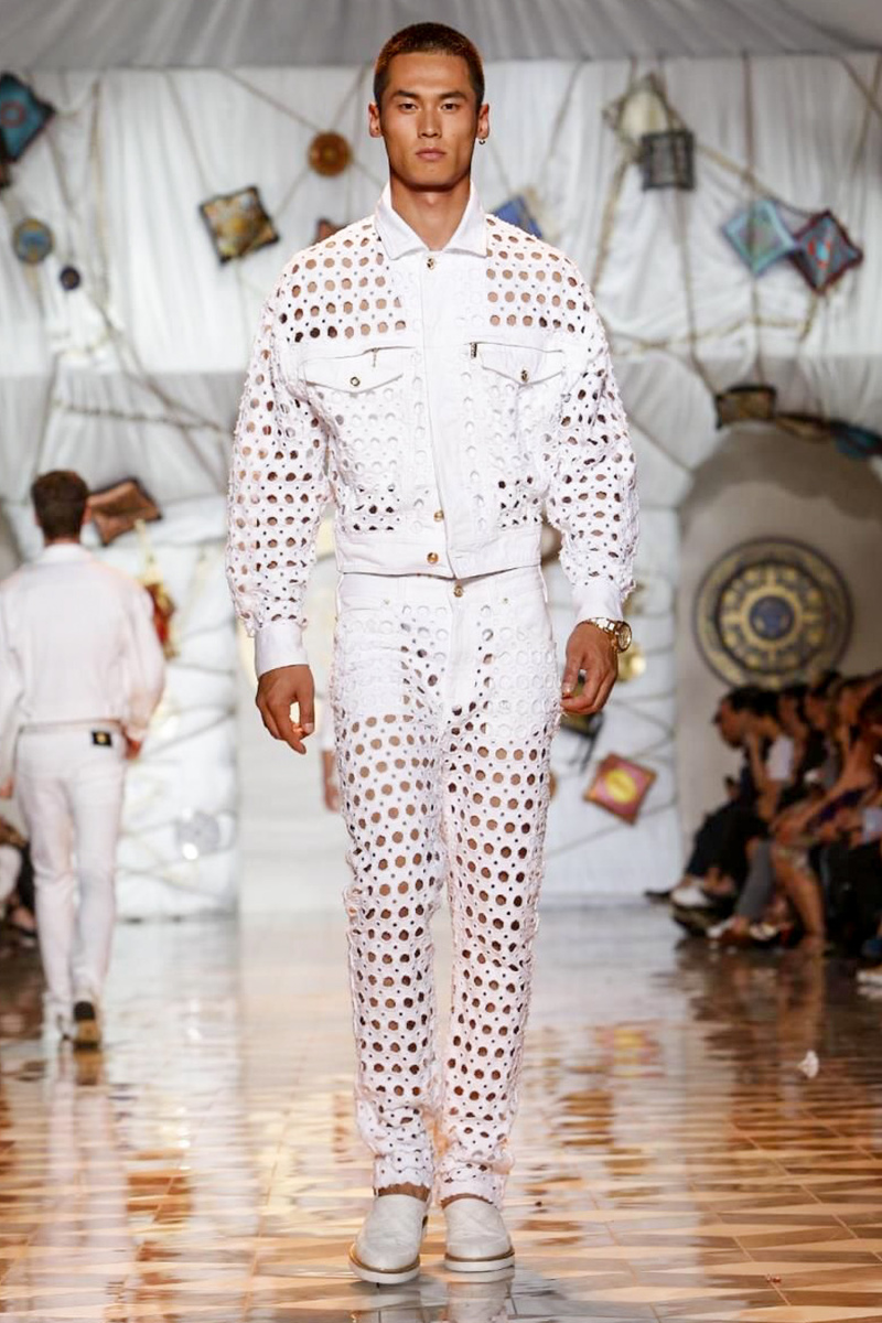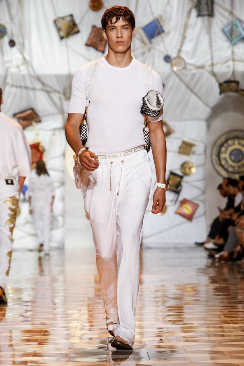 The house of Versace looked to the streets of Havana, mixed with its heritage for inspiration this season. Suiting was laid-back with tailored garments getting a colorful infusion of spirit. Meanwhile, sportswear in camel hues gave way toswimwear in a crisp white. Swimsuits, sheer tanks and more boasted a Roman attitude before revisiting Havana with Cuban graffiti prints on leather jackets. Joining the mix, leather and denim made up Versace’s signature pieces like its biker jacket. Rounding out the collection with stylish but utilitarian accessories, items such as a picnic bag carried the label’s homewares.
