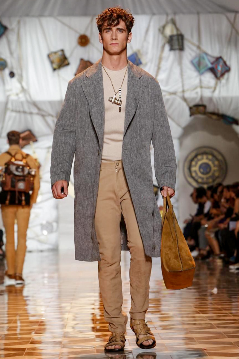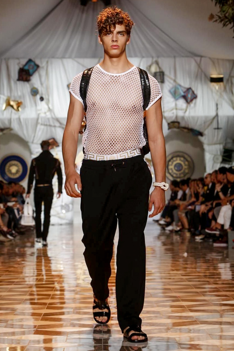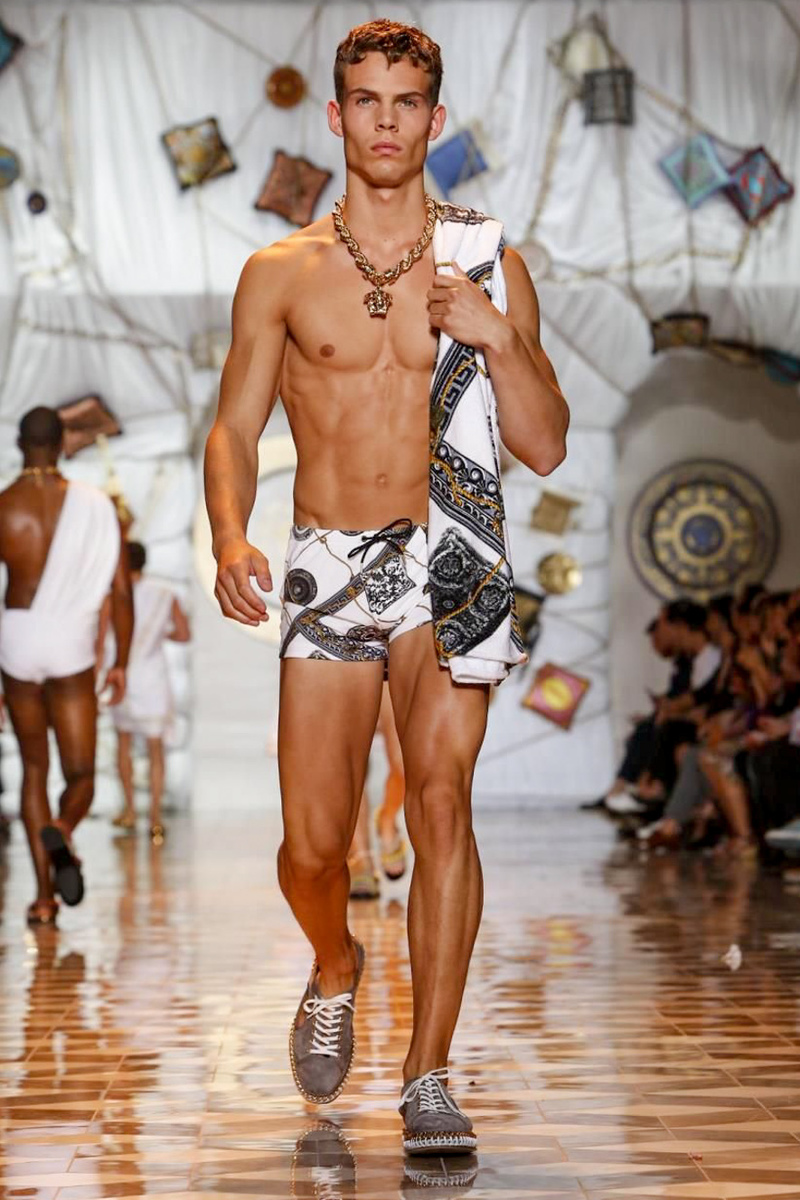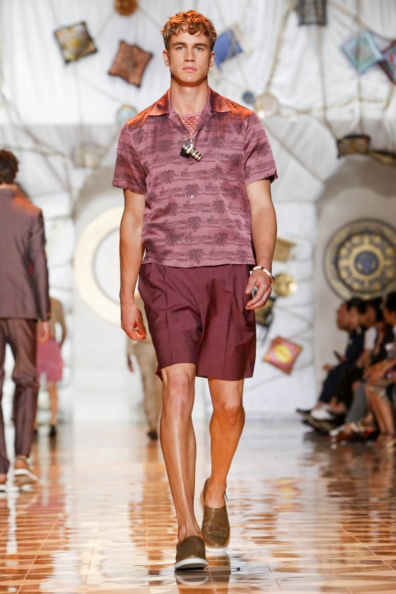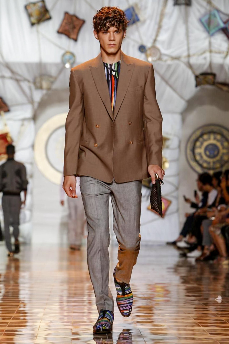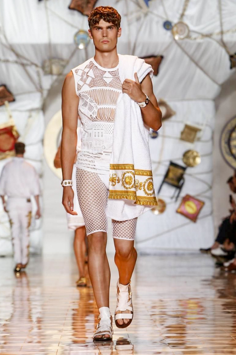 The house of Versace looked to the streets of Havana, mixed with its heritage for inspiration this season. Suiting was laid-back with tailored garments getting a colorful infusion of spirit. Meanwhile, sportswear in camel hues gave way toswimwear in a crisp white. Swimsuits, sheer tanks and more boasted a Roman attitude before revisiting Havana with Cuban graffiti prints on leather jackets. Joining the mix, leather and denim made up Versace’s signature pieces like its biker jacket. Rounding out the collection with stylish but utilitarian accessories, items such as a picnic bag carried the label’s homewares.