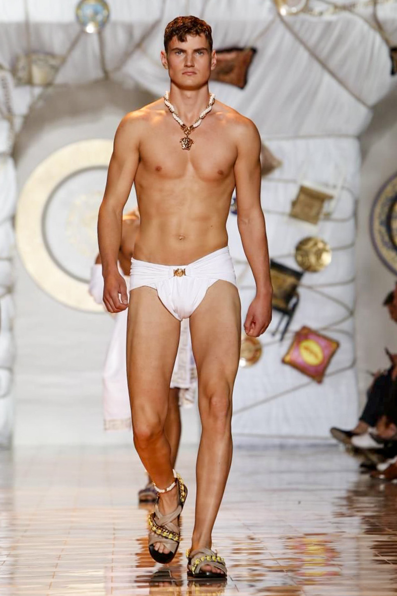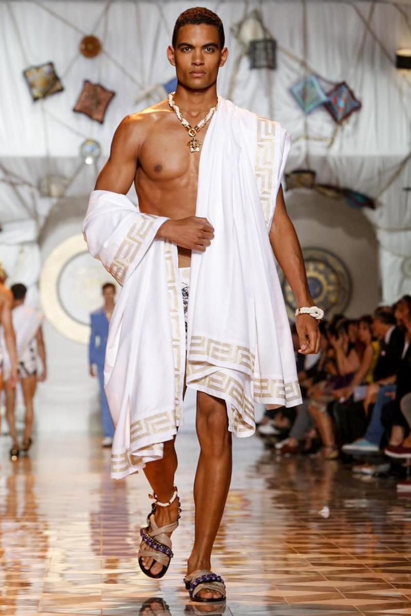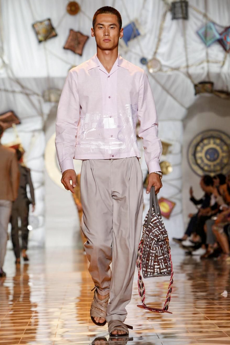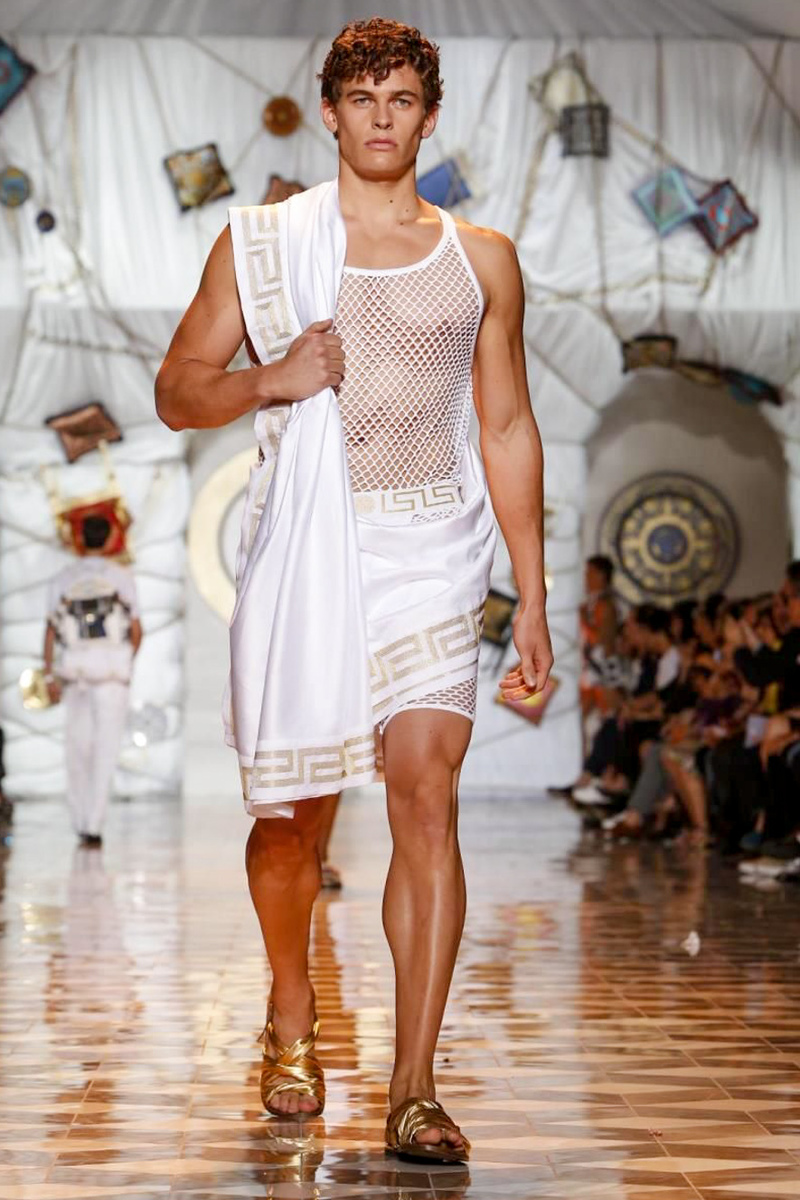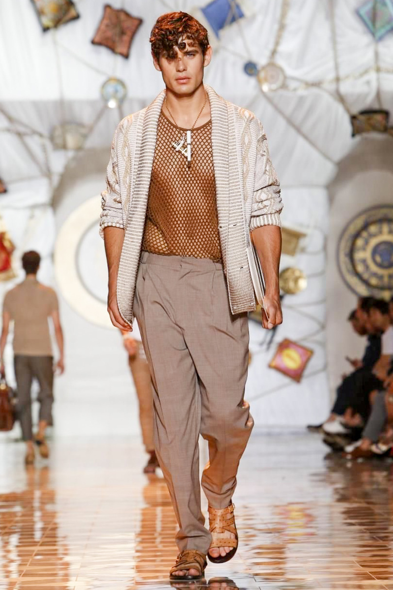 The house of Versace looked to the streets of Havana, mixed with its heritage for inspiration this season. Suiting was laid-back with tailored garments getting a colorful infusion of spirit. Meanwhile, sportswear in camel hues gave way toswimwear in a crisp white. Swimsuits, sheer tanks and more boasted a Roman attitude before revisiting Havana with Cuban graffiti prints on leather jackets. Joining the mix, leather and denim made up Versace’s signature pieces like its biker jacket. Rounding out the collection with stylish but utilitarian accessories, items such as a picnic bag carried the label’s homewares.