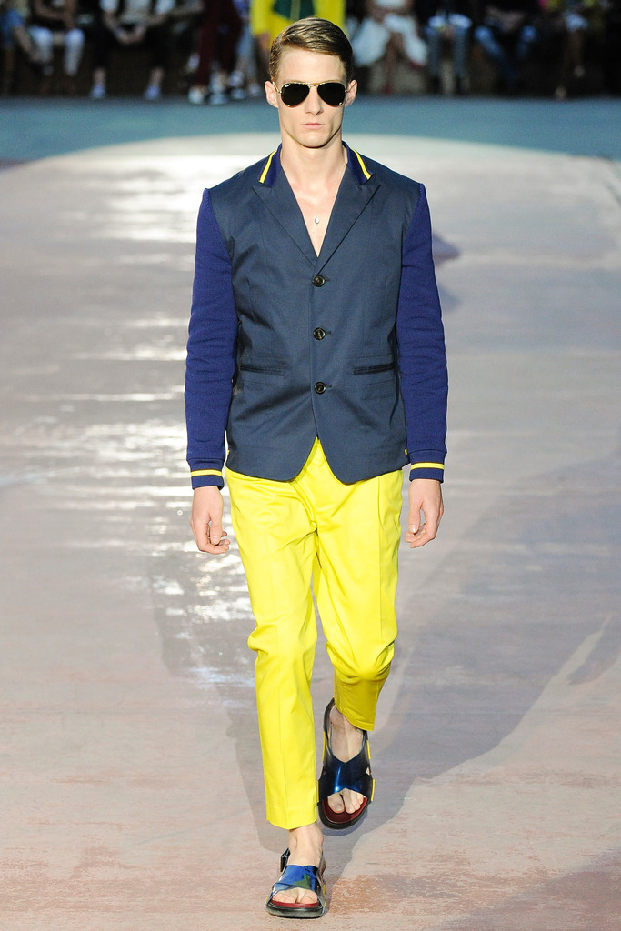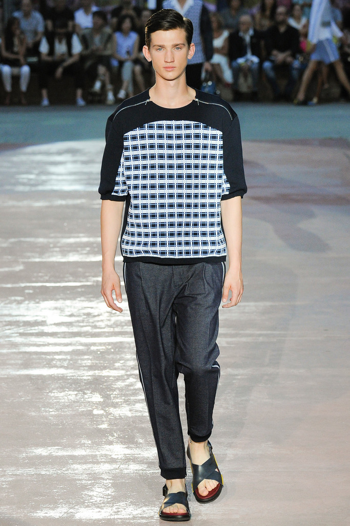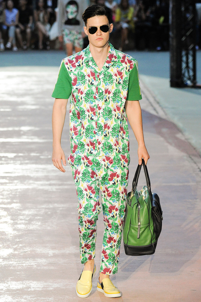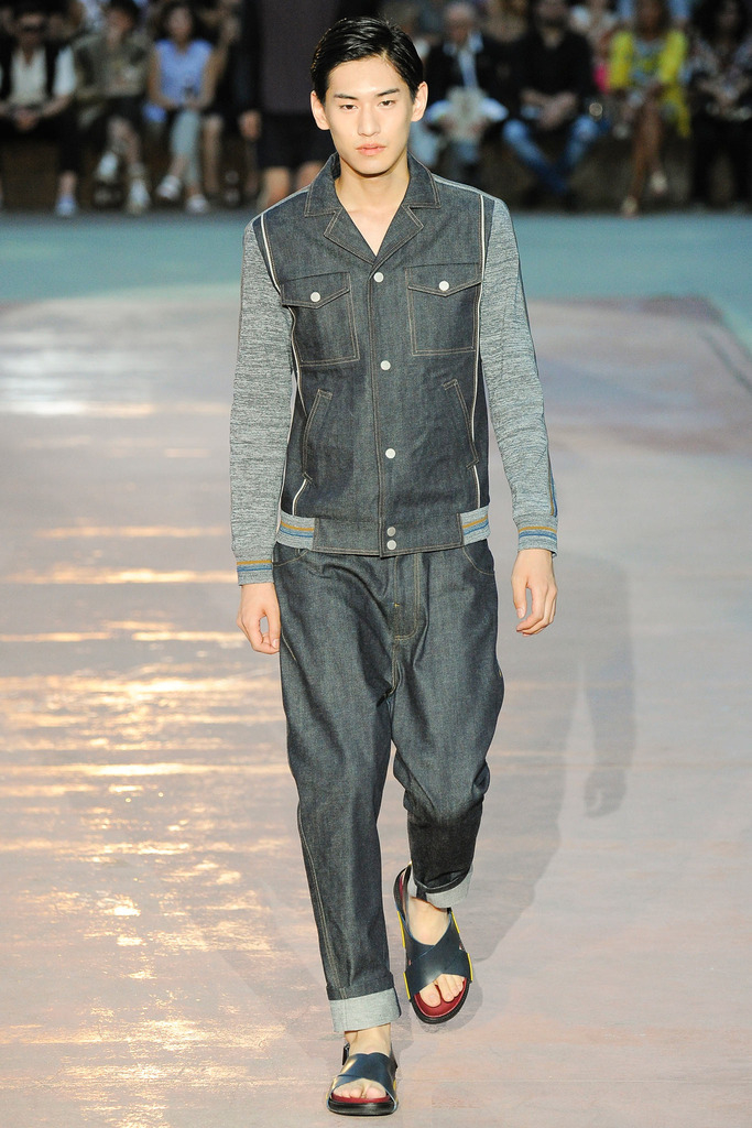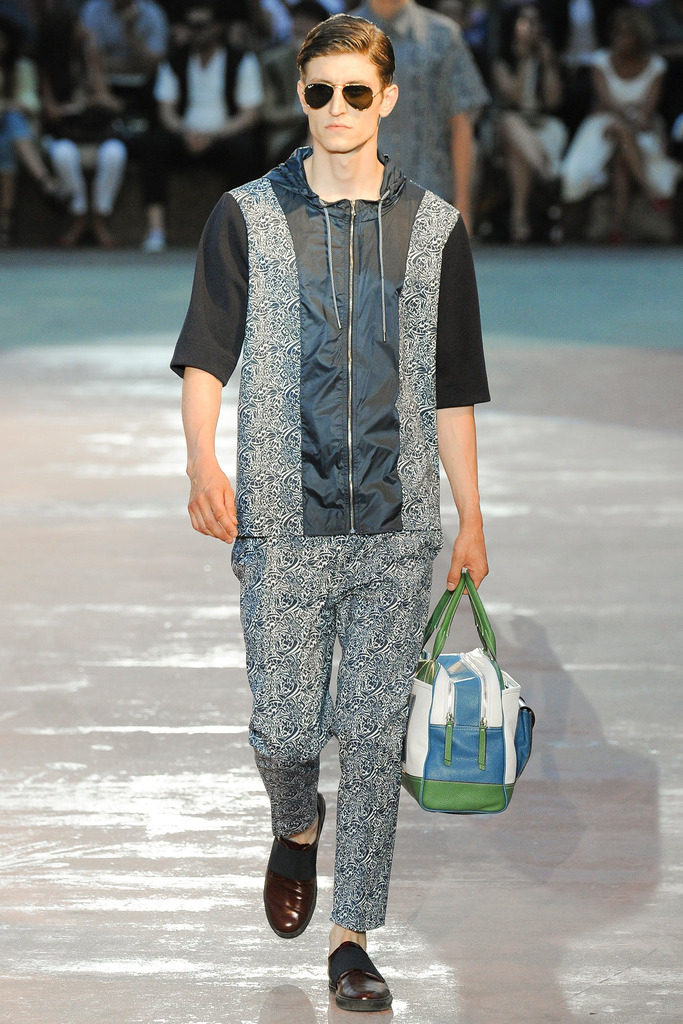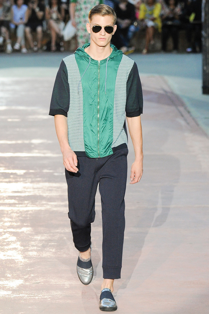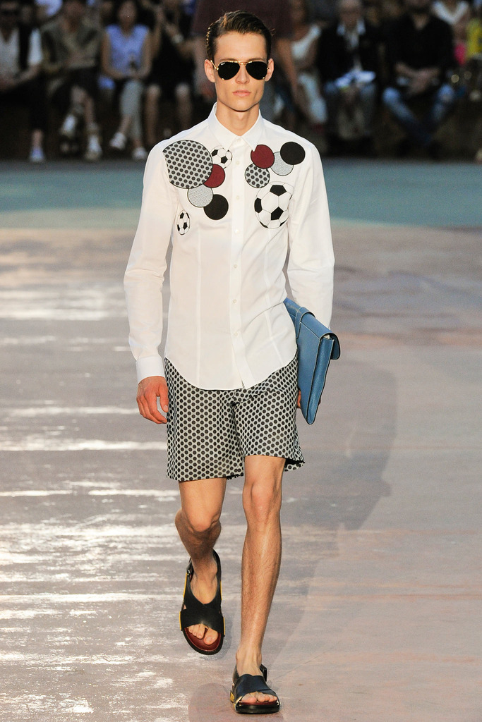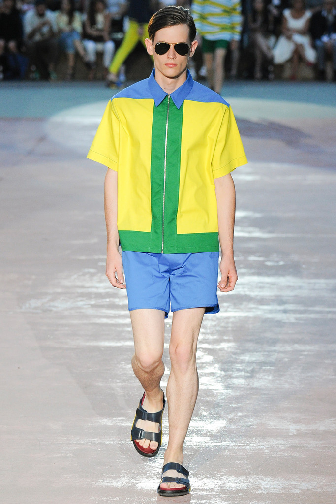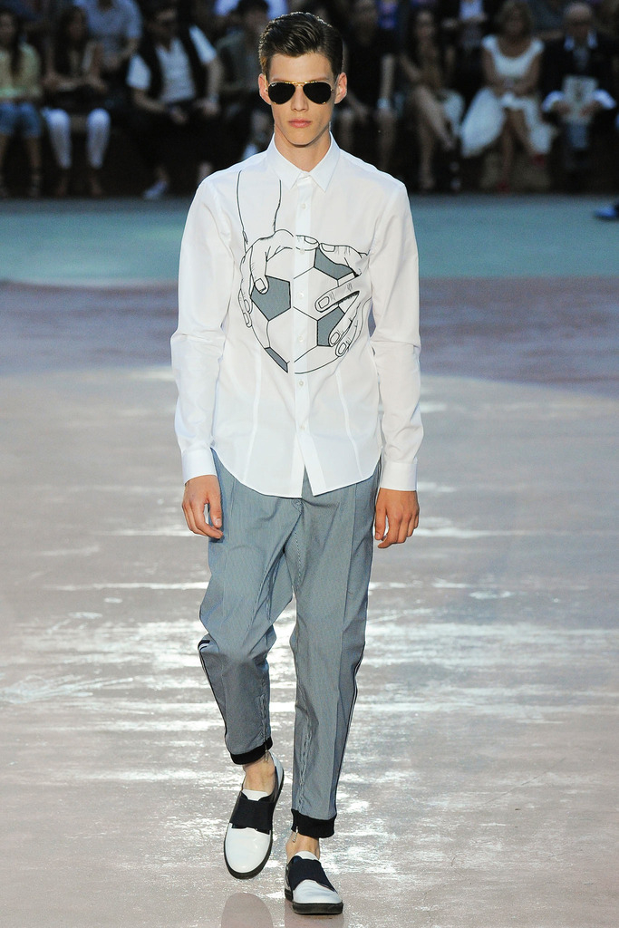 Timely with the 2014 World Cup in full swing, designer Antonio Marras looked to the sport of soccer for inspiration when approaching his spring/summer 2015 collection. The popular sport provided an infectious new vehicle for Marras’ designs. Juxtaposed with a 1950s style reference, printed trousers were cropped and paired with a fun selection of shirting, ranging from short-sleeve shirts with graphics to hooded shirts with printed panels. Along for the ride were green and yellow ensembles undoubtedly inspired by São Paulo, Brazil. Marras also strikes up a casual jester with the use of denim, reinventing the classic in a tailored form. Pair that with shirts dressed in soccer balls, polka dots and vertical lines–you had a winning collection or shall we say a winning goal!