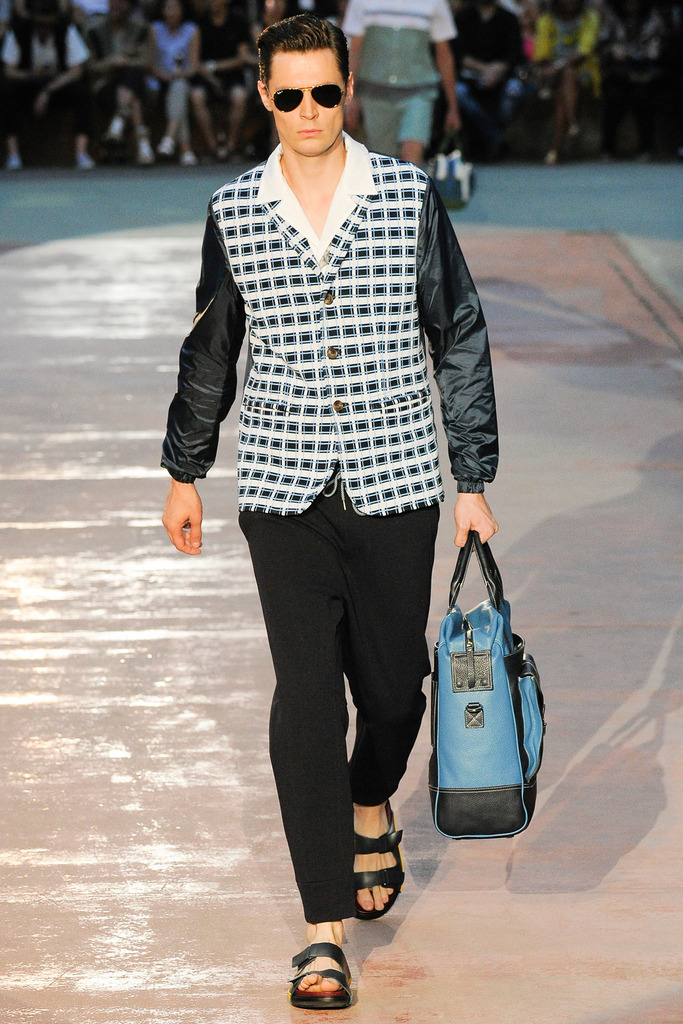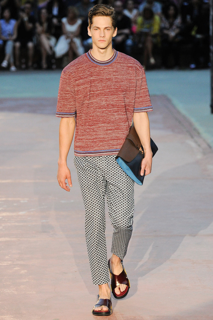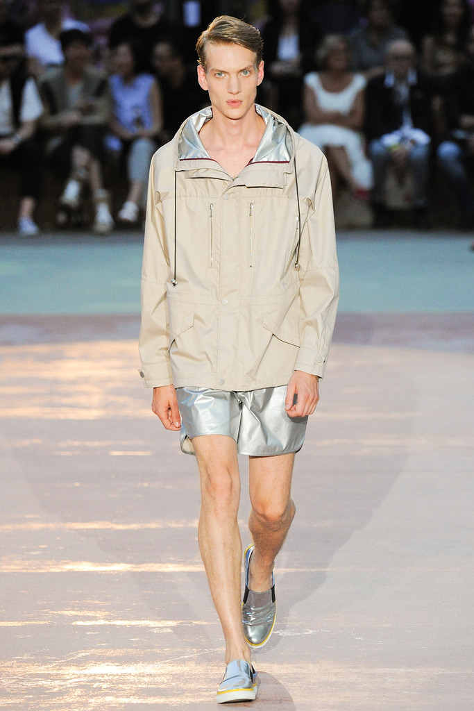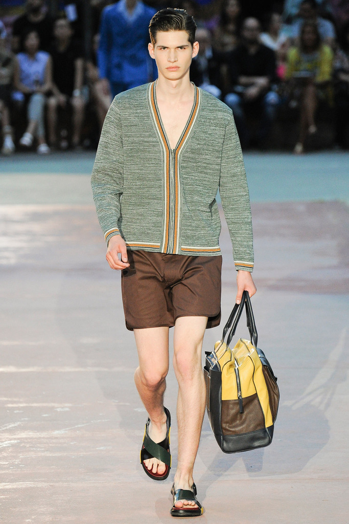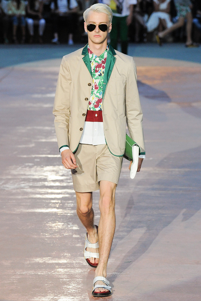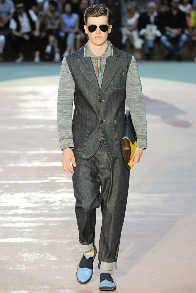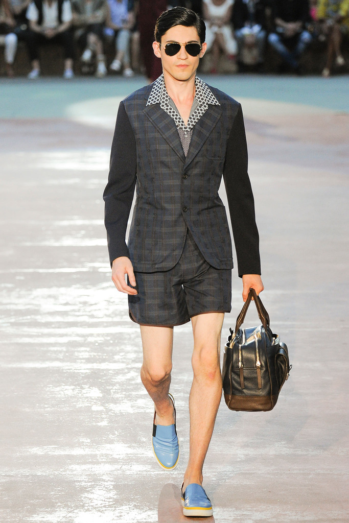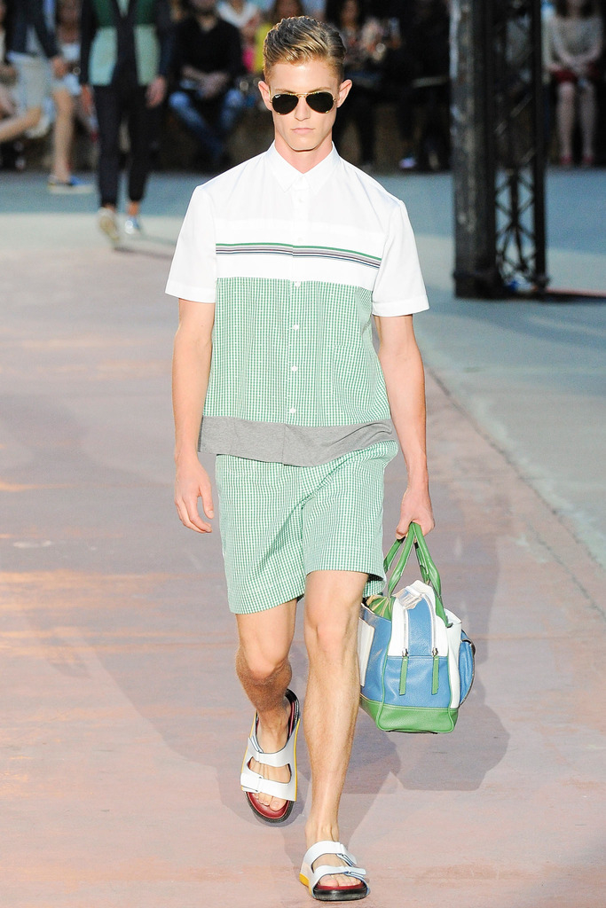 Timely with the 2014 World Cup in full swing, designer Antonio Marras looked to the sport of soccer for inspiration when approaching his spring/summer 2015 collection. The popular sport provided an infectious new vehicle for Marras’ designs. Juxtaposed with a 1950s style reference, printed trousers were cropped and paired with a fun selection of shirting, ranging from short-sleeve shirts with graphics to hooded shirts with printed panels. Along for the ride were green and yellow ensembles undoubtedly inspired by São Paulo, Brazil. Marras also strikes up a casual jester with the use of denim, reinventing the classic in a tailored form. Pair that with shirts dressed in soccer balls, polka dots and vertical lines–you had a winning collection or shall we say a winning goal!