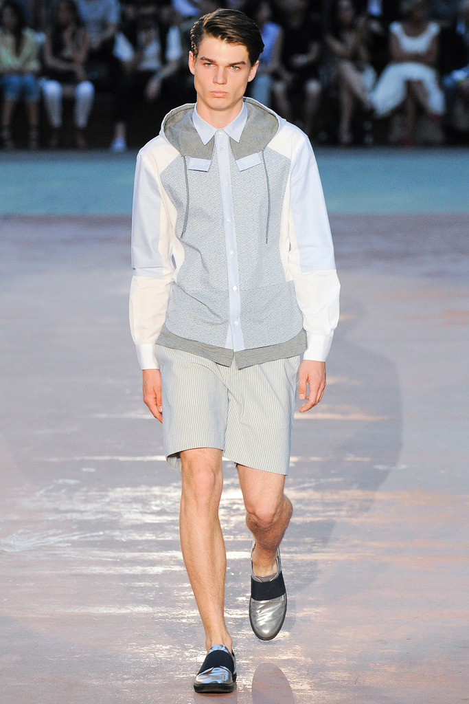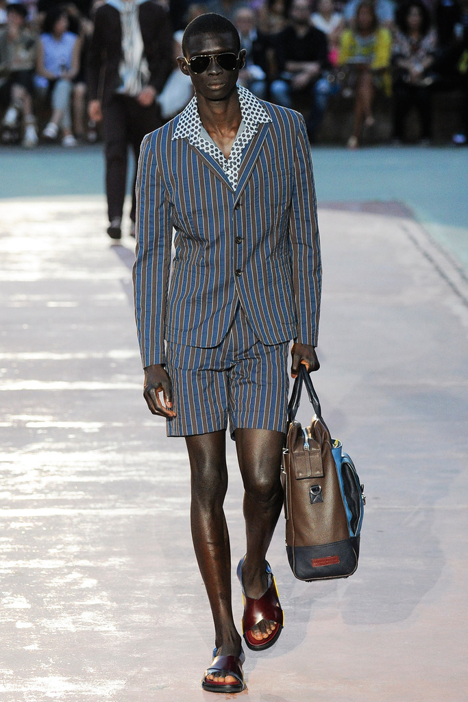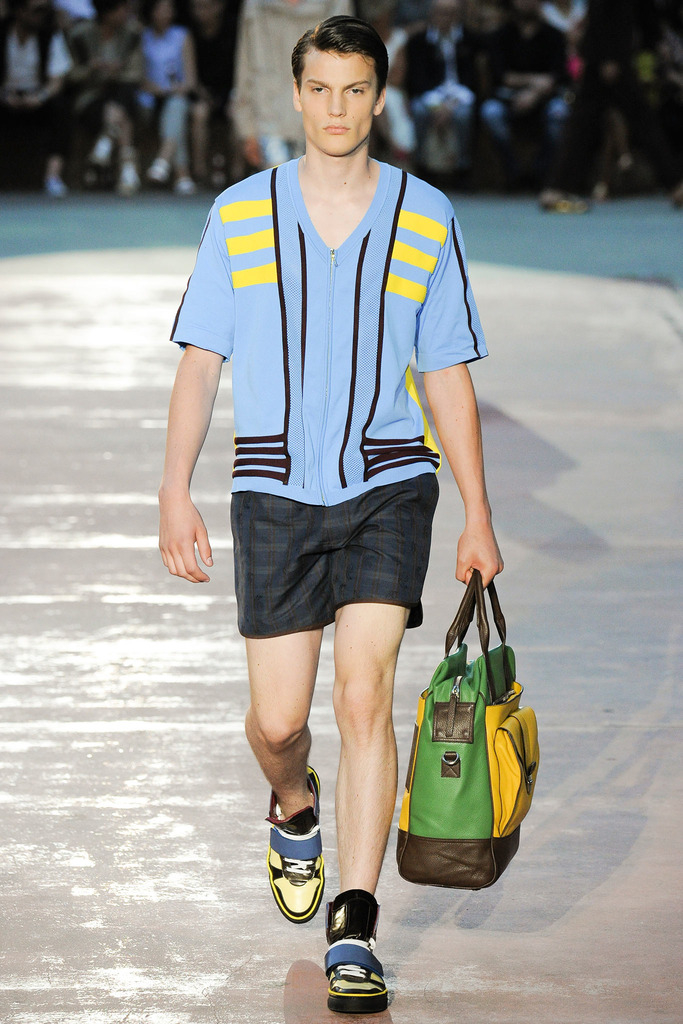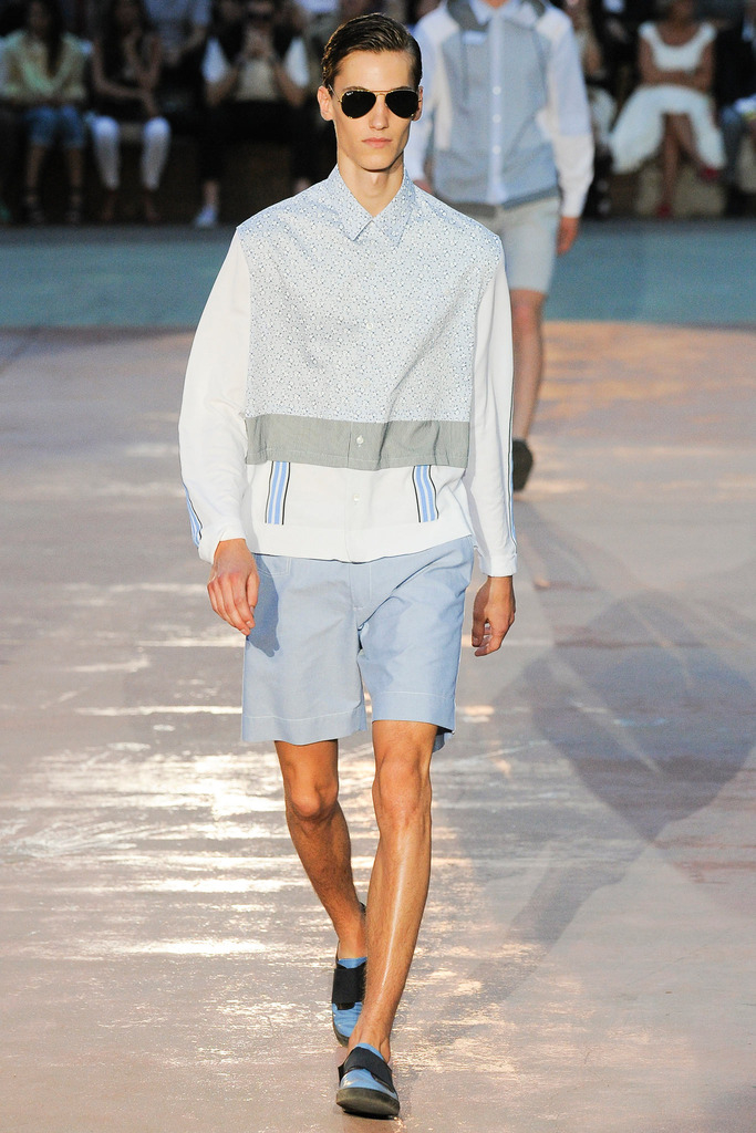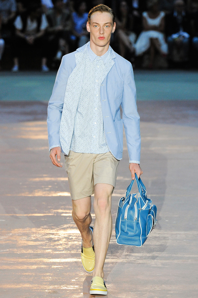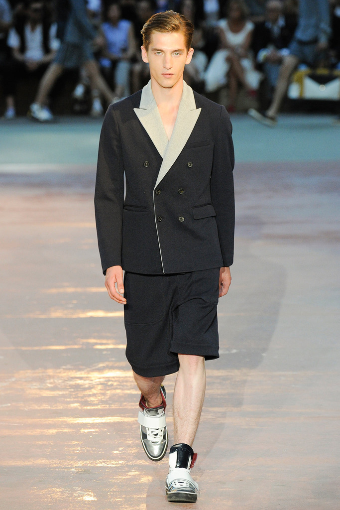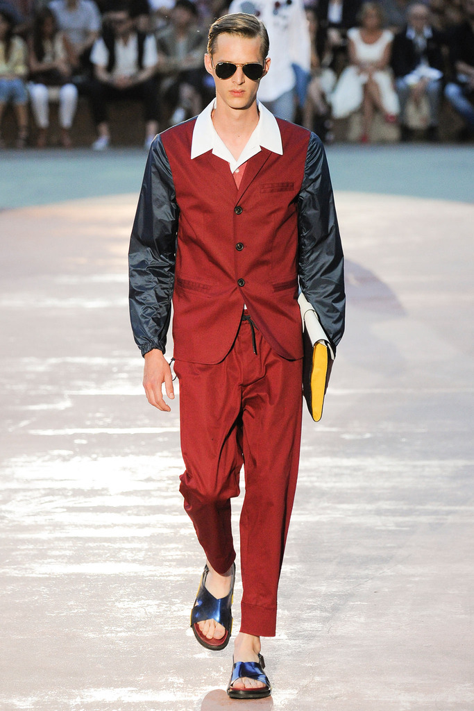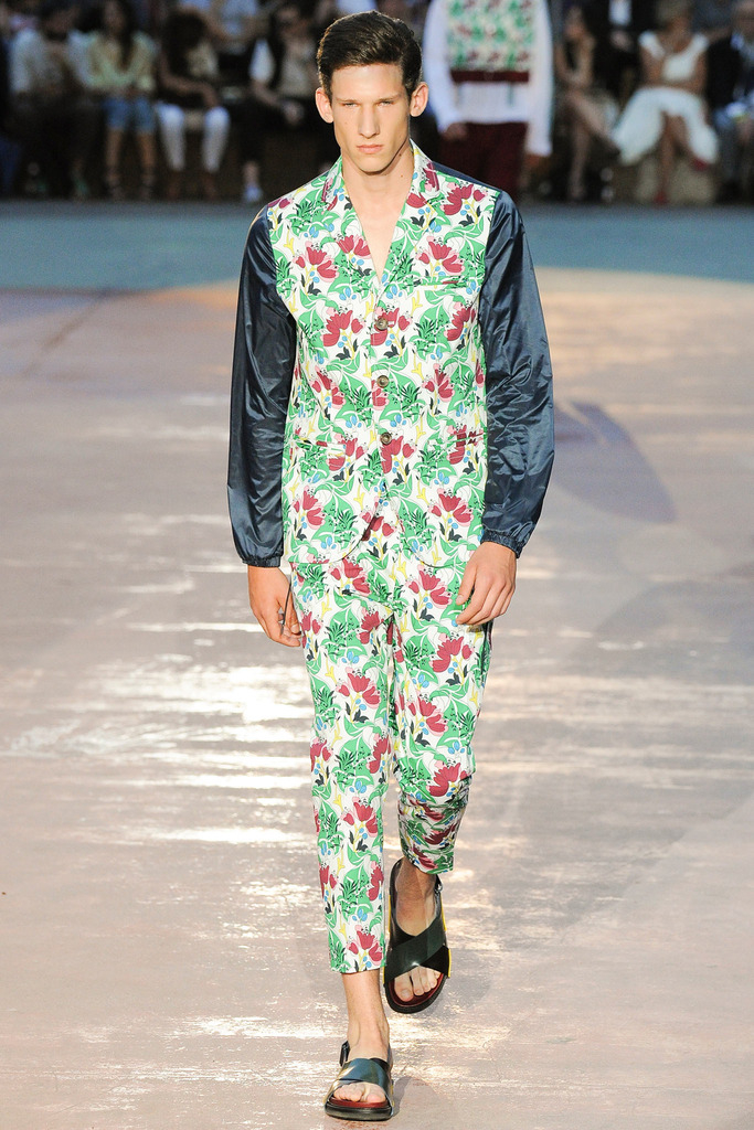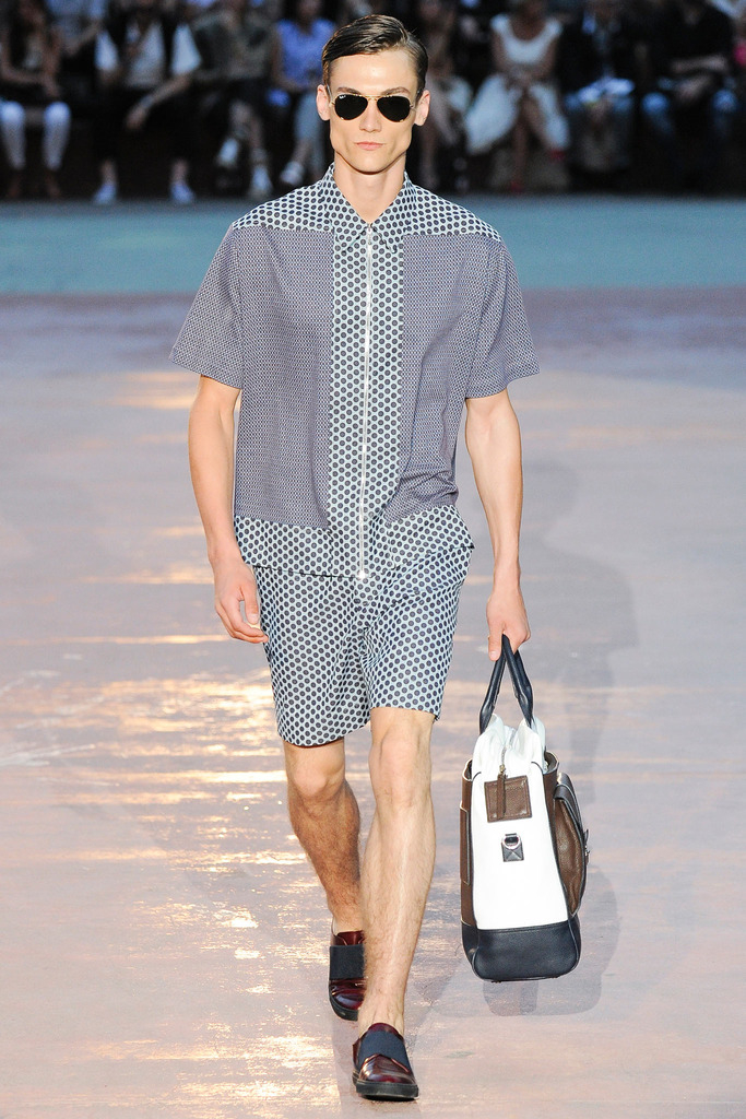 Timely with the 2014 World Cup in full swing, designer Antonio Marras looked to the sport of soccer for inspiration when approaching his spring/summer 2015 collection. The popular sport provided an infectious new vehicle for Marras’ designs. Juxtaposed with a 1950s style reference, printed trousers were cropped and paired with a fun selection of shirting, ranging from short-sleeve shirts with graphics to hooded shirts with printed panels. Along for the ride were green and yellow ensembles undoubtedly inspired by São Paulo, Brazil. Marras also strikes up a casual jester with the use of denim, reinventing the classic in a tailored form. Pair that with shirts dressed in soccer balls, polka dots and vertical lines–you had a winning collection or shall we say a winning goal!