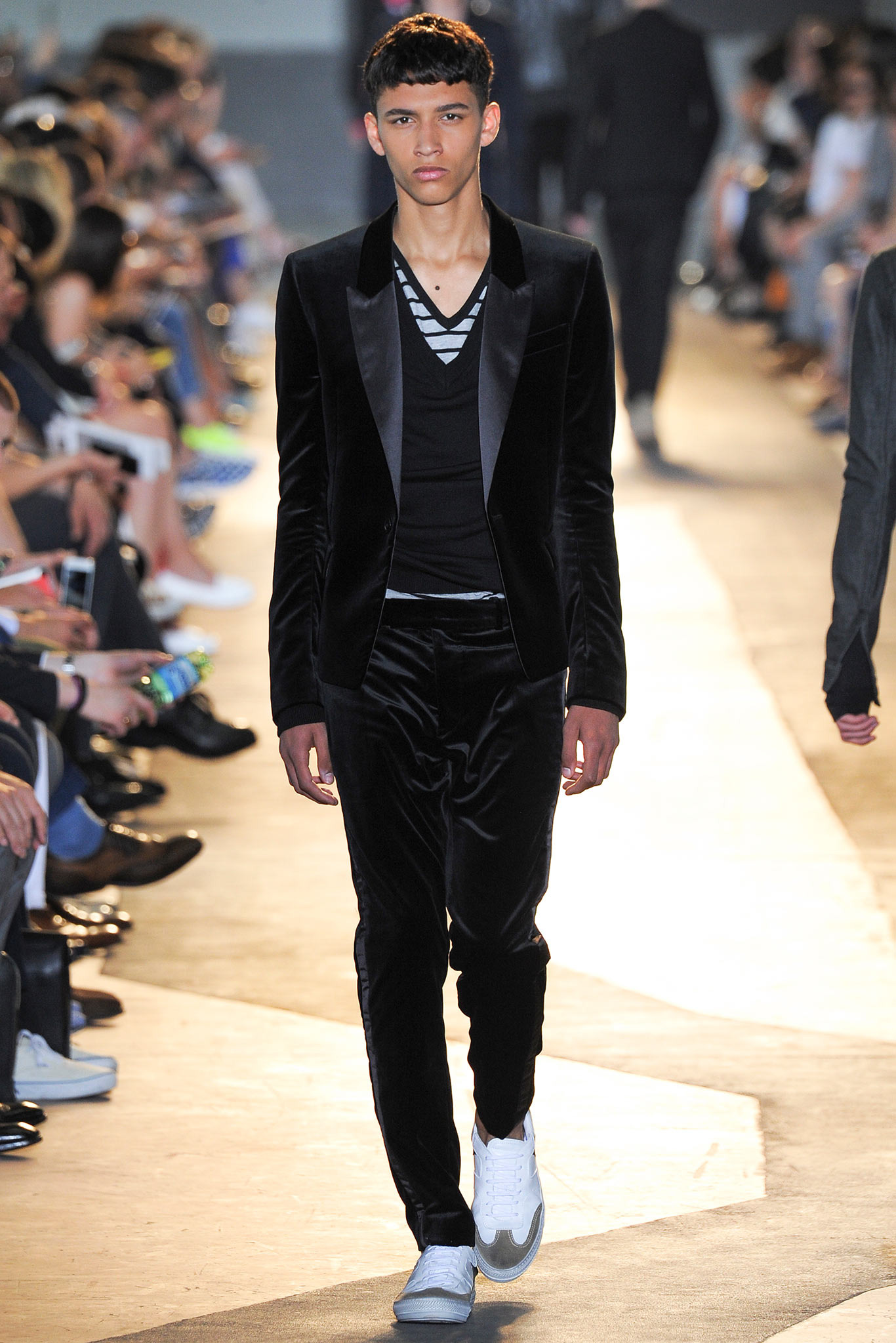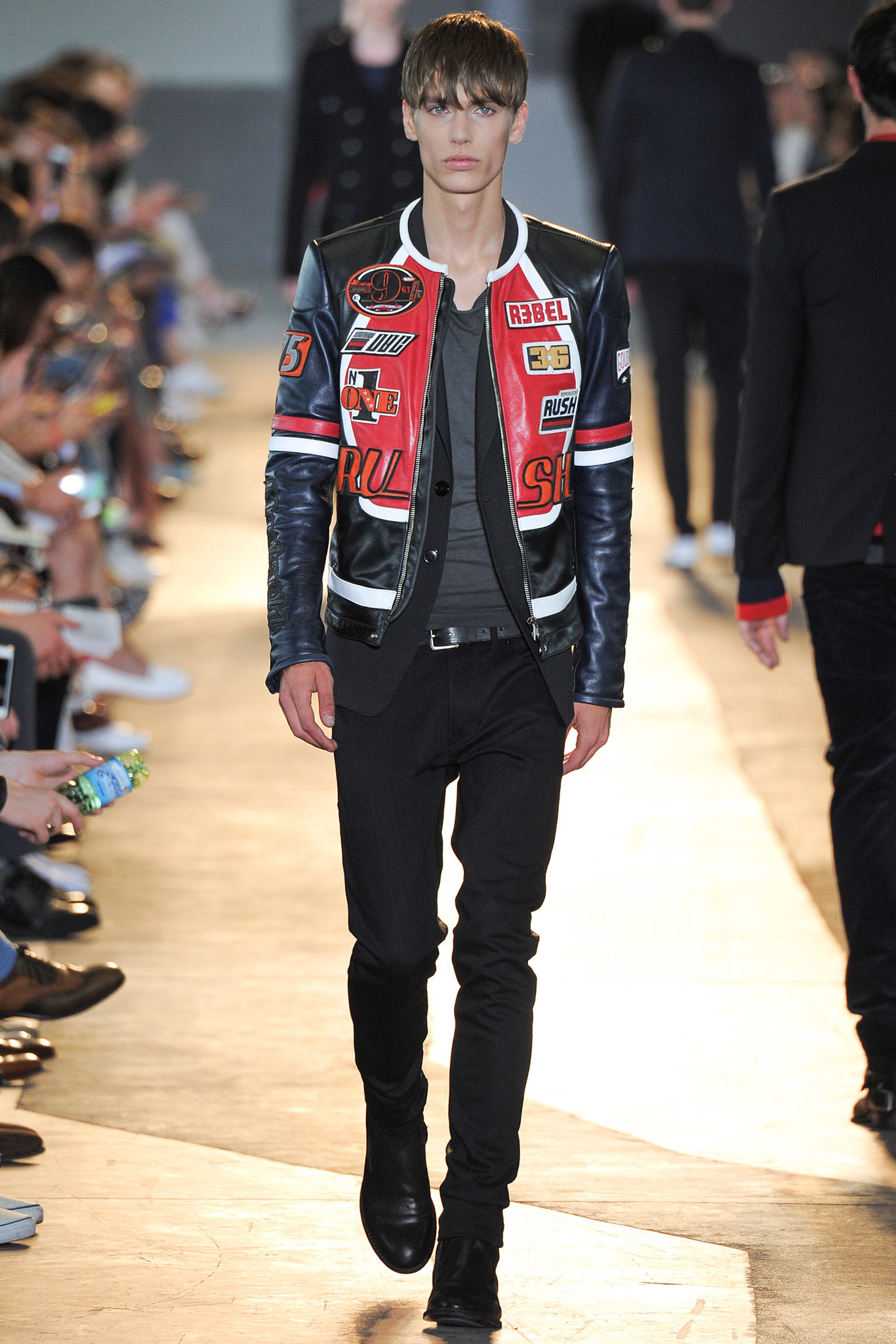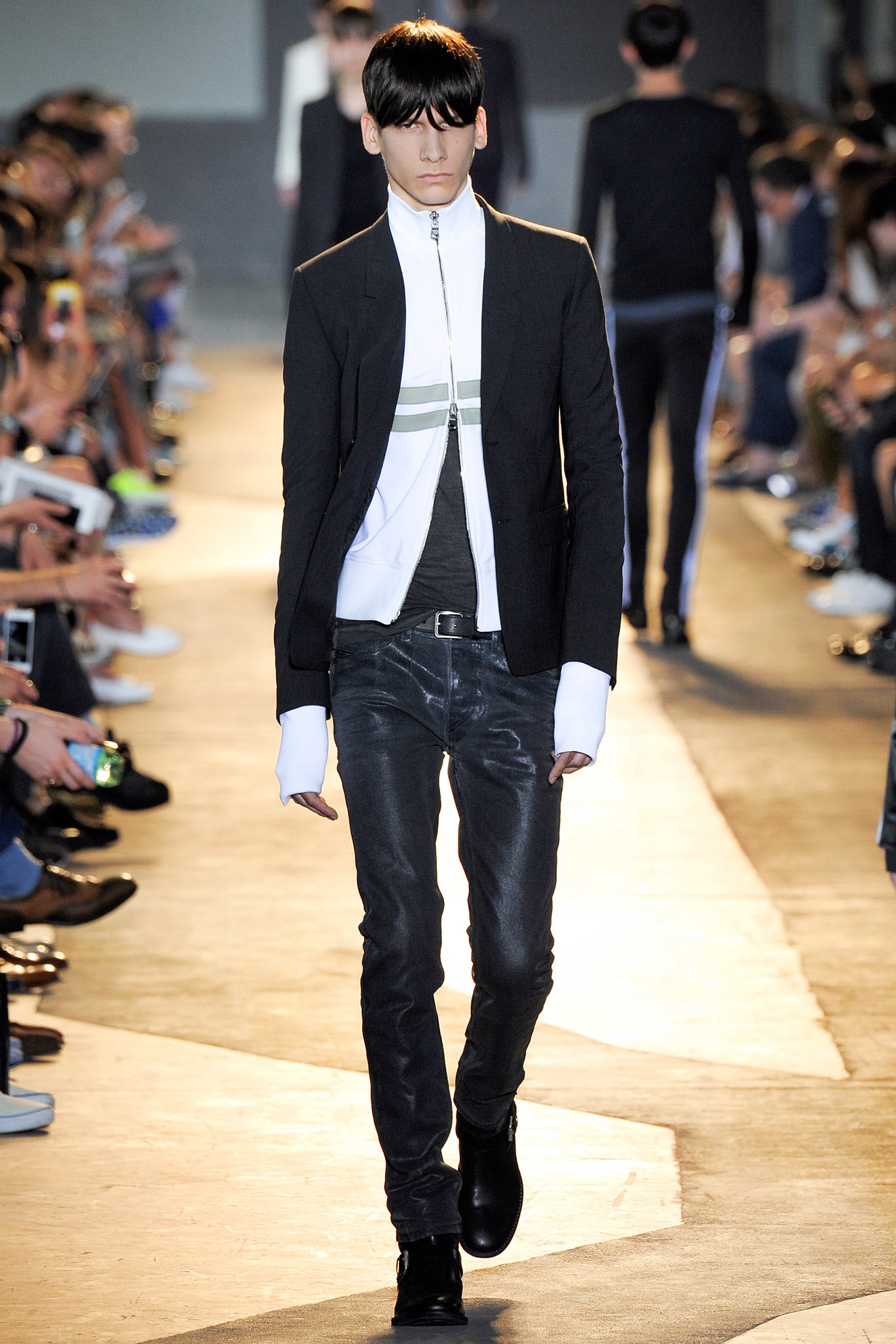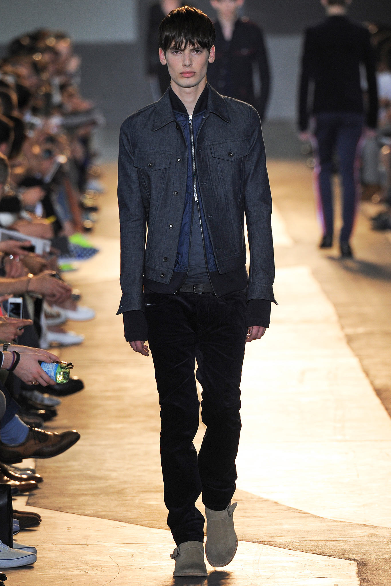 The idiosyncratic look melds Diesel Black Gold’s core vocabulary. Tailoring is layered with sporty tracksuits, denim and corduroy, military jackets inspired by an officer’s uniform and motocross style leather jackets. A street sensibility is created by familiar dress codes. Milan Fashion Week Spring/Summer 2015.