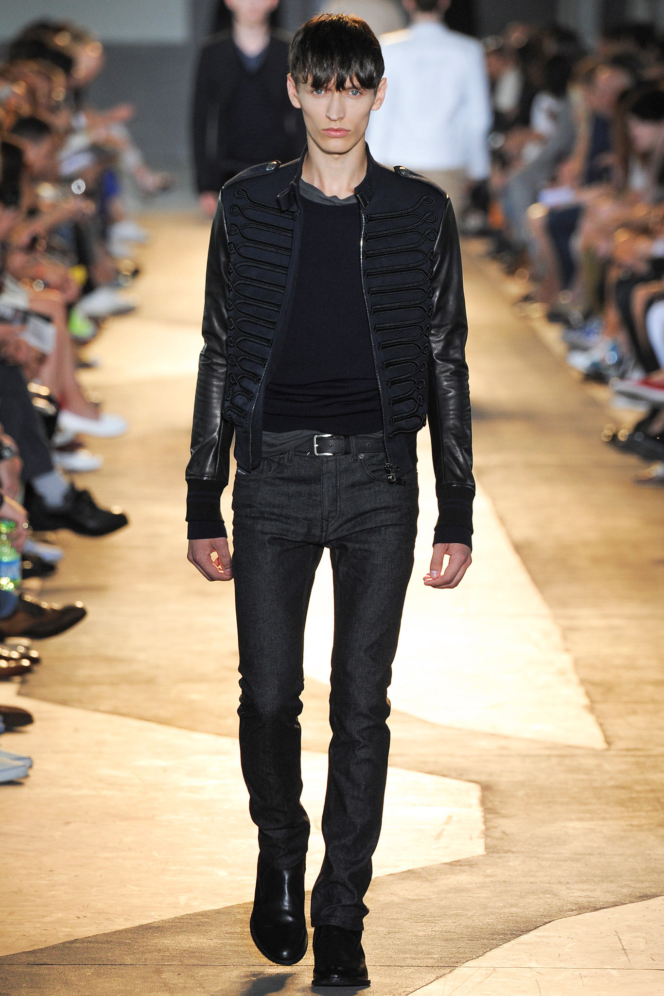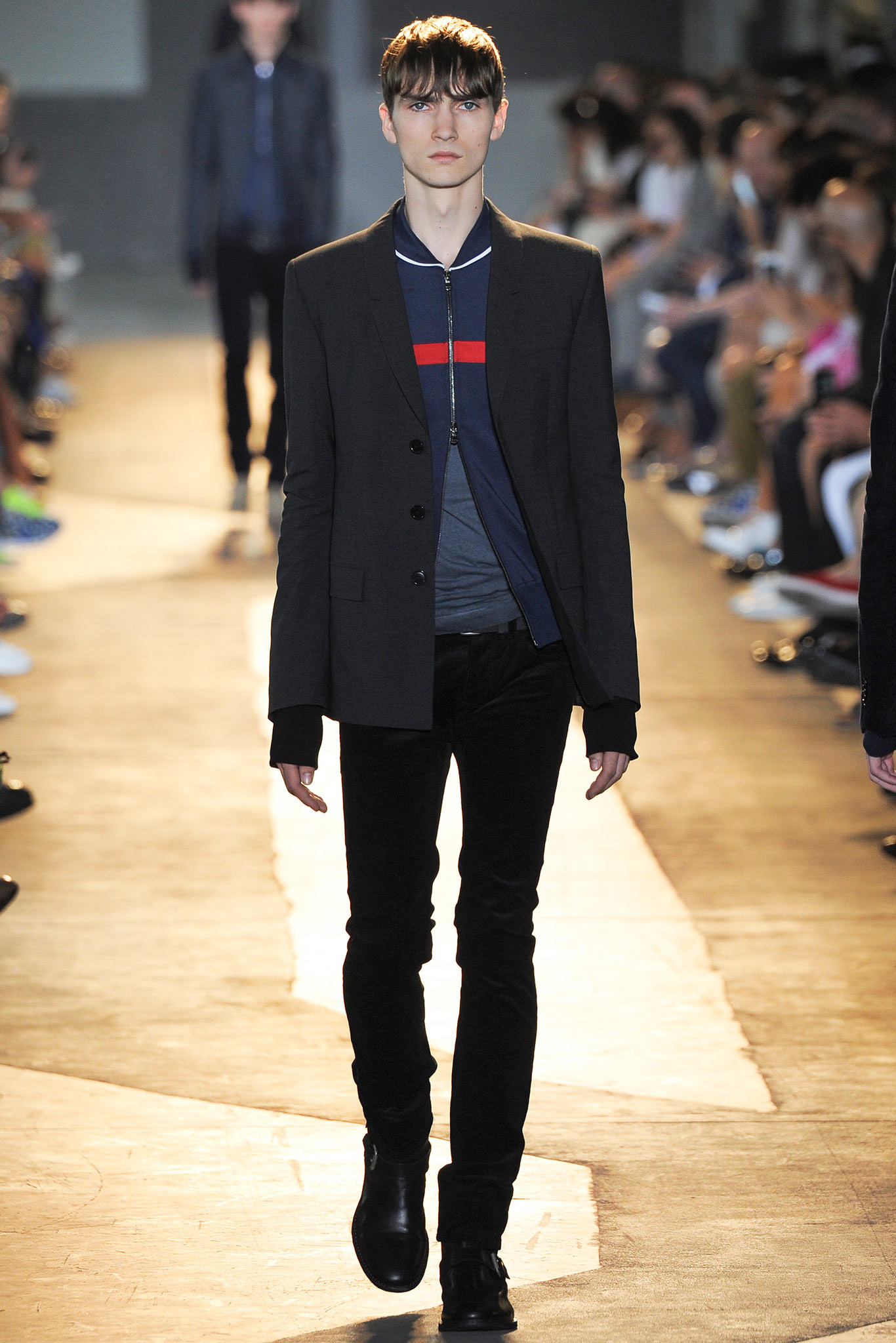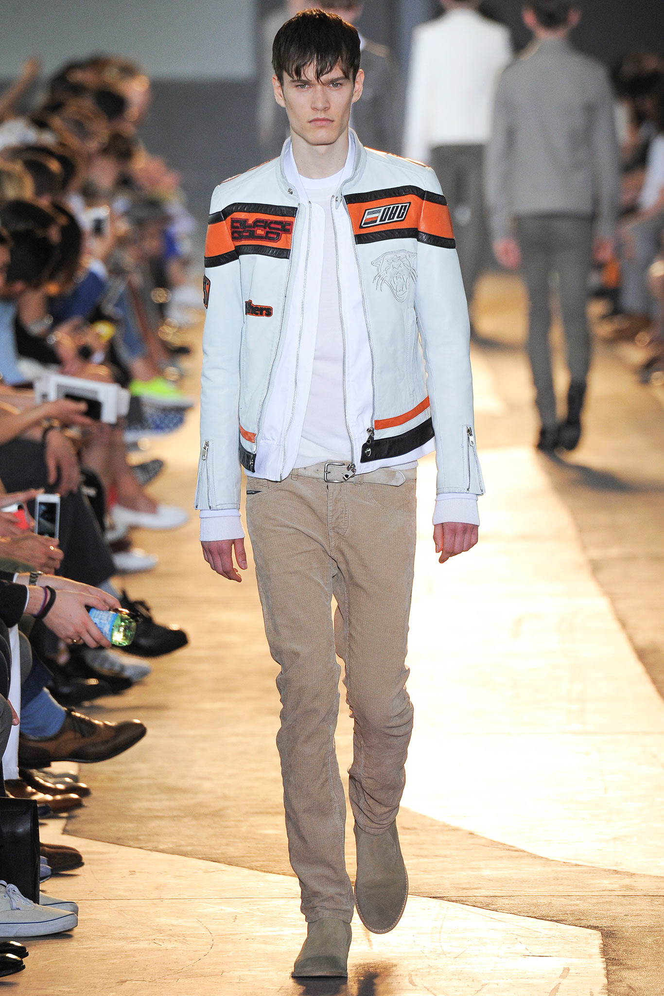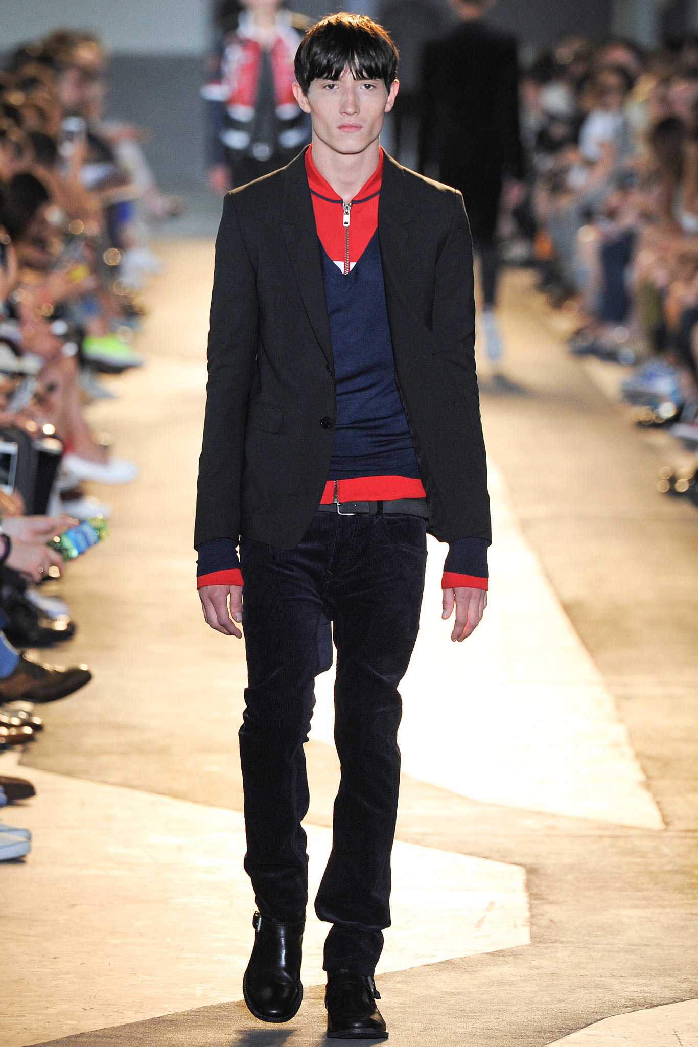The idiosyncratic look melds Diesel Black Gold’s core vocabulary. Tailoring is layered with sporty tracksuits, denim and corduroy, military jackets inspired by an officer’s uniform and motocross style leather jackets. A street sensibility is created by familiar dress codes. Milan Fashion Week Spring/Summer 2015.