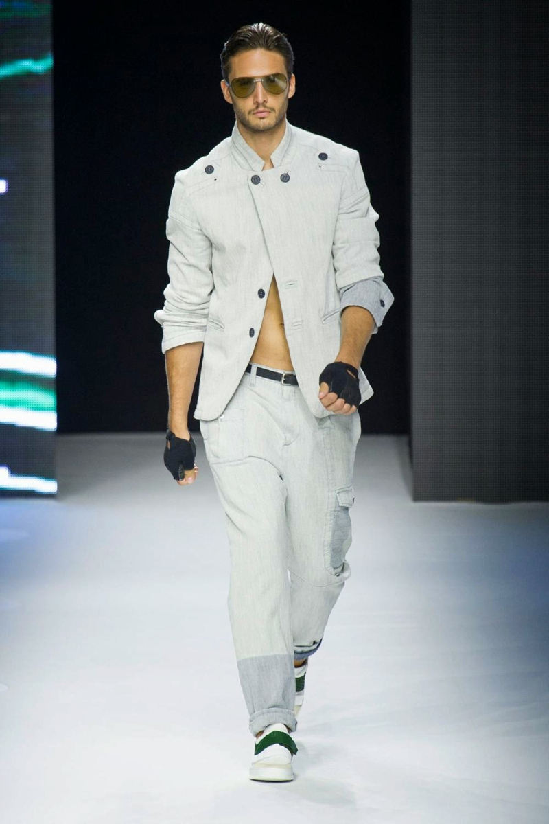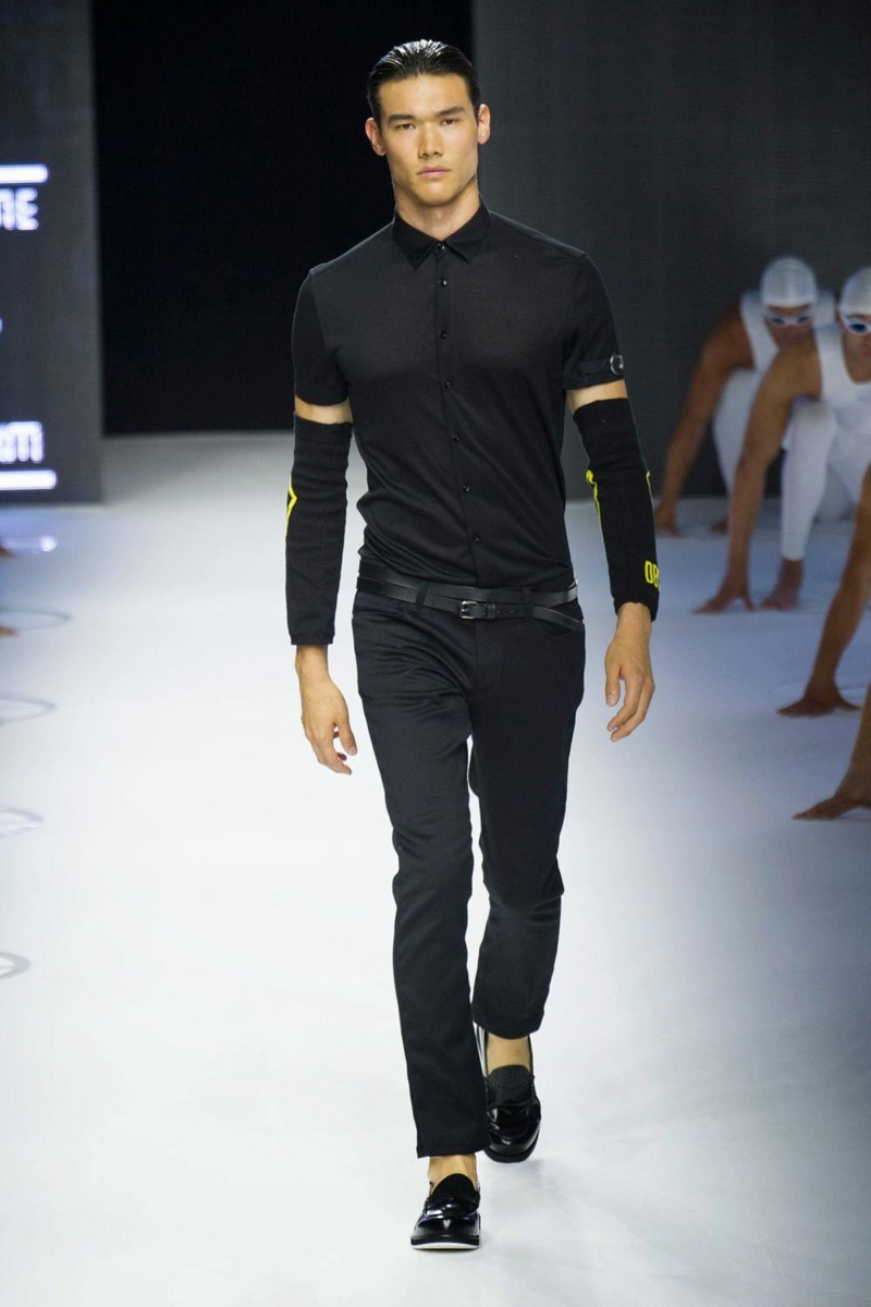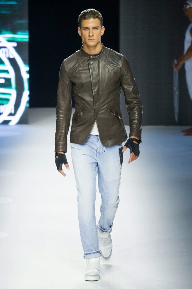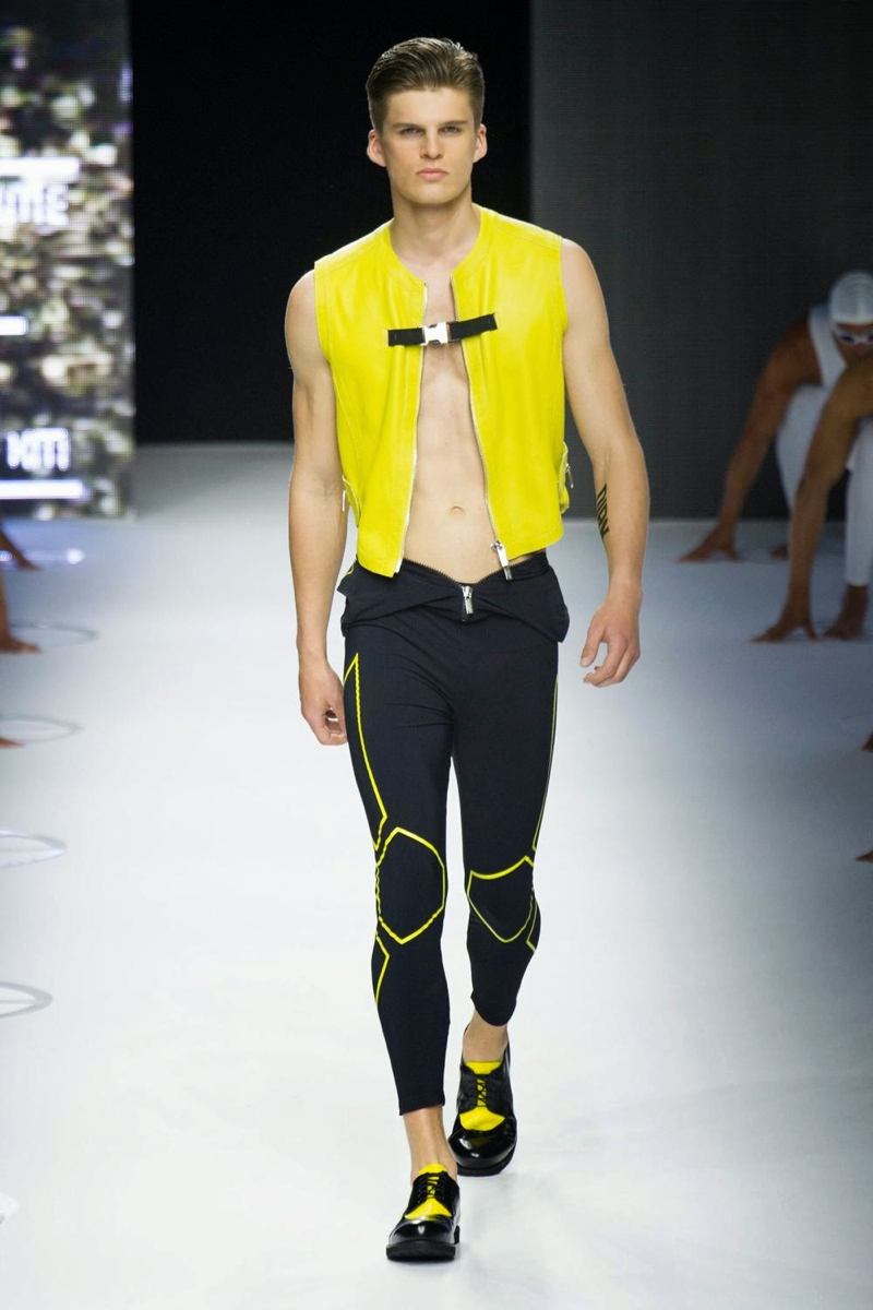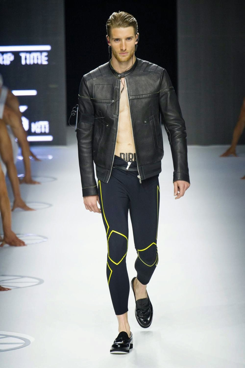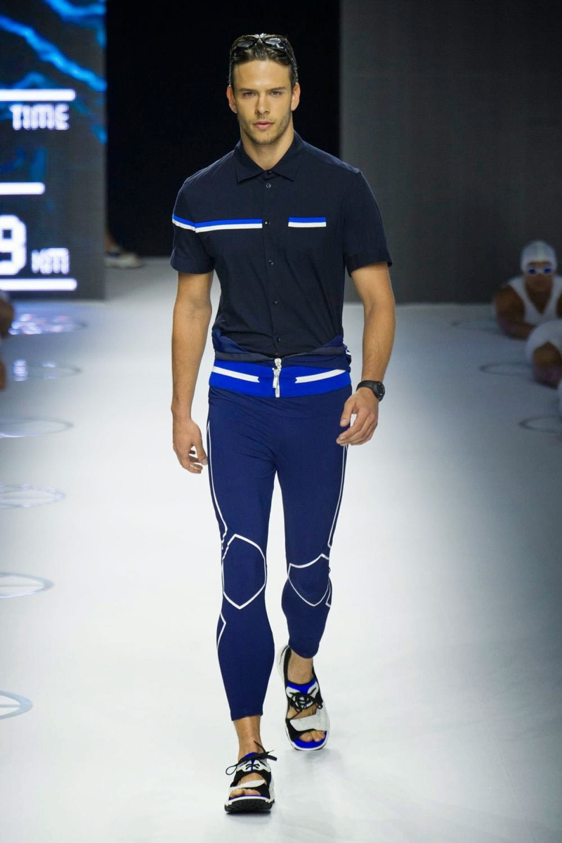 A fashion label that has always been about the athletic man, Dirk Bikkembergs fits right in this season. For spring/summer 2015, the swimmer and his long torso were the stars of the show. Embracing aquatic blues, leggings, open shirts and sporty blazers were right at home. Take a detour with cycling and the shorts were tight and tops relaxed. Stopping off in Shanghai, Dirk Bikkembergs’ collection got playful with biker’s jackets, mesh tops and more mixing in with the sporty essentials already established. Altogether, the collection hit a relevant note for the athlete, marrying style and function.