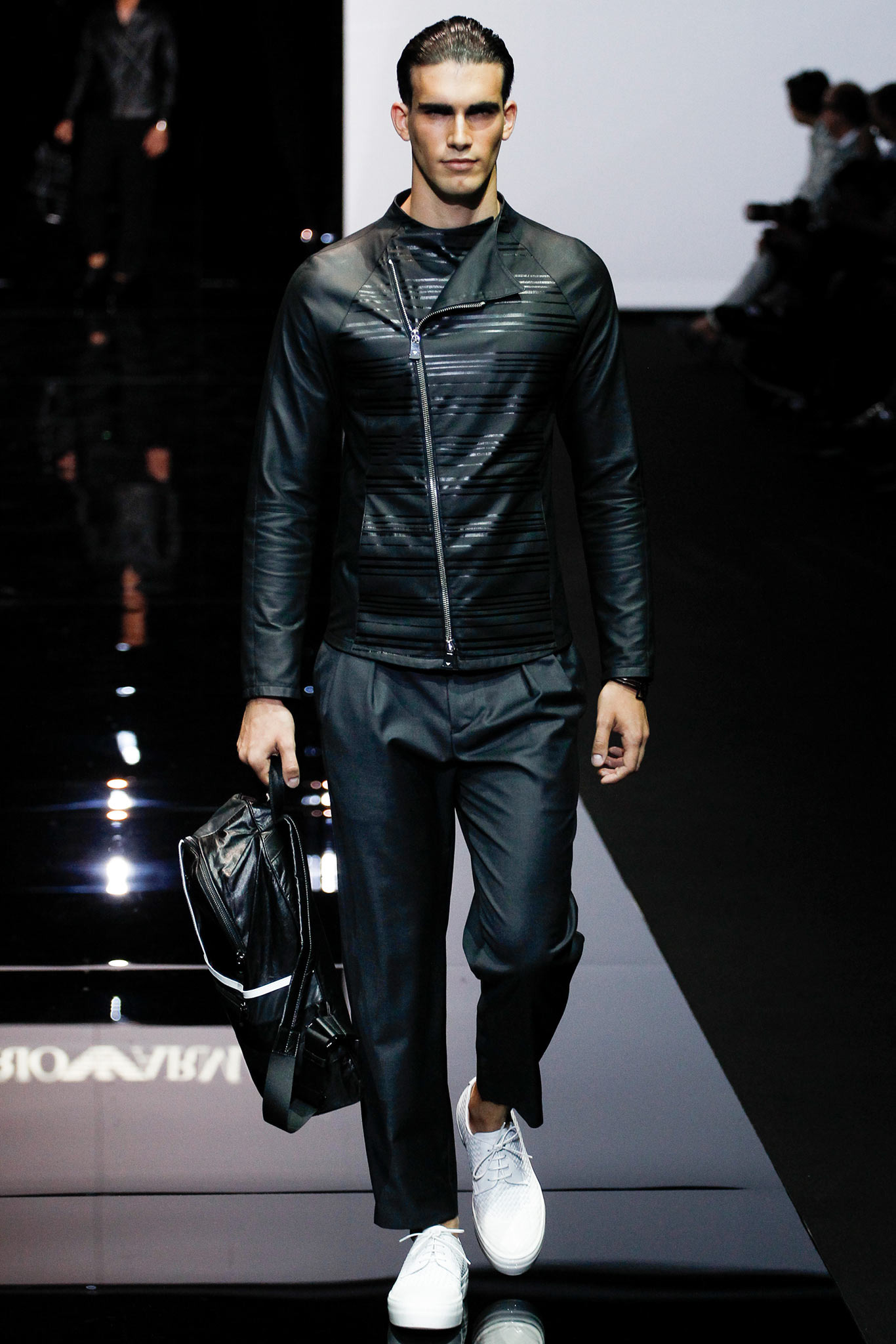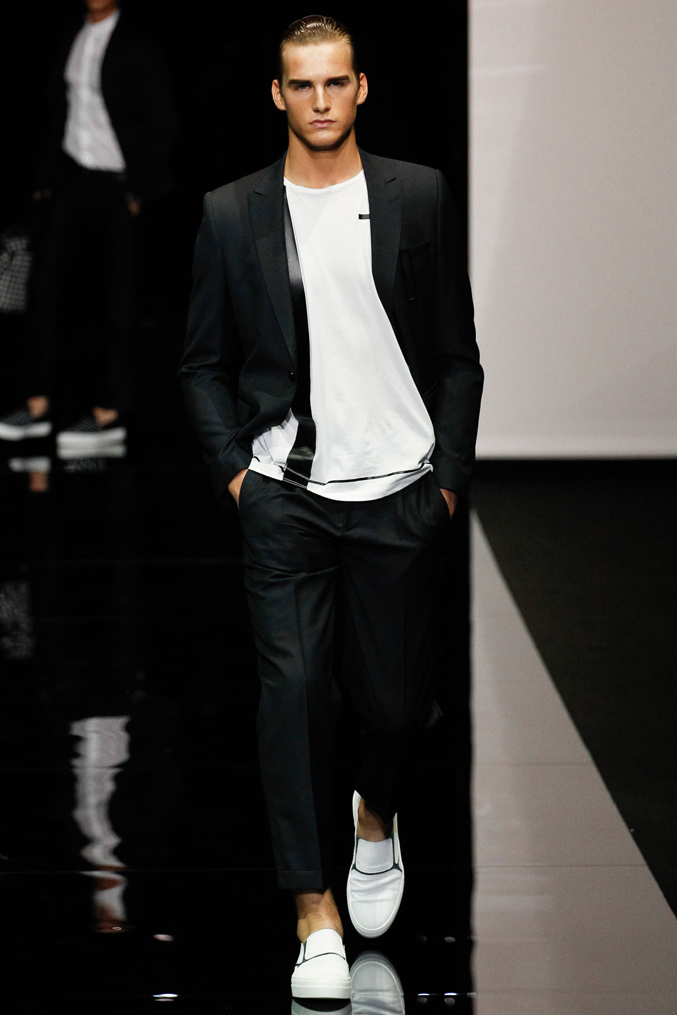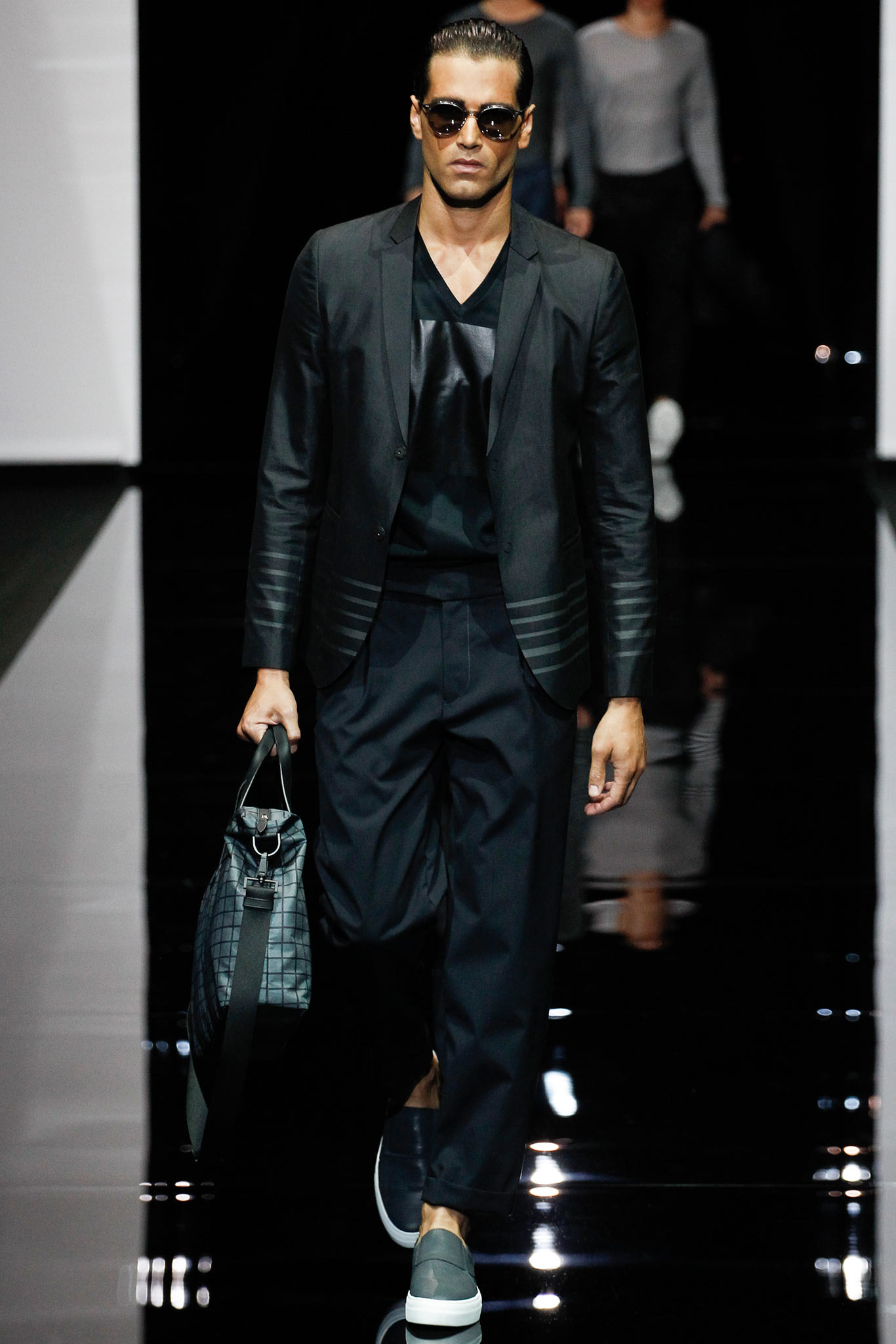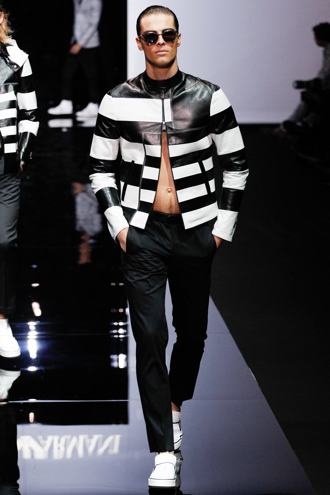 Interestingly enough, Emporio Armani and summer always seem to be a match made in heaven. With each collection, it’s always easy to imagine Giorgio Armani’s man jet setting and vacationing at the best luxury resorts. Contributing to that image, Armani looked to the classic pairing of black and white to lend his spring/summer 2015 collection a direction. Getting graphic, but maintaining an accessible edge, black and white prints were incorporated into a sporty mix that included sports jackets, loose slouchy tops, bomber jackets and pullovers. From checks and stripes to broken lines, shorts, shirts and knitwear were instantly desirable, working in luxe fabrics like silk for a covetable season.