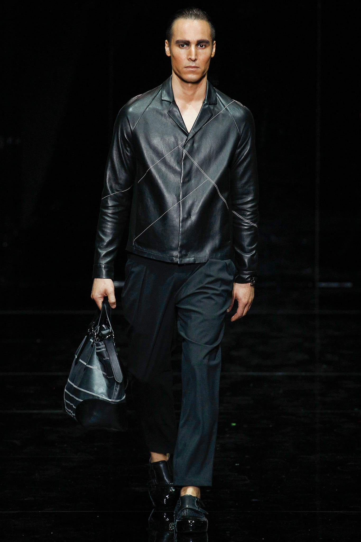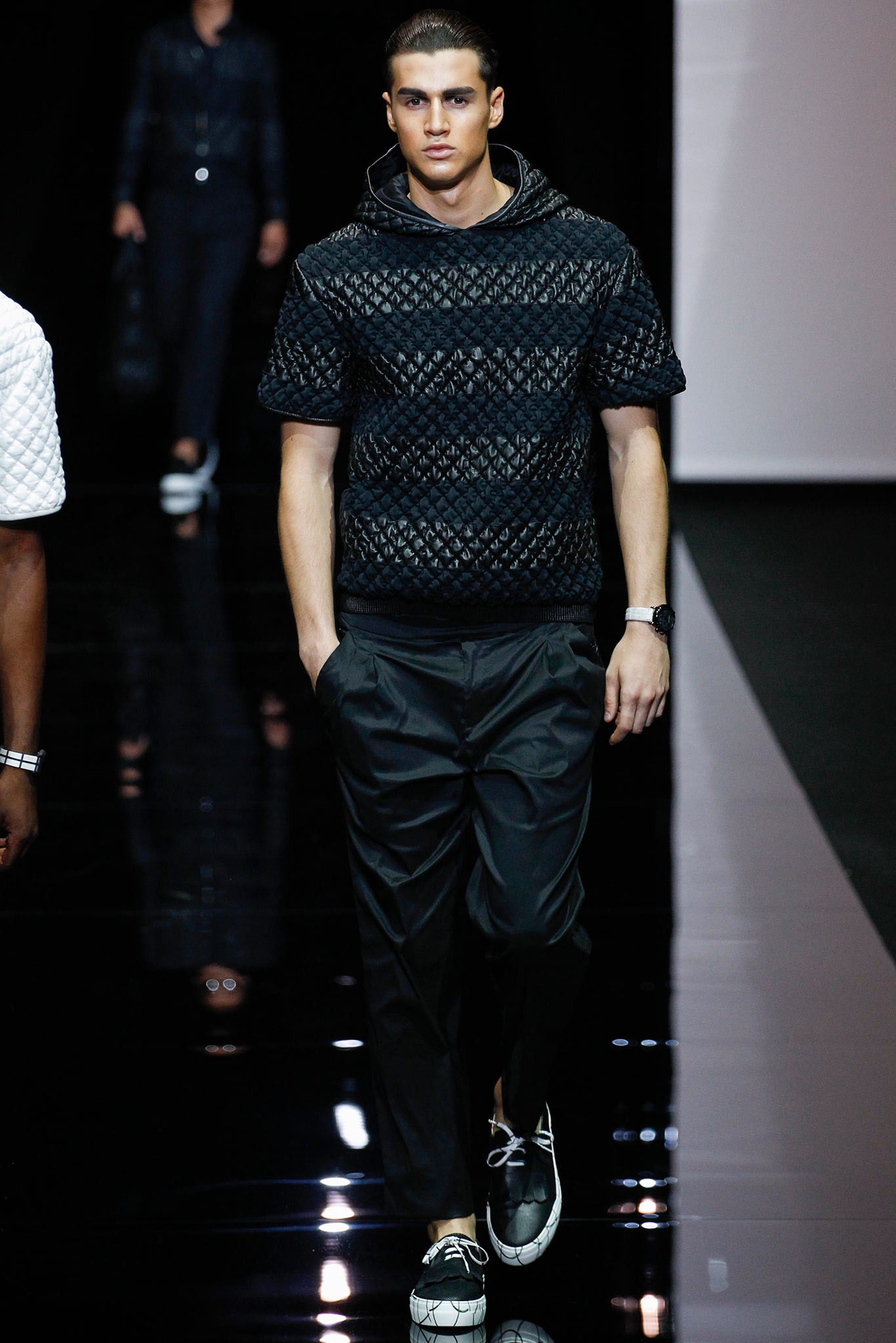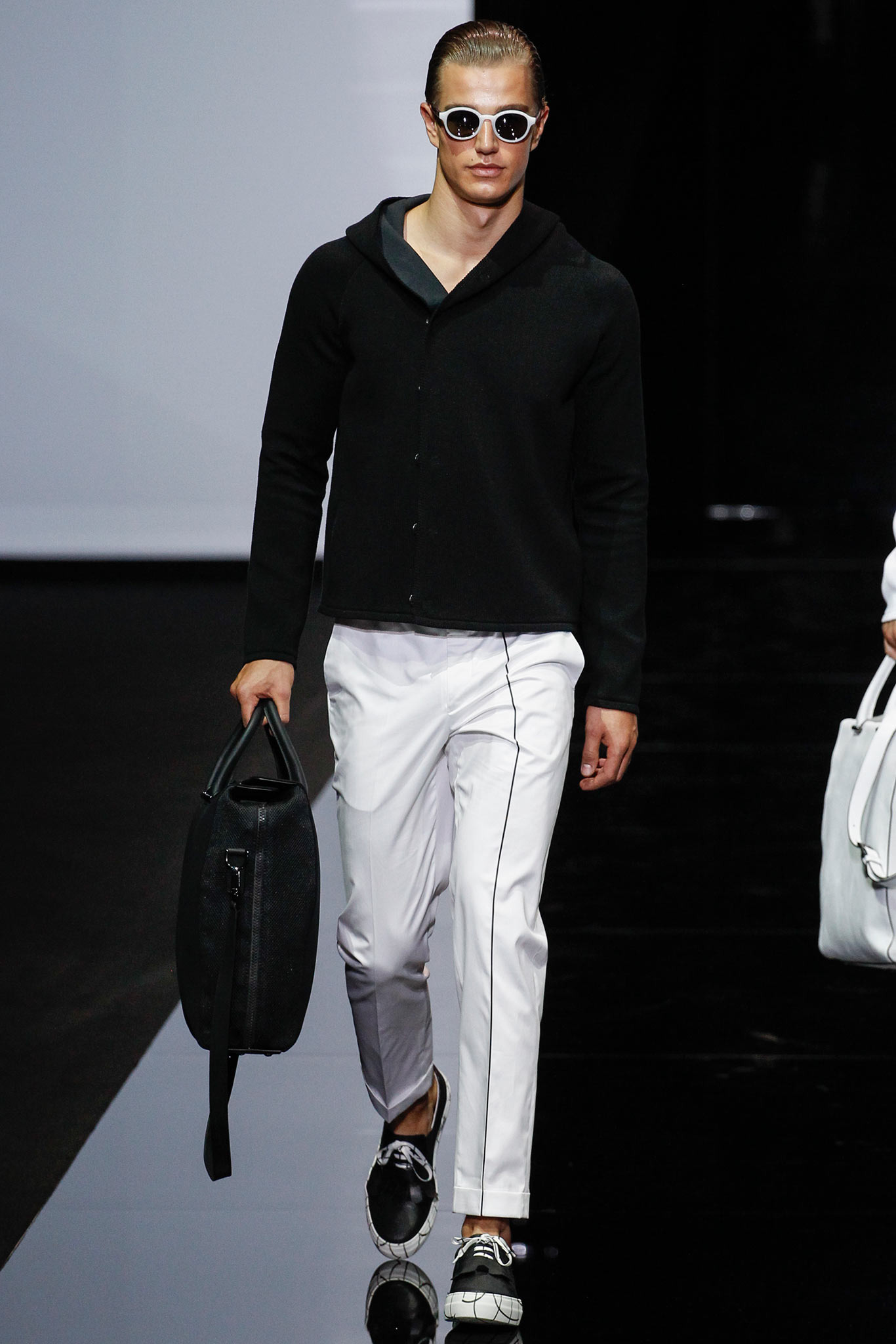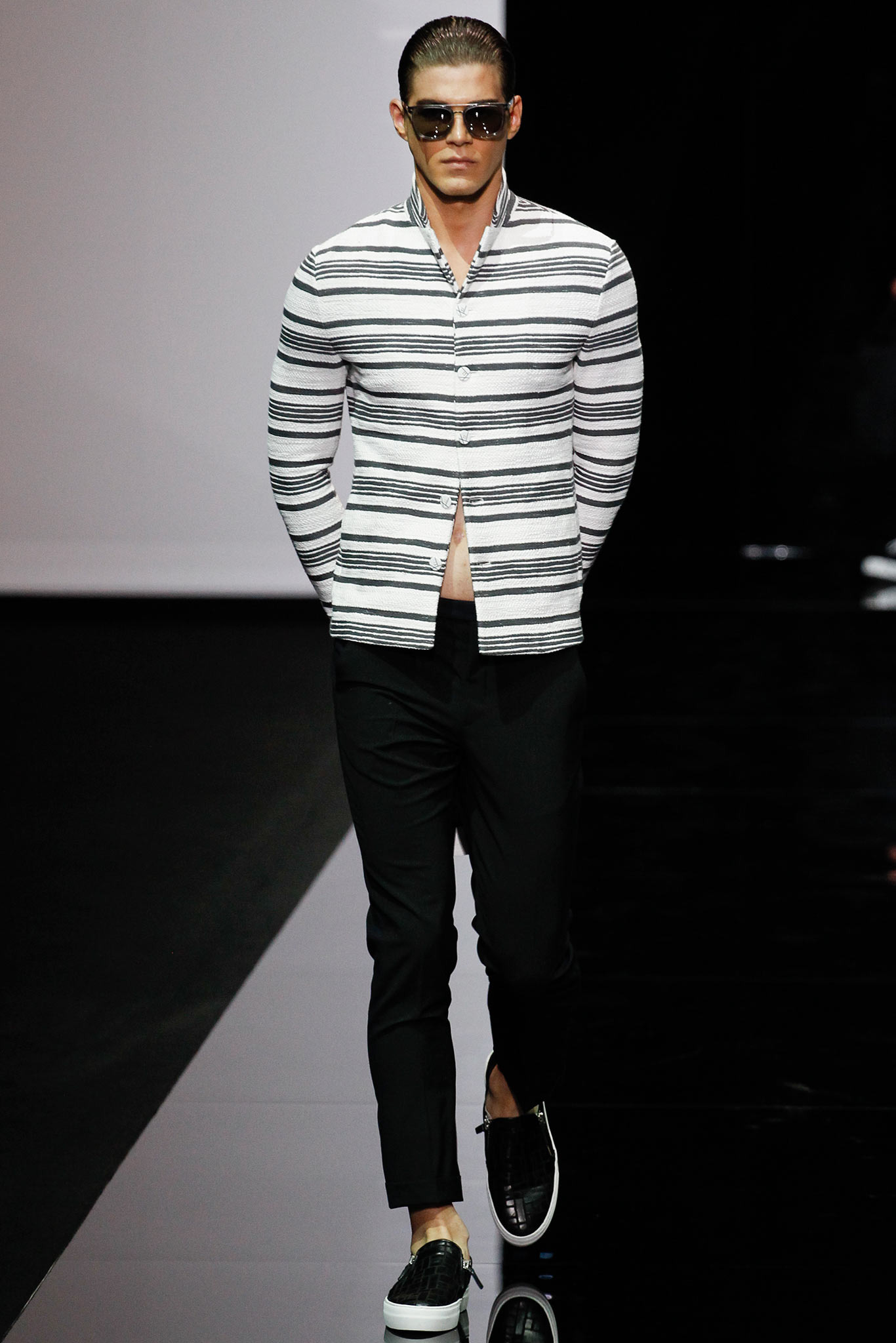 Interestingly enough, Emporio Armani and summer always seem to be a match made in heaven. With each collection, it’s always easy to imagine Giorgio Armani’s man jet setting and vacationing at the best luxury resorts. Contributing to that image, Armani looked to the classic pairing of black and white to lend his spring/summer 2015 collection a direction. Getting graphic, but maintaining an accessible edge, black and white prints were incorporated into a sporty mix that included sports jackets, loose slouchy tops, bomber jackets and pullovers. From checks and stripes to broken lines, shorts, shirts and knitwear were instantly desirable, working in luxe fabrics like silk for a covetable season.