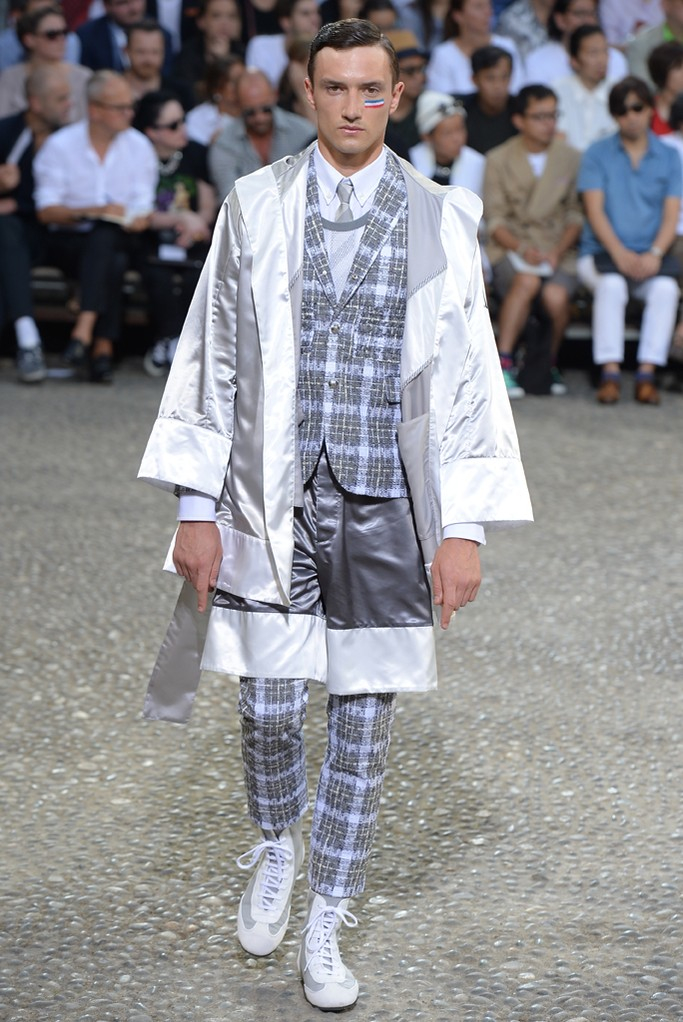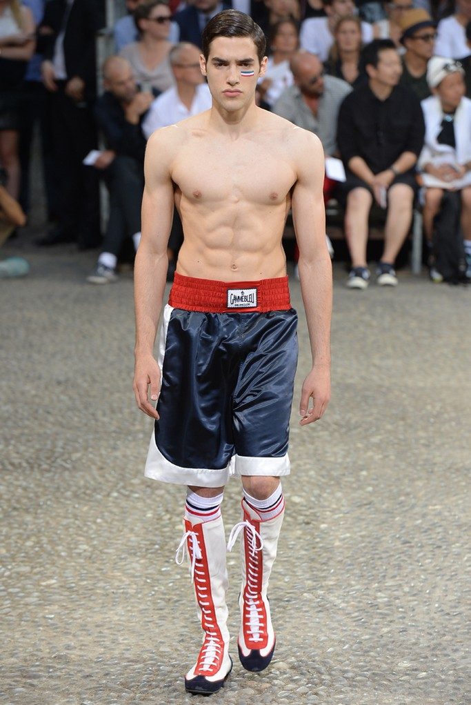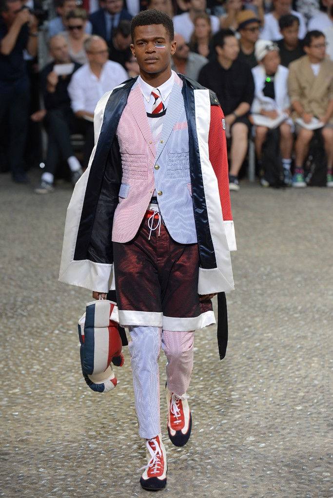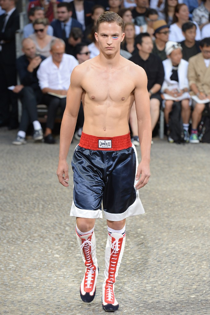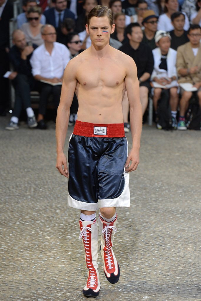 Designer Thom Browne looked to the sport of boxing to inform his latest collection for Moncler Gamme Bleu. Beginning the show with the obvious boxing shorts, shirtless models paraded out front in Browne’s customary navy, red and white. Branching off into silk robes and long coats, the collection was extended with layered separates that boasted a high wearable factor. Check jackets, smart shorts, sharp blazers and simple dress shirts contributed to a well-rounded outing that championed a balance of creativity and reality.
