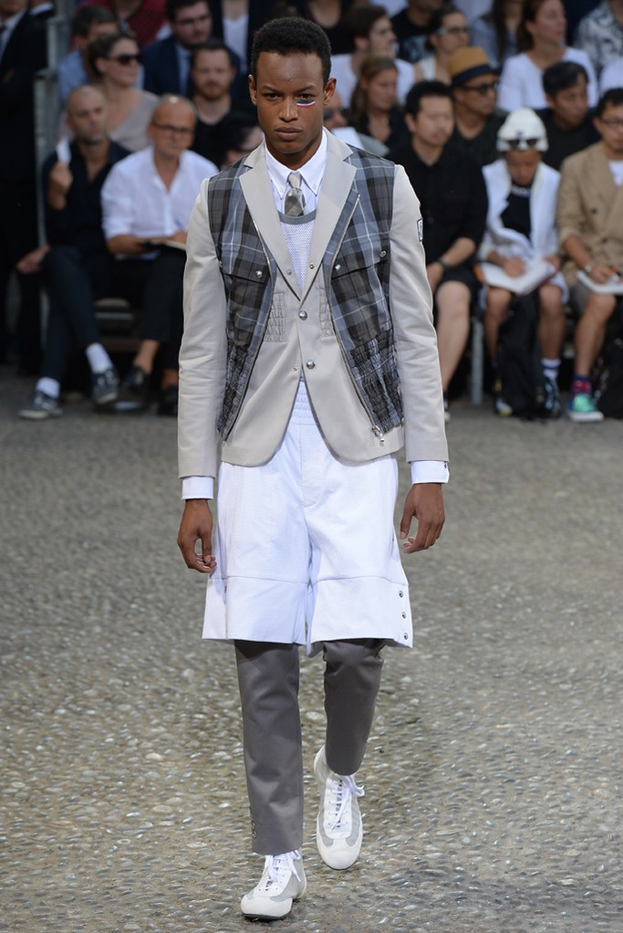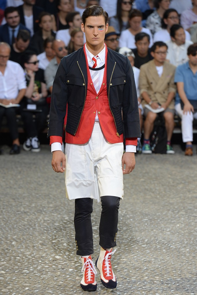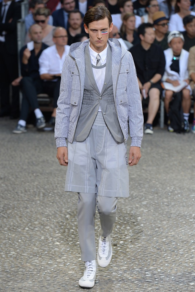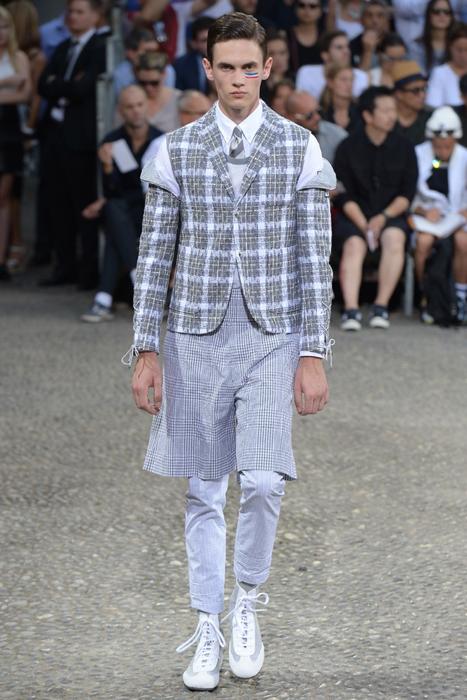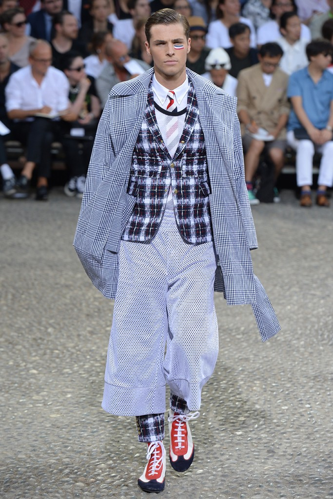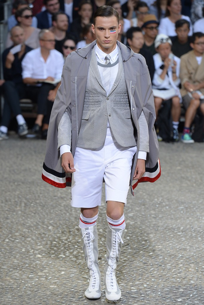 Designer Thom Browne looked to the sport of boxing to inform his latest collection for Moncler Gamme Bleu. Beginning the show with the obvious boxing shorts, shirtless models paraded out front in Browne’s customary navy, red and white. Branching off into silk robes and long coats, the collection was extended with layered separates that boasted a high wearable factor. Check jackets, smart shorts, sharp blazers and simple dress shirts contributed to a well-rounded outing that championed a balance of creativity and reality.