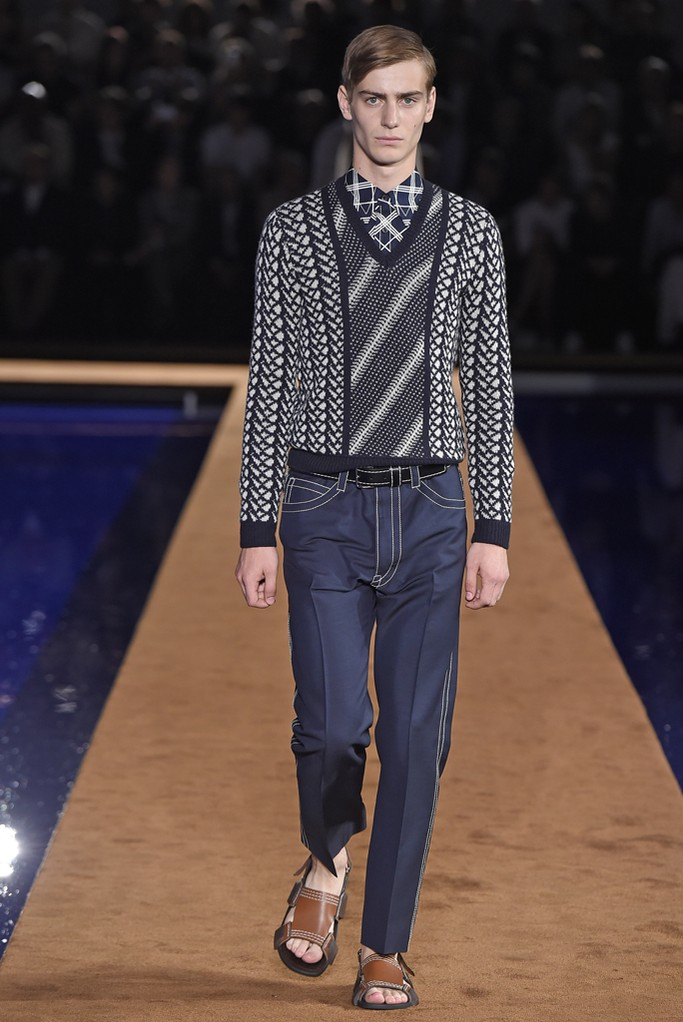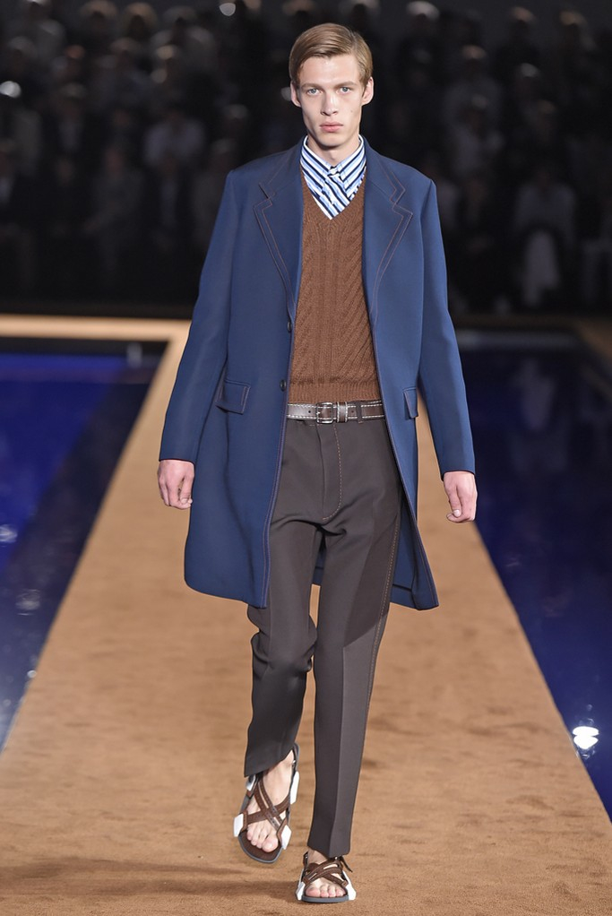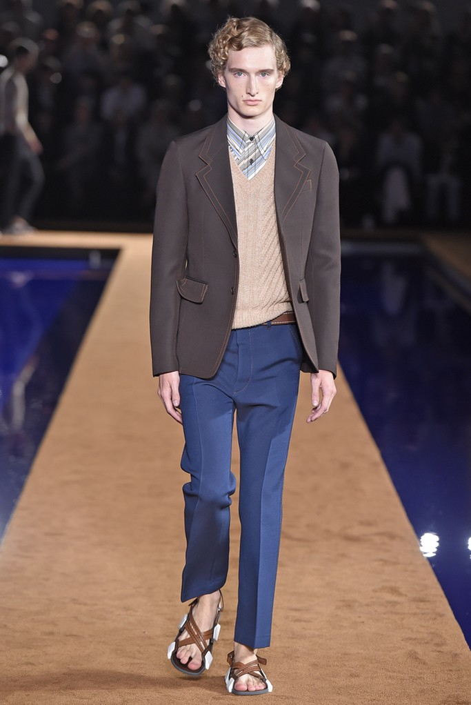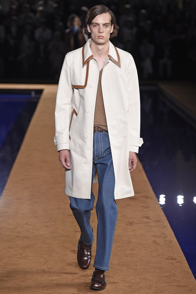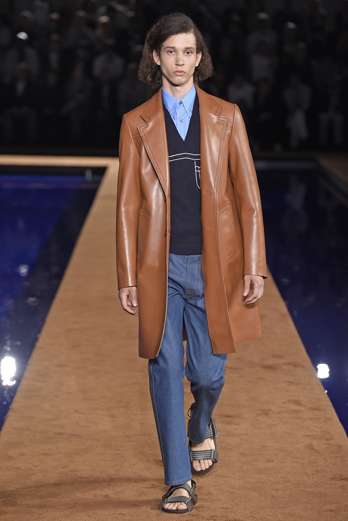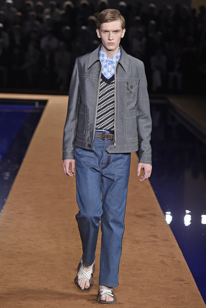 Miuccia Prada made a modest proposal for spring/summer 2015, crafting her latest collection with wearability at the forefront. Denim pants solidified the season’s simple plan as models hit the dirt brown runway, showing a rugged side to Prada’s man. Married to a nostalgic past that is so familiar to the Prada man, it wasn’t a stretch to imagine the label’s designs on the original set of Dallas. Here, long coats, of a smooth brown leather were cut straight with sharp lines. Meanwhile, striped knitwear played with printed proportions. Paired off with sandals and smart dress shirts, the attitude was laid-back but polished.