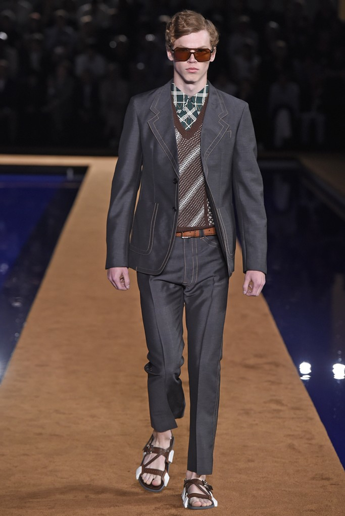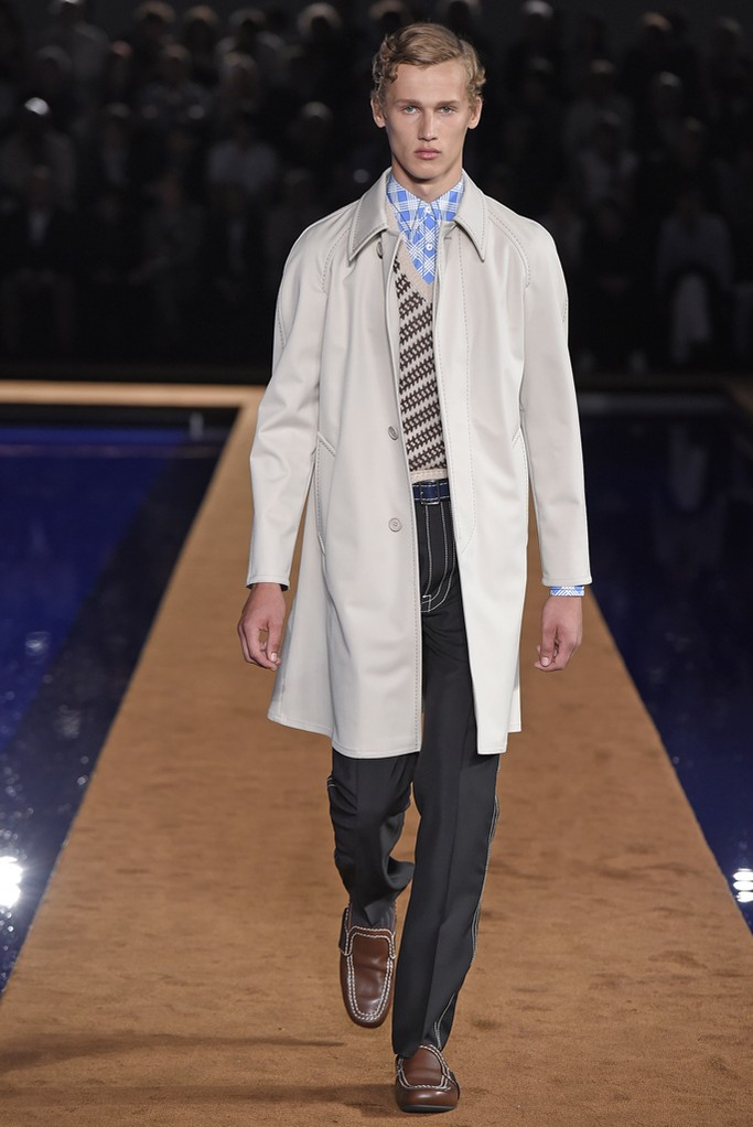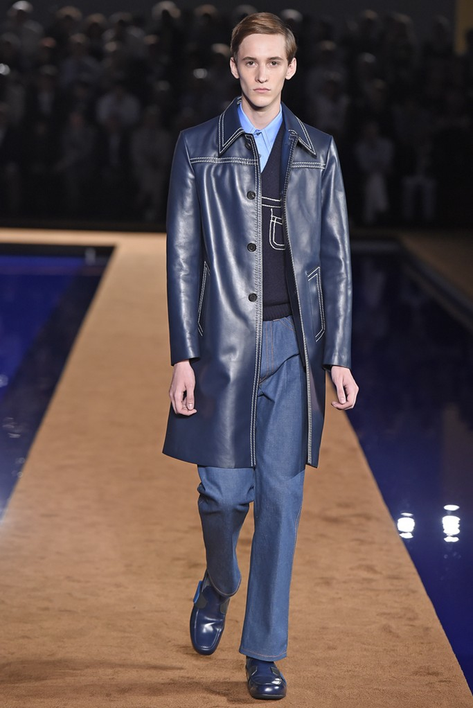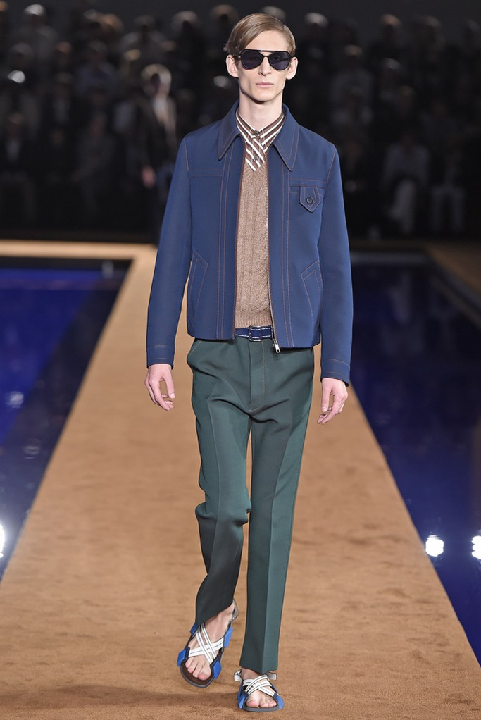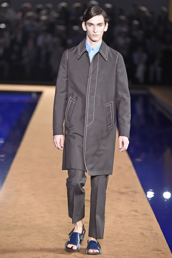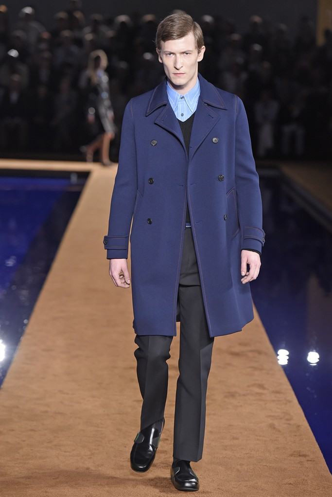 Miuccia Prada made a modest proposal for spring/summer 2015, crafting her latest collection with wearability at the forefront. Denim pants solidified the season’s simple plan as models hit the dirt brown runway, showing a rugged side to Prada’s man. Married to a nostalgic past that is so familiar to the Prada man, it wasn’t a stretch to imagine the label’s designs on the original set of Dallas. Here, long coats, of a smooth brown leather were cut straight with sharp lines. Meanwhile, striped knitwear played with printed proportions. Paired off with sandals and smart dress shirts, the attitude was laid-back but polished.