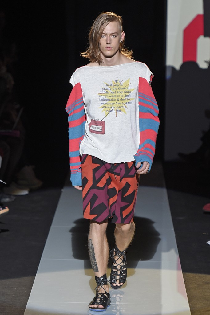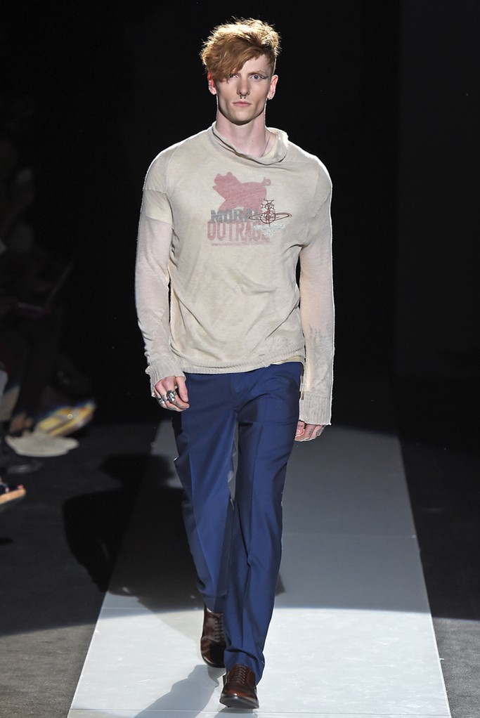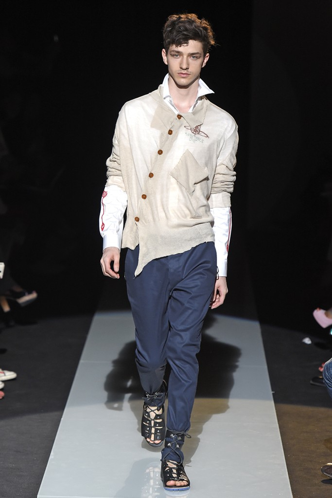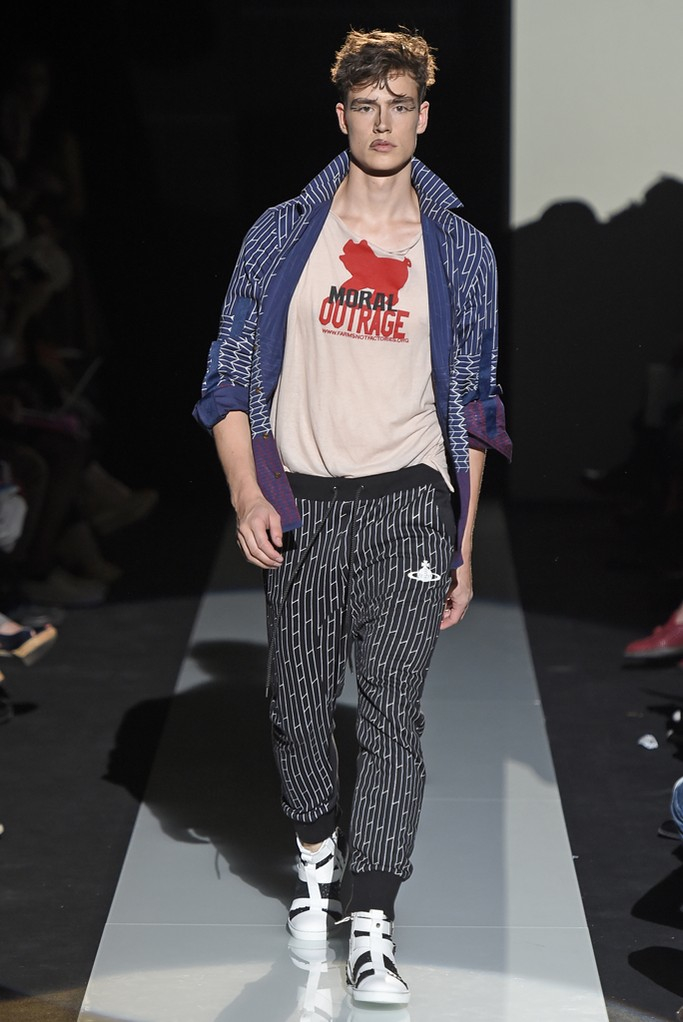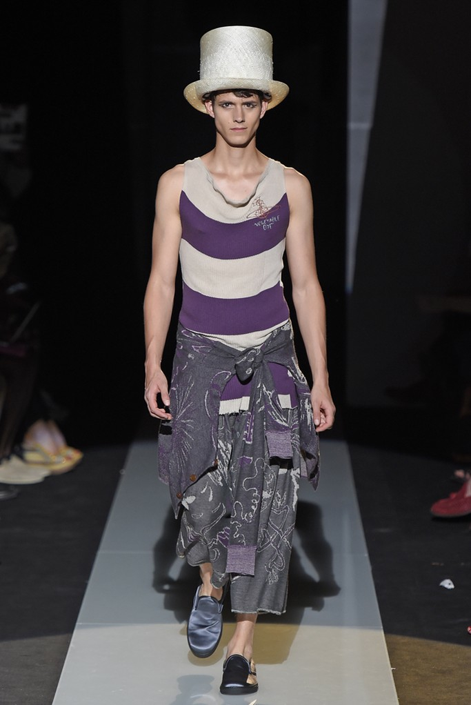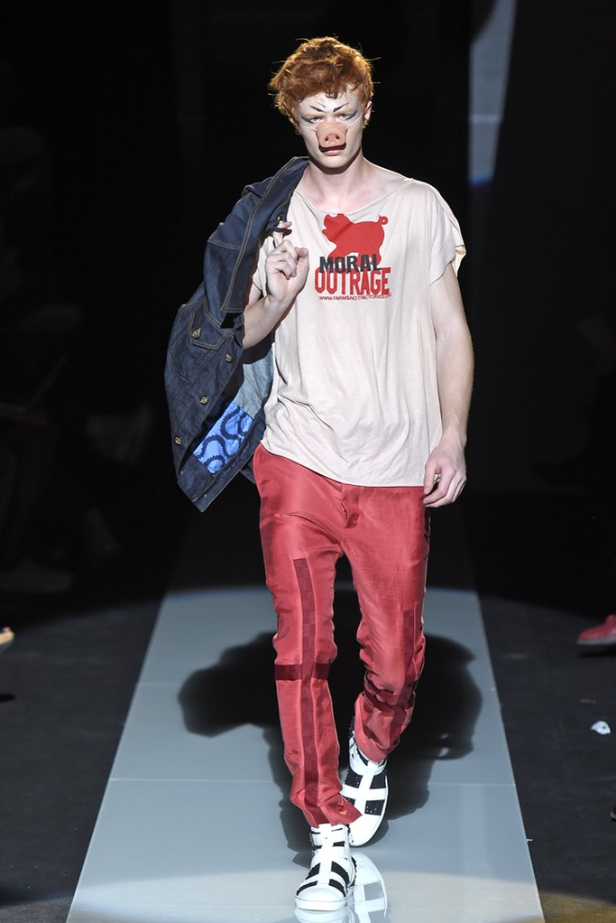 Never afraid to make a statement, designerVivienne Westwood used her spring/summer 2015 collection to continue her protests about fracking, a gas extraction process that could be harmful to local communities. Westwood finds that the by allowing fracking, the government is treating the British people like guinea pigs. The designer explains, “They do not know what it could mean for them, their community, the local and national economy or any potential impact on healthy, agriculture and their general security and well-being. What I would really like to get over to the public is the idea that this experiment that they want to conduct on the UK guinea pig, that it will take between 10 and 15 years before they even know if it is economically viable.” What does this mean for Westwood’s latest collection? The designer delivers varied influences as usual, dressing up her “guinea pig” in tropical prints, Mad Hatter-inspired fashions and protest wear.