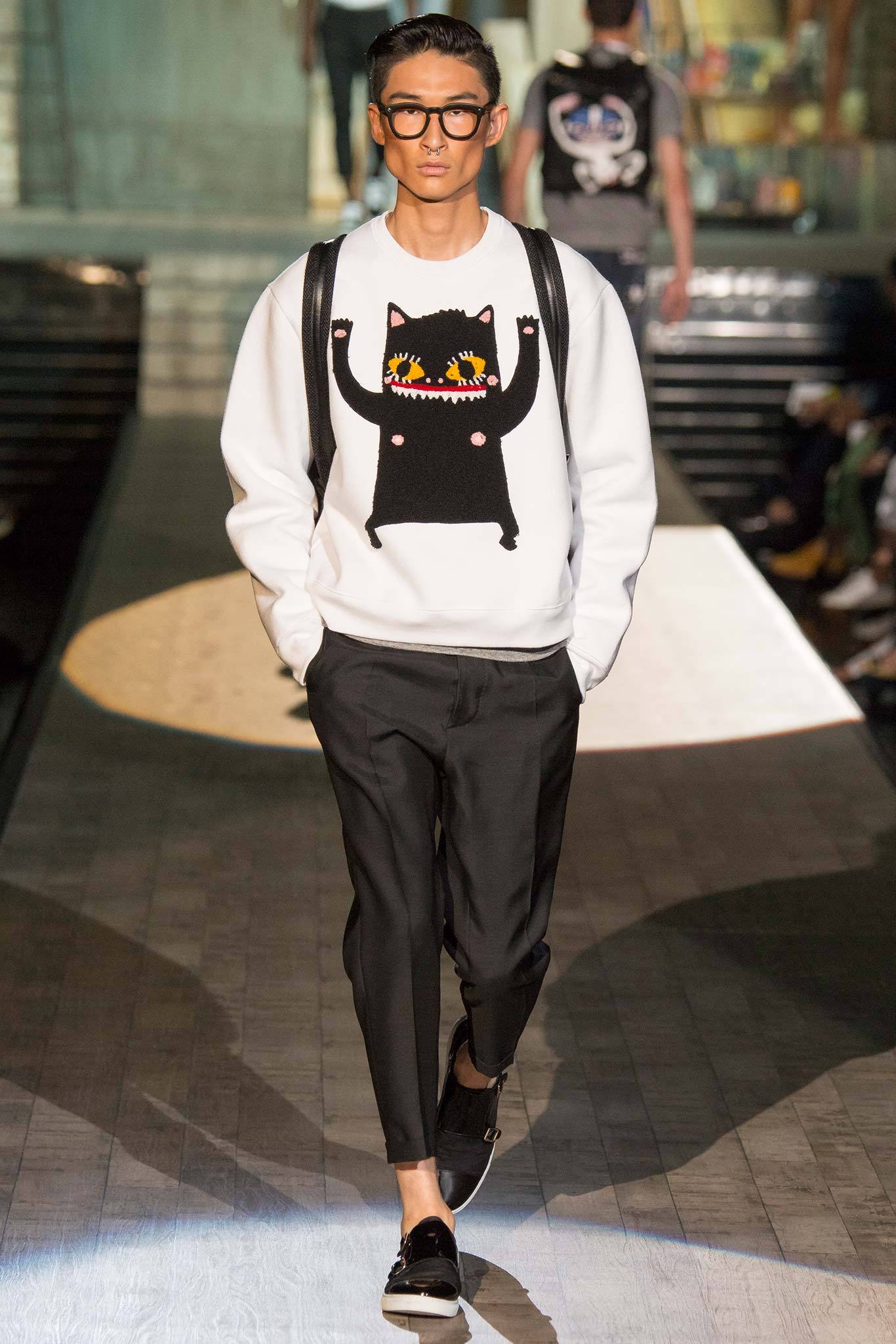 Referential mash-ups of iconic prints, sketches and graffiti inspired by contemporary American artists punctuate a boxy silhouette. Patent leather cats are appliqued onto roomy sweatshirts, a monkey is vividly printed on T-shirts and a denim jacket. A devious little monster lurks throughout the looks, embroidered all over cropped jackets, shirts and pants. The eye-catching motifs are endearing additions to the crisply cut separates.