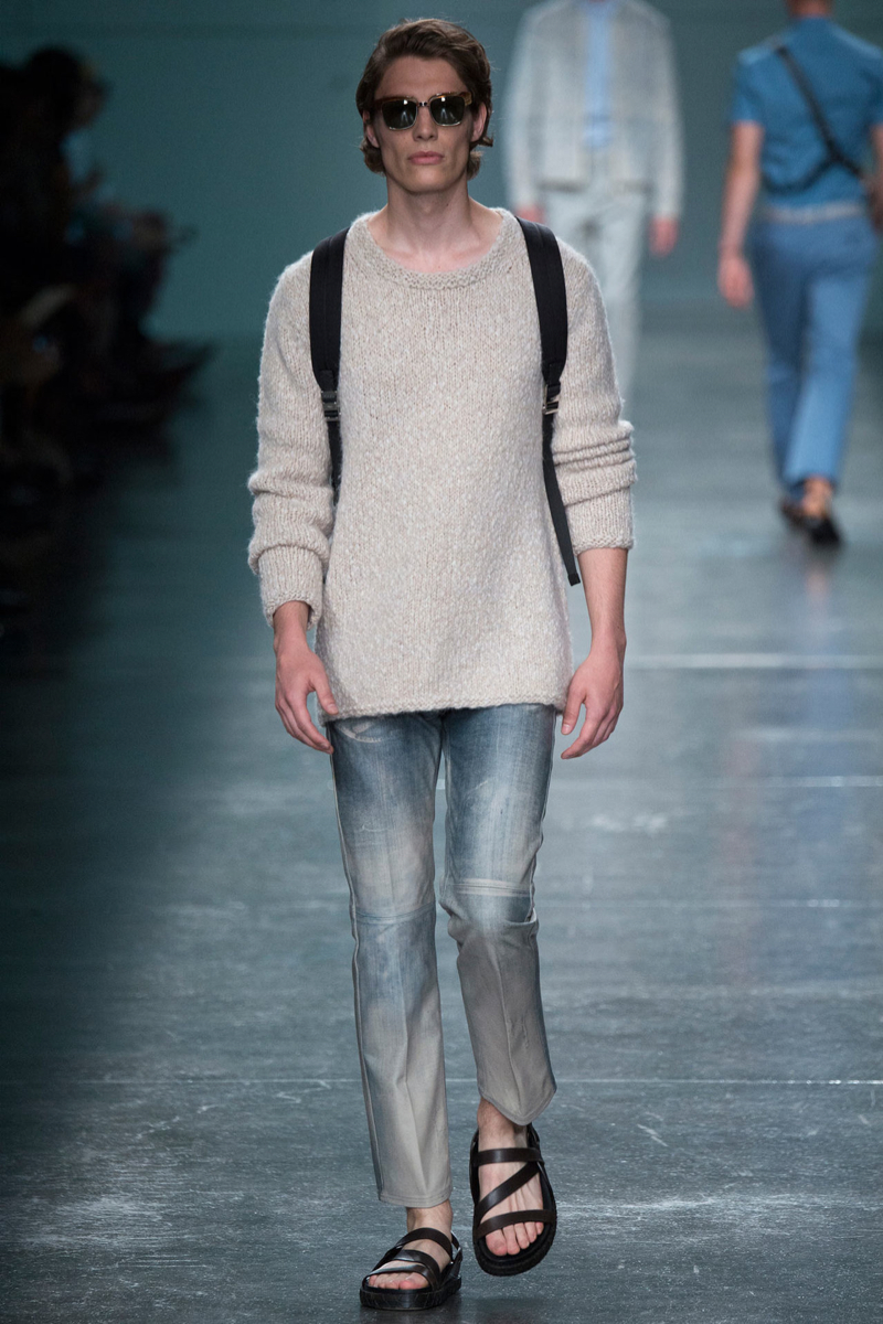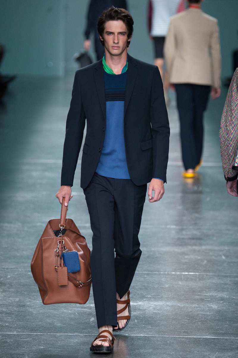 Designer Silvia Fendi joins the leaders of the luxury pack championing real fashions. Using gradient washes to bring all the elements together, denim infiltrated the Fendi catwalk. Combined with pocket tees, fitted bomber jackets, v-neck sweaters and other timeless essentials, the latest from Fendi was approachable. A short-sleeve shirt worn with a leather vest and slim pleated trousers had a youthful energy. Models walked down the runway with headphones and sunglasses. It all went with an easy laid-back Fendi. Mixed in with the casualness of the season, Fendi highlighted its luxe leather bags with many styles perfect for the urban traveler.