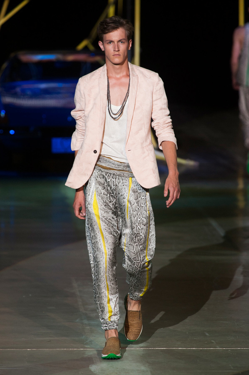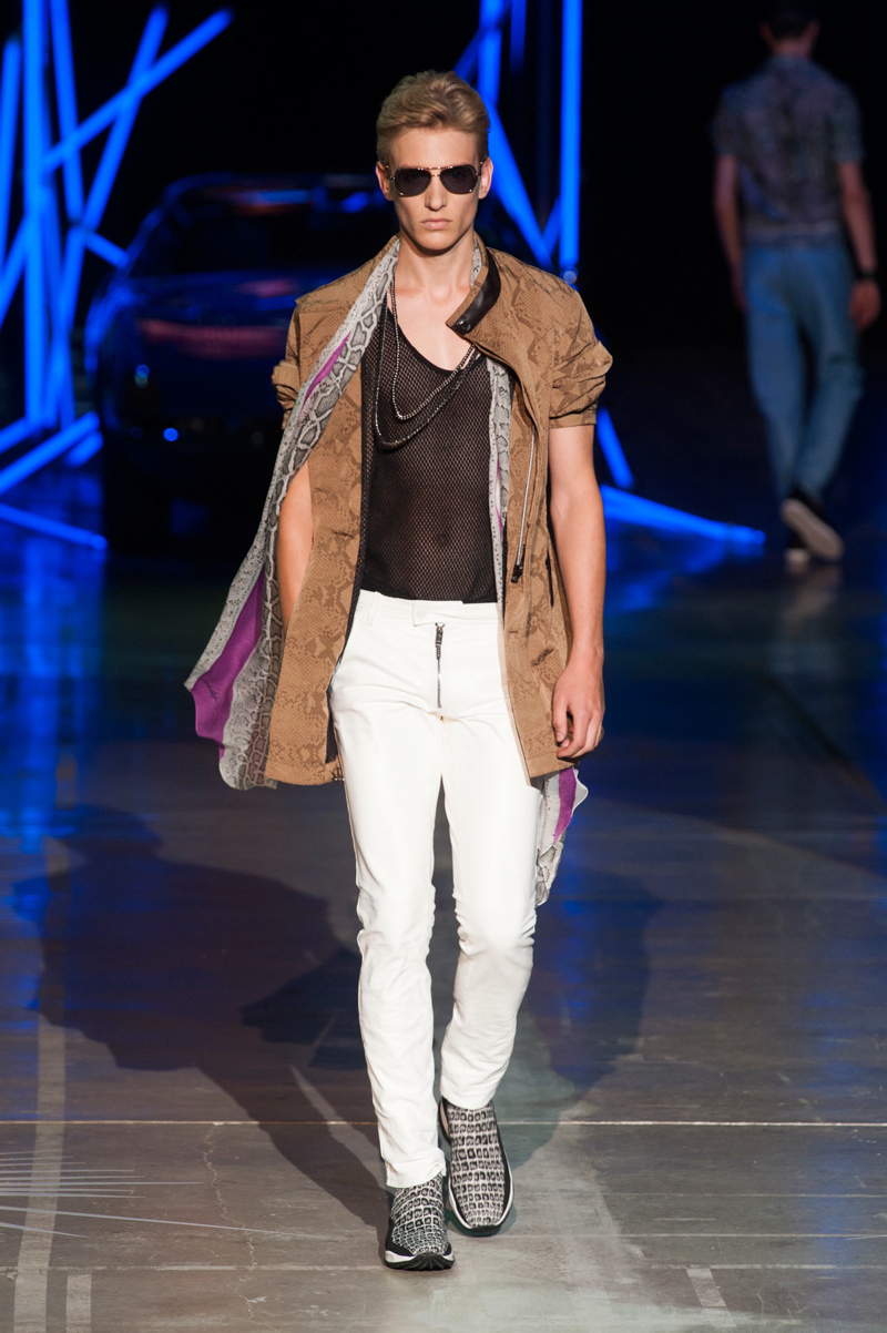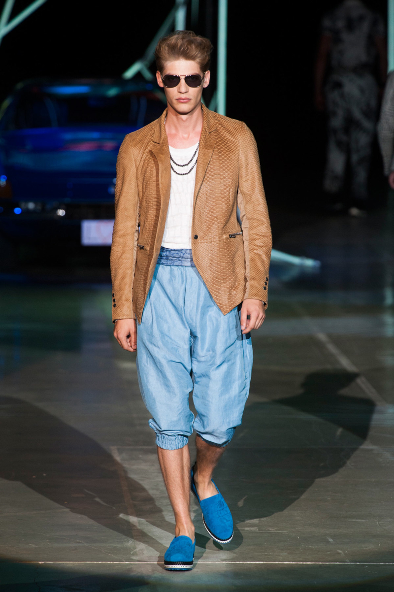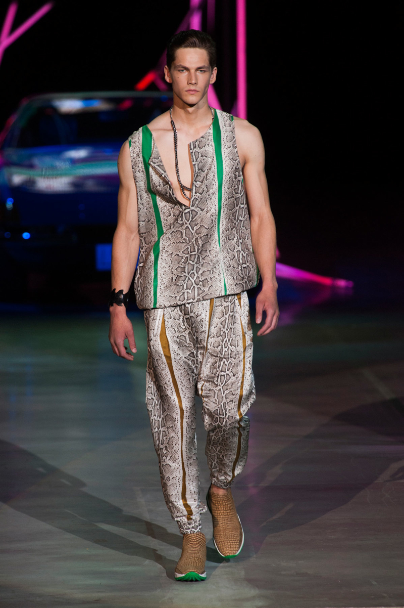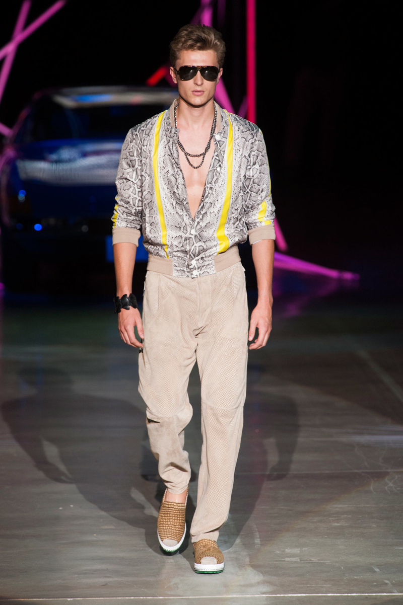 Designer Roberto Cavalli took fashion back to the 1970s for a rocking spring/summer 2015 collection. Inspired by the earlier music of Aerosmith, Cavalli got things off to a racy start, echoing the glamorous aesthetic of Miami Vice. Python prints and rich color hues dressed a brash wardrobe that left no essential untouched. From relaxed shirting and leather jackets to slim-cut pants, whether it was tropical in nature or electrifying in color, Cavalli made each piece a statement. In particular, leather was a standout for the collection with a luxe selection that included a bright green pair of pants.