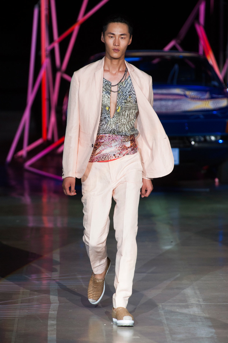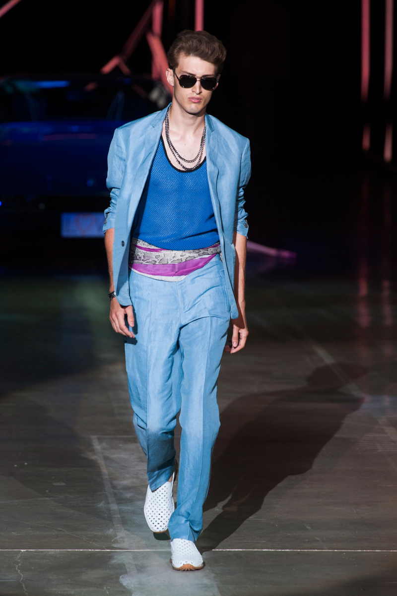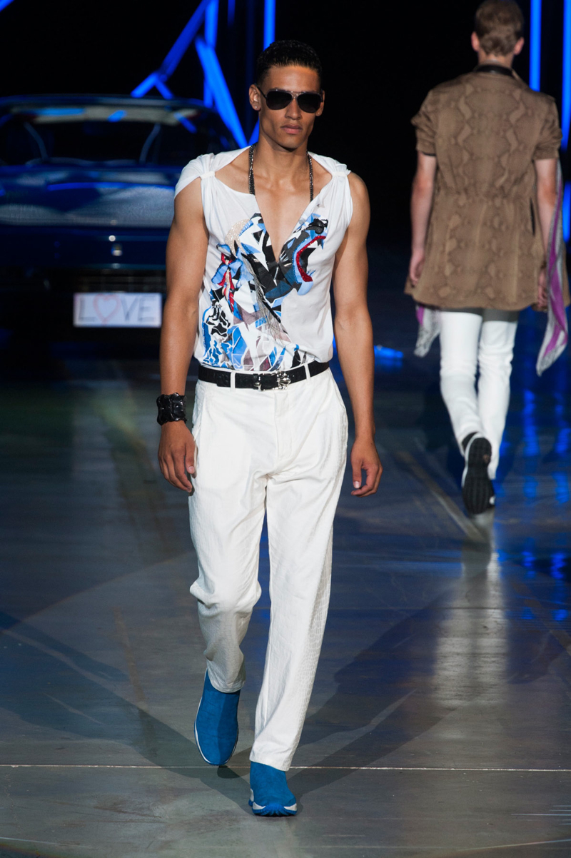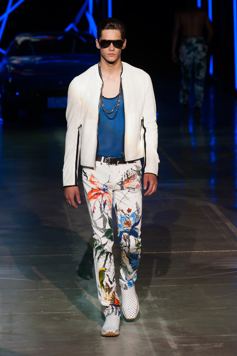 Designer Roberto Cavalli took fashion back to the 1970s for a rocking spring/summer 2015 collection. Inspired by the earlier music of Aerosmith, Cavalli got things off to a racy start, echoing the glamorous aesthetic of Miami Vice. Python prints and rich color hues dressed a brash wardrobe that left no essential untouched. From relaxed shirting and leather jackets to slim-cut pants, whether it was tropical in nature or electrifying in color, Cavalli made each piece a statement. In particular, leather was a standout for the collection with a luxe selection that included a bright green pair of pants.