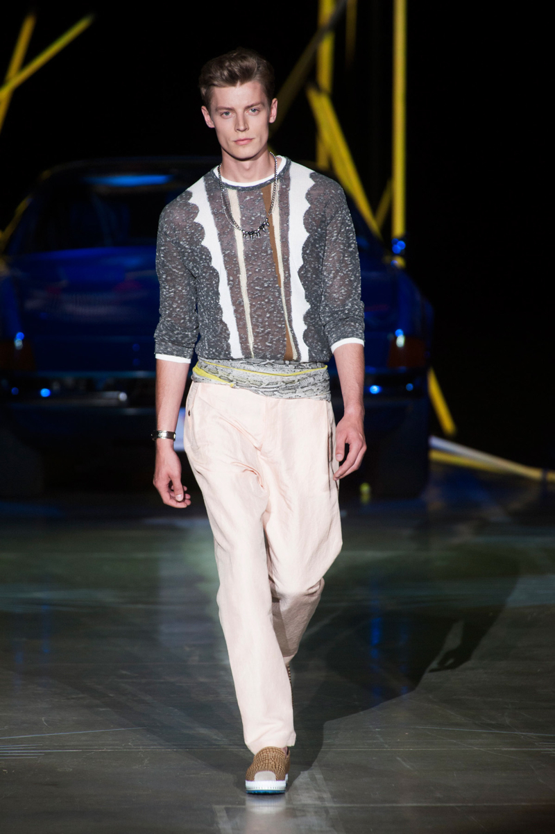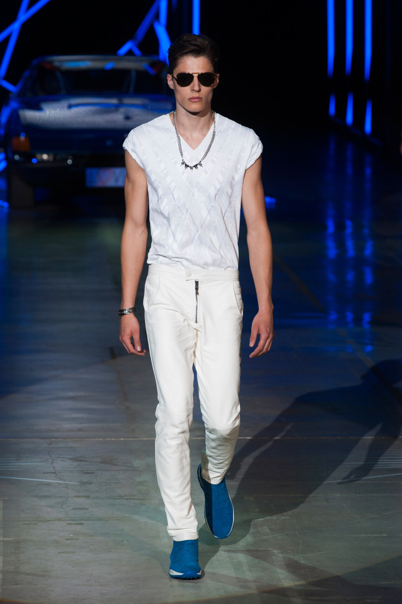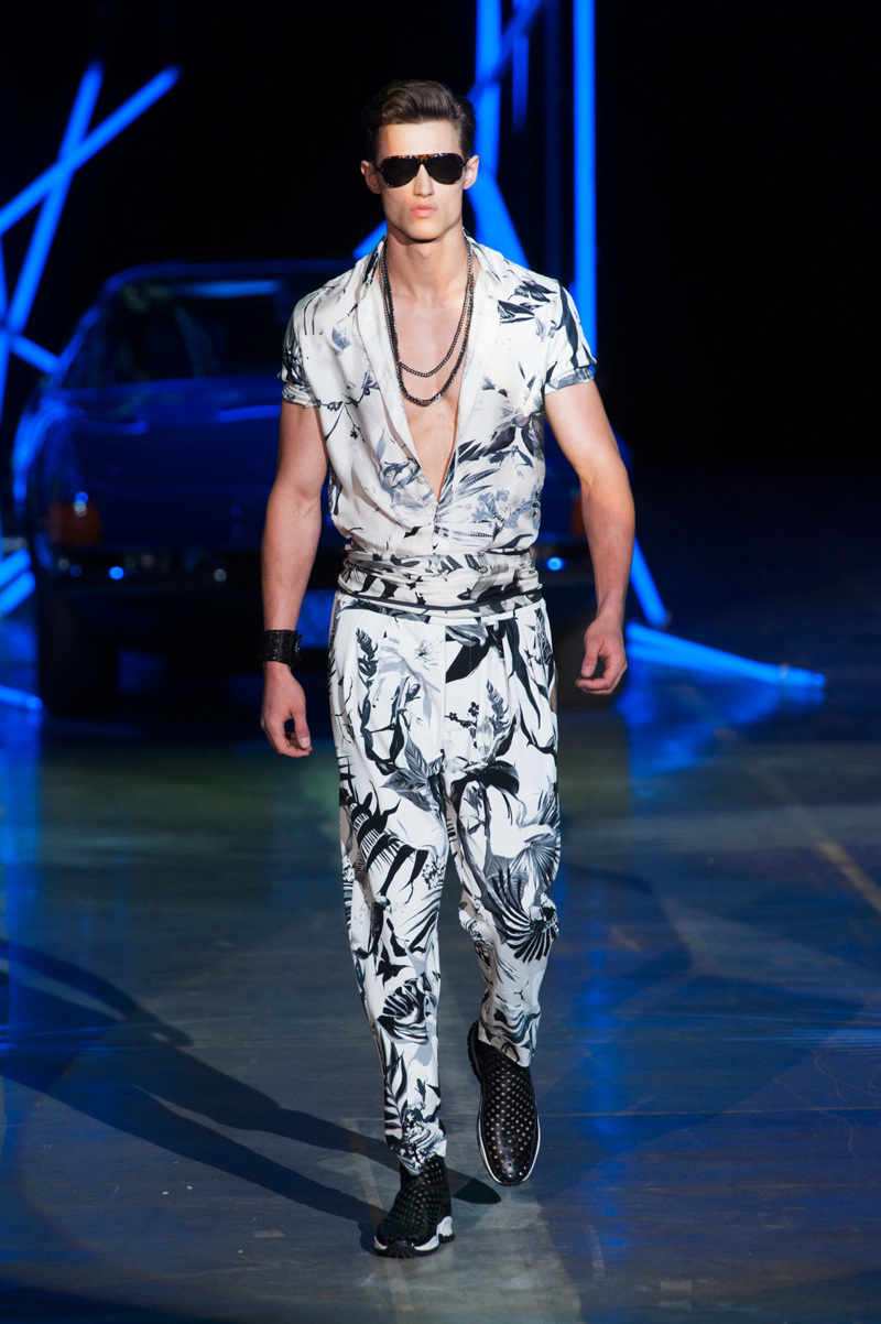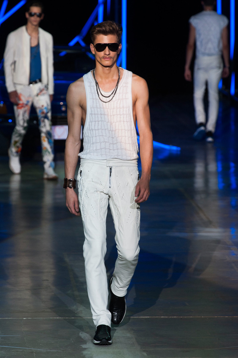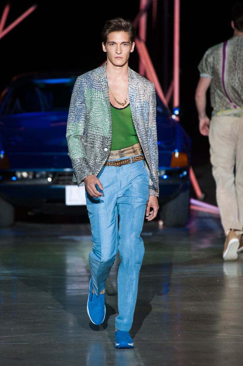 Designer Roberto Cavalli took fashion back to the 1970s for a rocking spring/summer 2015 collection. Inspired by the earlier music of Aerosmith, Cavalli got things off to a racy start, echoing the glamorous aesthetic of Miami Vice. Python prints and rich color hues dressed a brash wardrobe that left no essential untouched. From relaxed shirting and leather jackets to slim-cut pants, whether it was tropical in nature or electrifying in color, Cavalli made each piece a statement. In particular, leather was a standout for the collection with a luxe selection that included a bright green pair of pants.