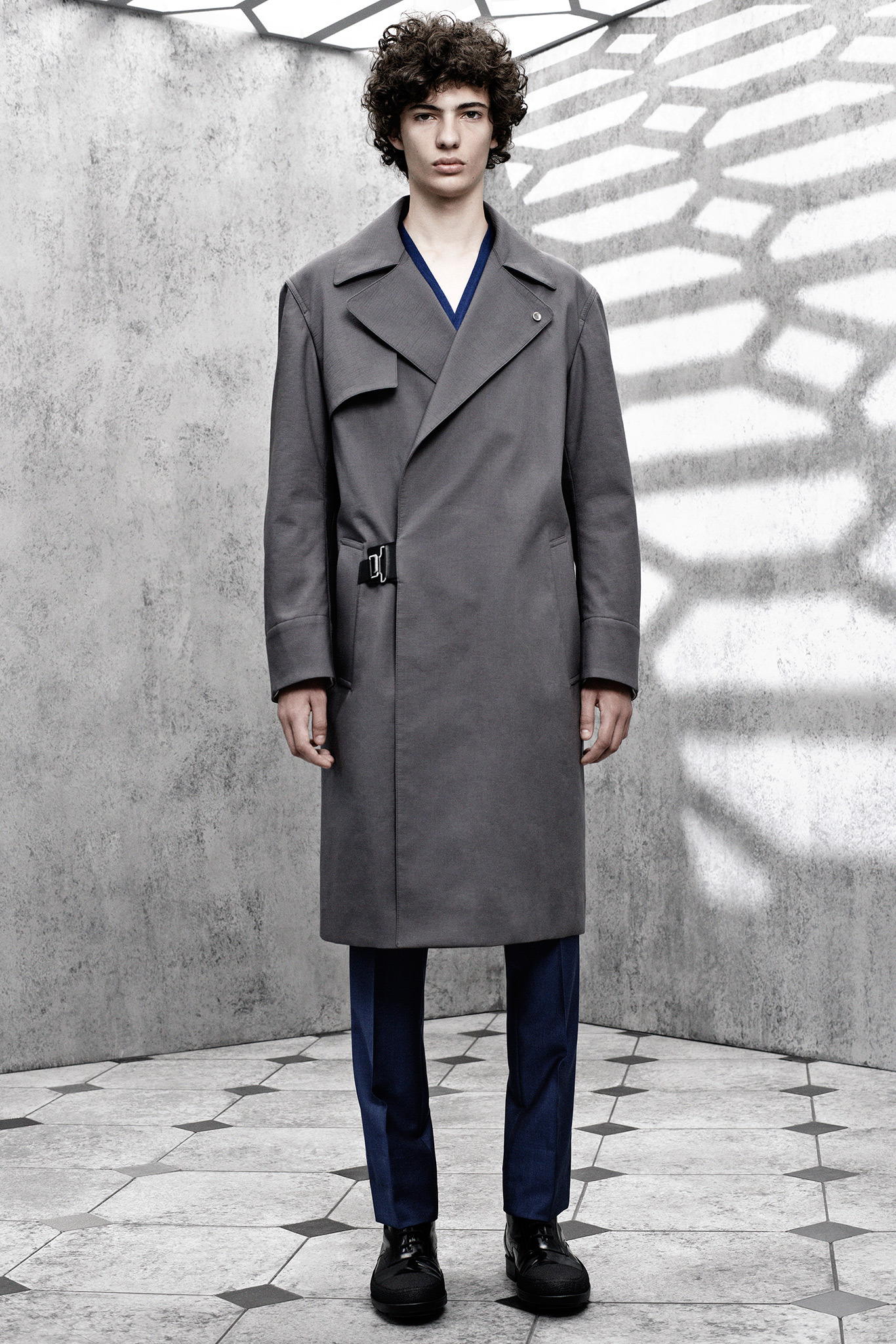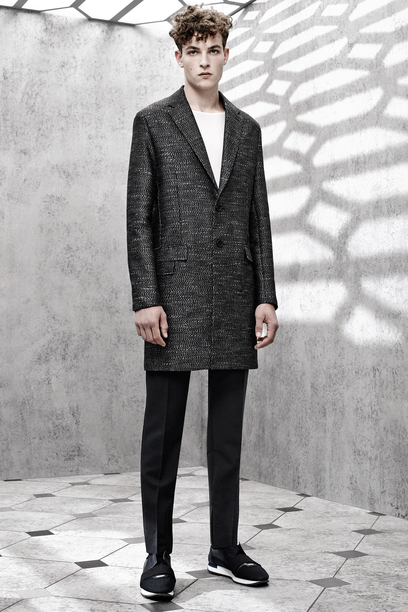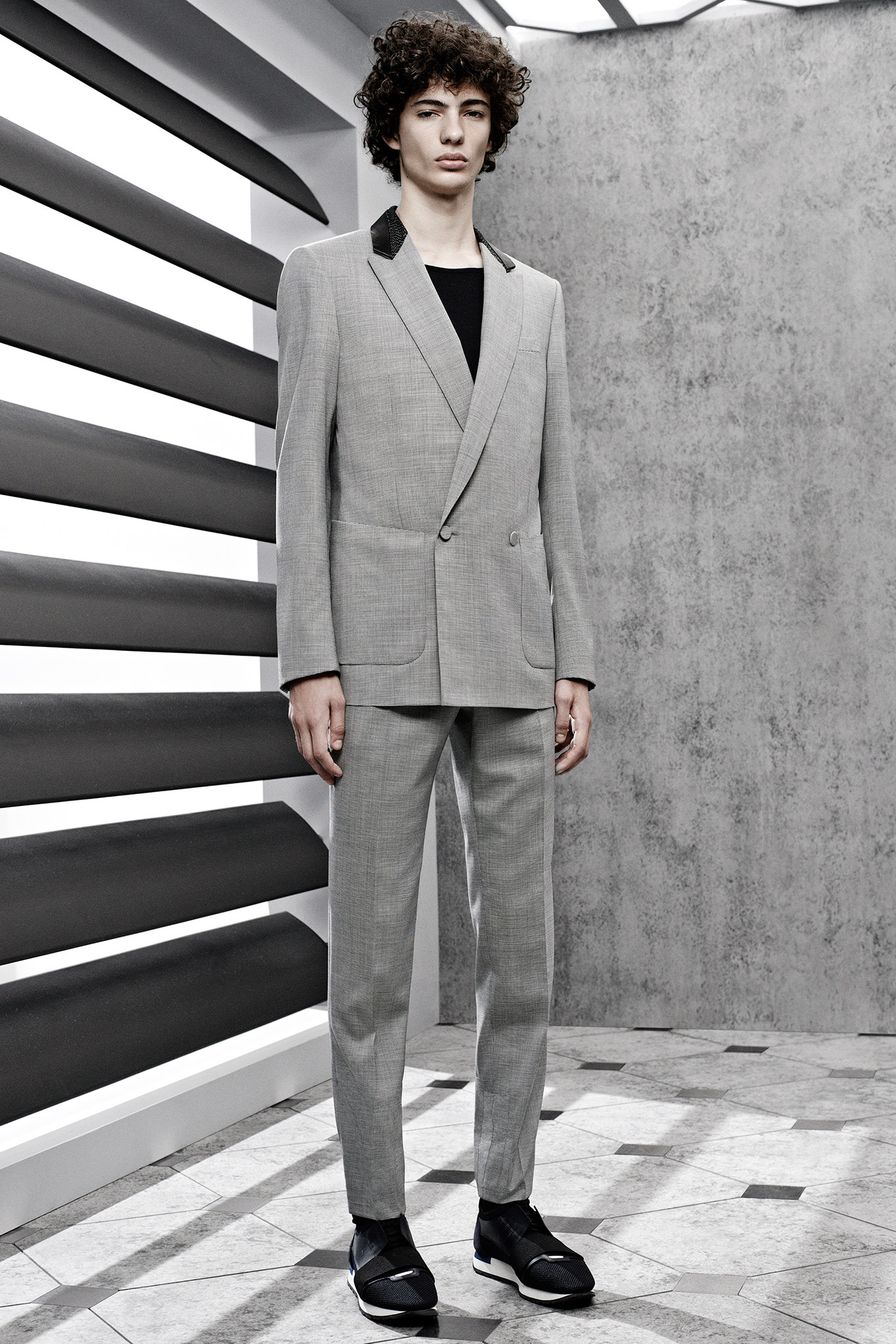 The latest collection from Balenciaga is sharp, concise and to the point. Featuring an understated color palette of black, gray and blue hues, the collection is minimal on the details, highlighting menswear classics like the trench with a concealed closure and a small collar. The same quiet philosophy translates into short-sleeve knits built on structure as well as longer jackets. Adding leather to the mix, the shape is more relaxed for a double-breasted jacket with matching shorts. The heart of the collection, the utilization of luxe fabrics to reinterpret items as simple as the long-sleeve tee and henley are an achievement.