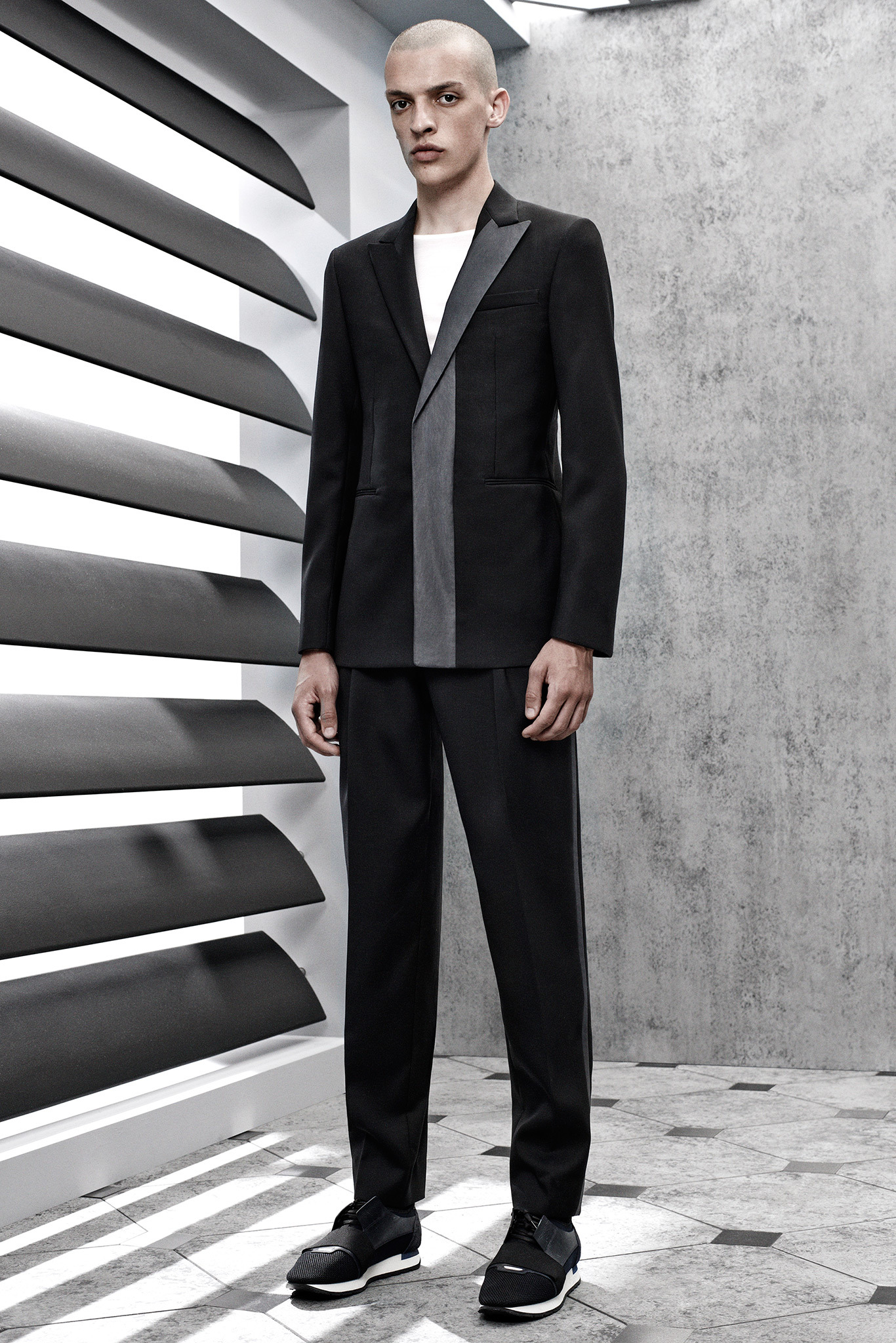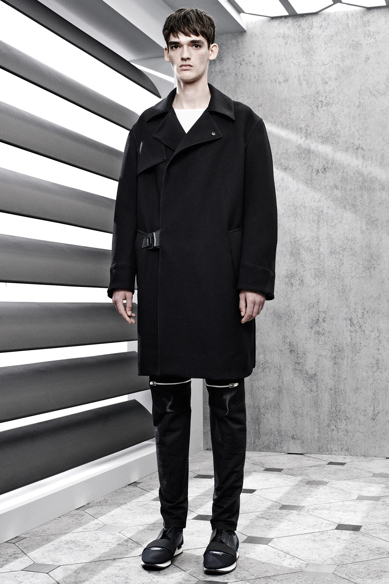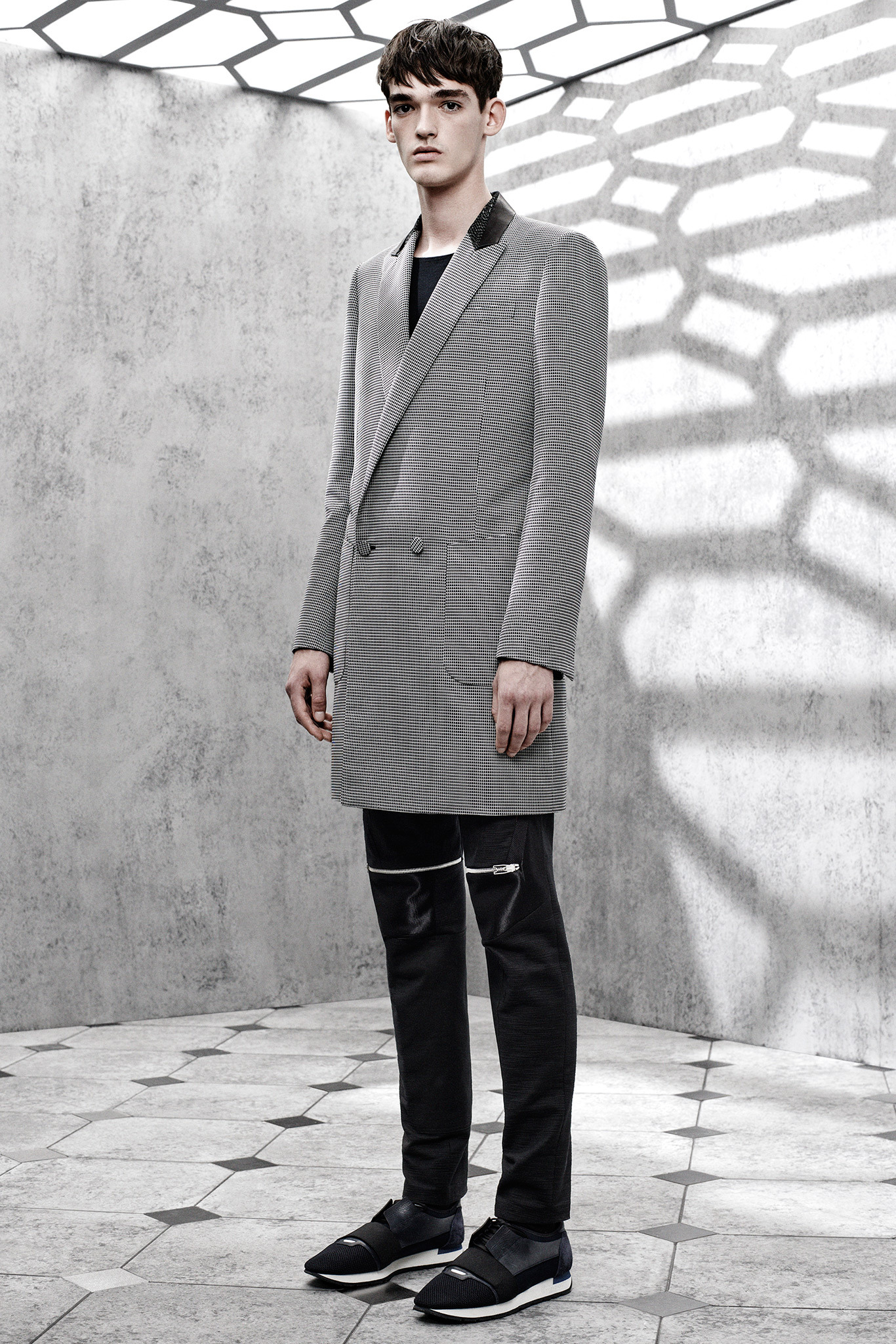 The latest collection from Balenciaga is sharp, concise and to the point. Featuring an understated color palette of black, gray and blue hues, the collection is minimal on the details, highlighting menswear classics like the trench with a concealed closure and a small collar. The same quiet philosophy translates into short-sleeve knits built on structure as well as longer jackets. Adding leather to the mix, the shape is more relaxed for a double-breasted jacket with matching shorts. The heart of the collection, the utilization of luxe fabrics to reinterpret items as simple as the long-sleeve tee and henley are an achievement.